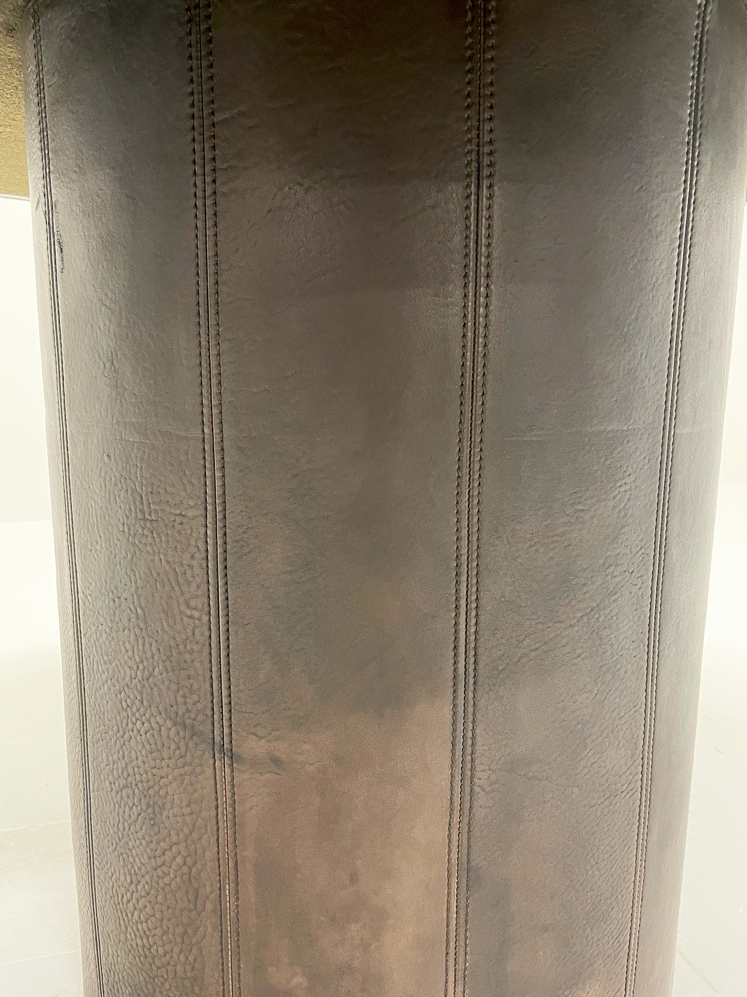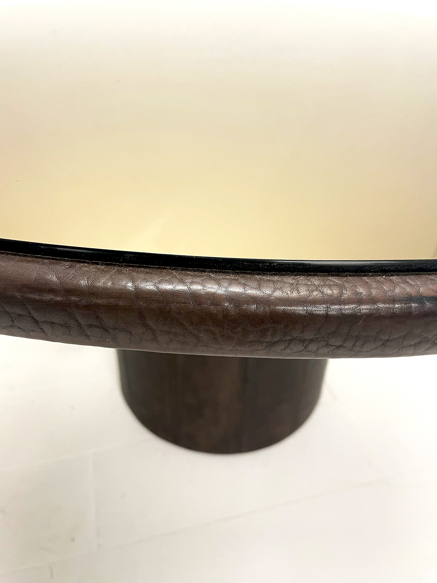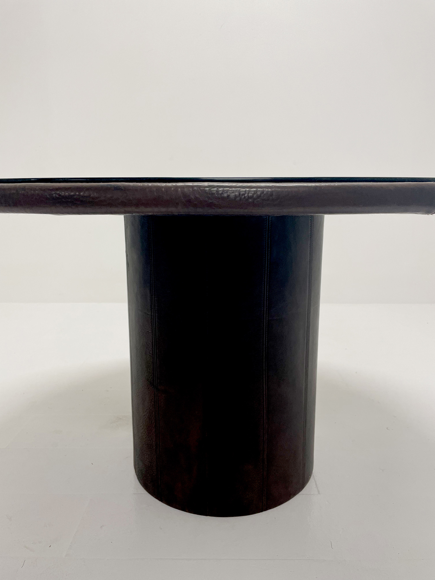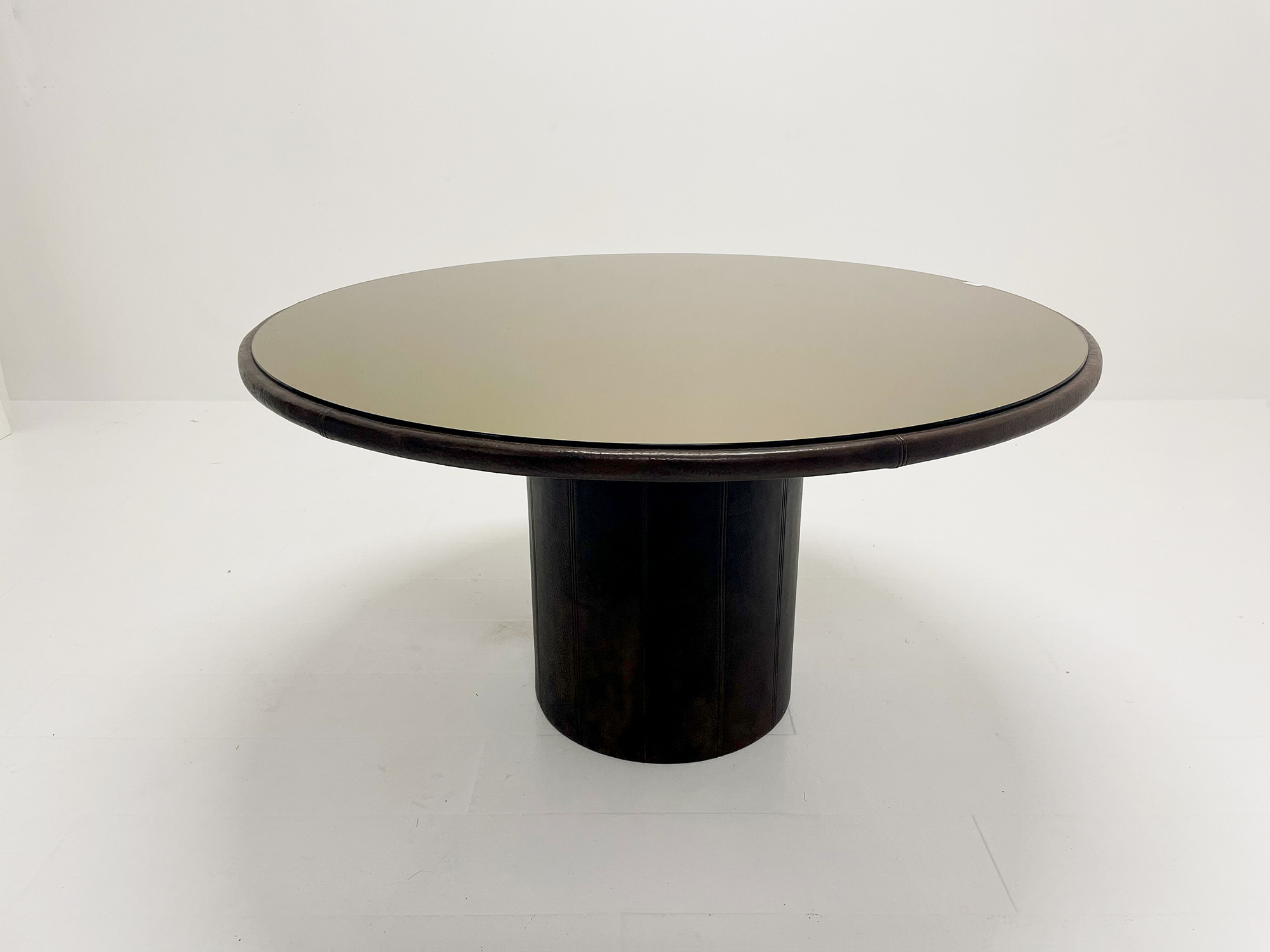 Tavolo in vetro e pelle. Produzione DE SEDE. Anni '70. Mis. Alt. cm. 72 Diam. cm. 130 ca.