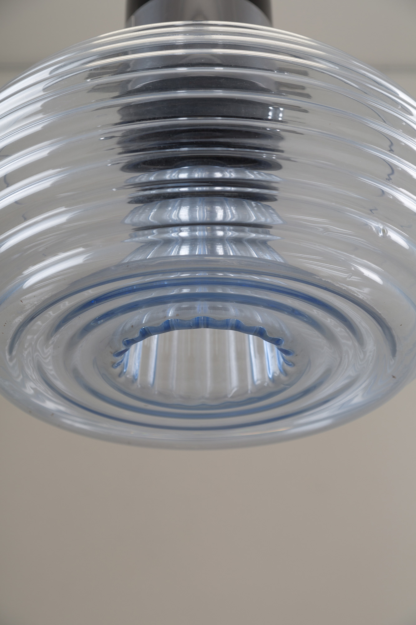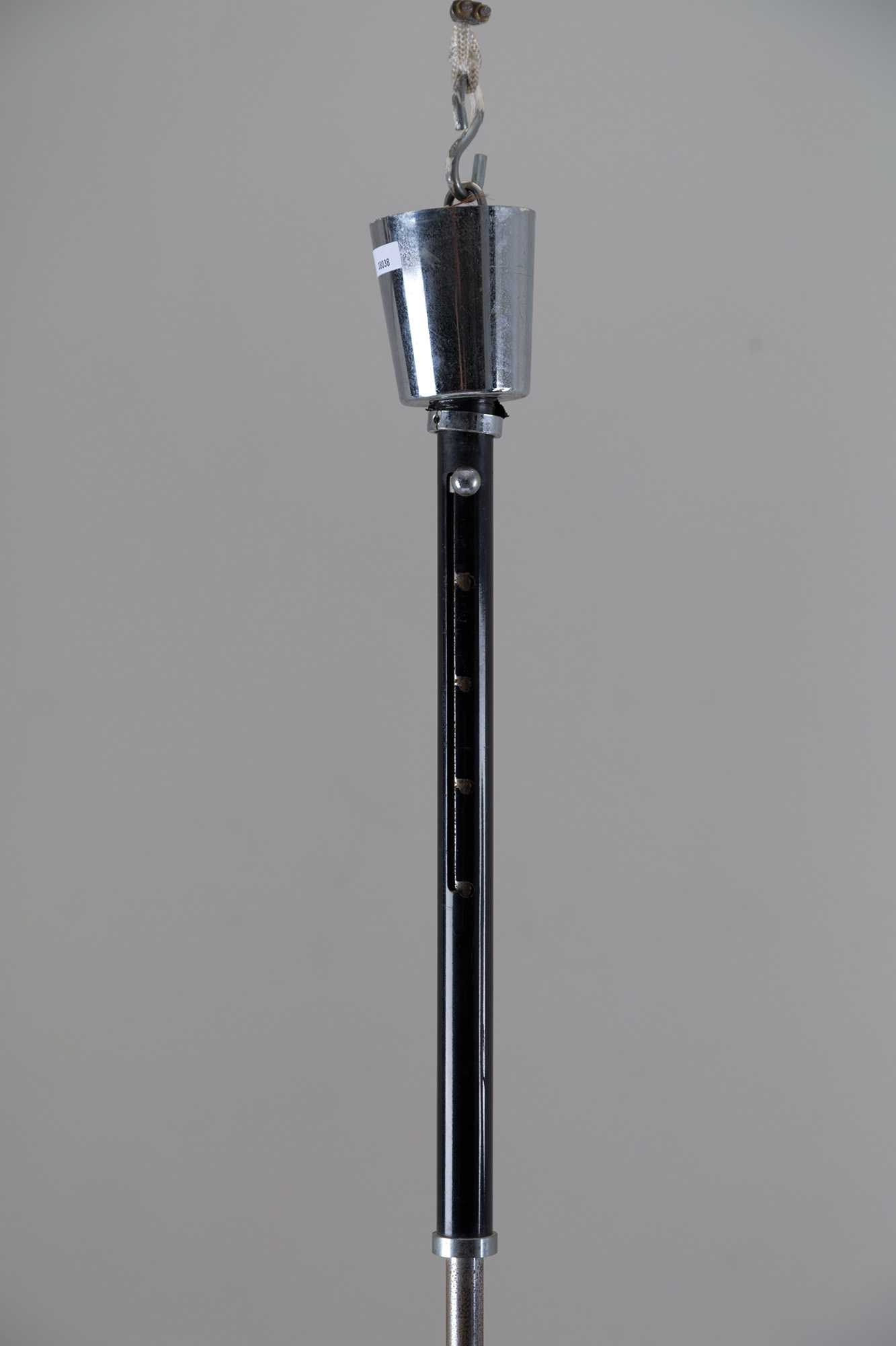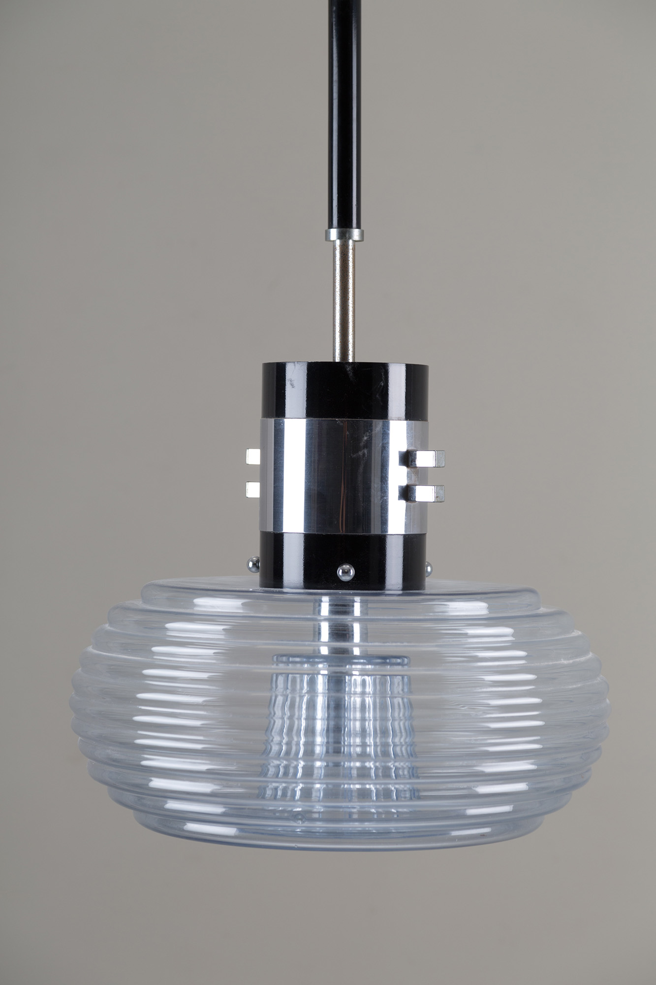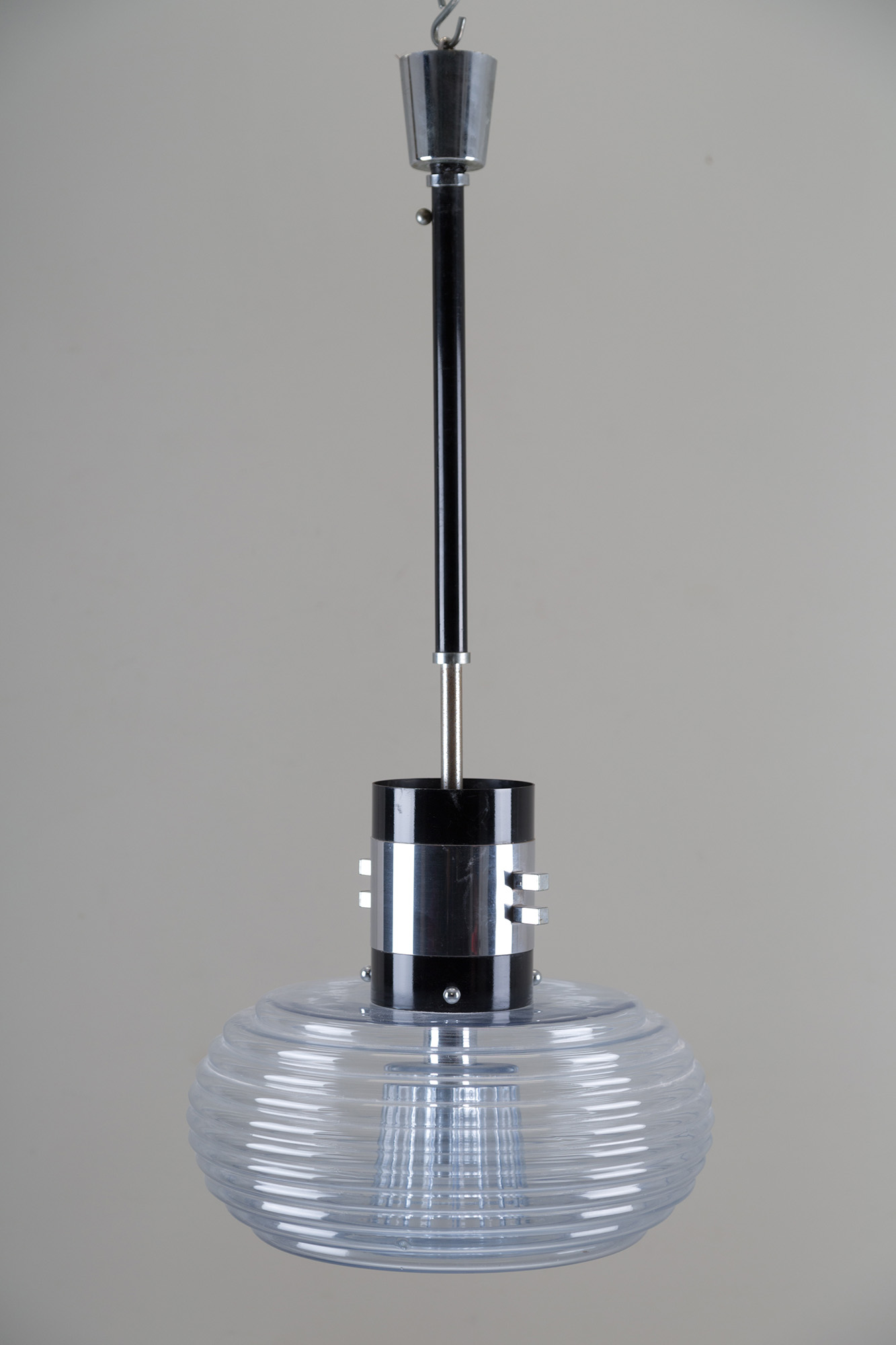 Lampadario in vetro, metallo cromato e smaltato regolabile in altezza. Manifattura italiana. Anni '60. Mis. Alt. cm. 130 Diam. cm. 50 ca.