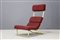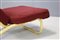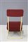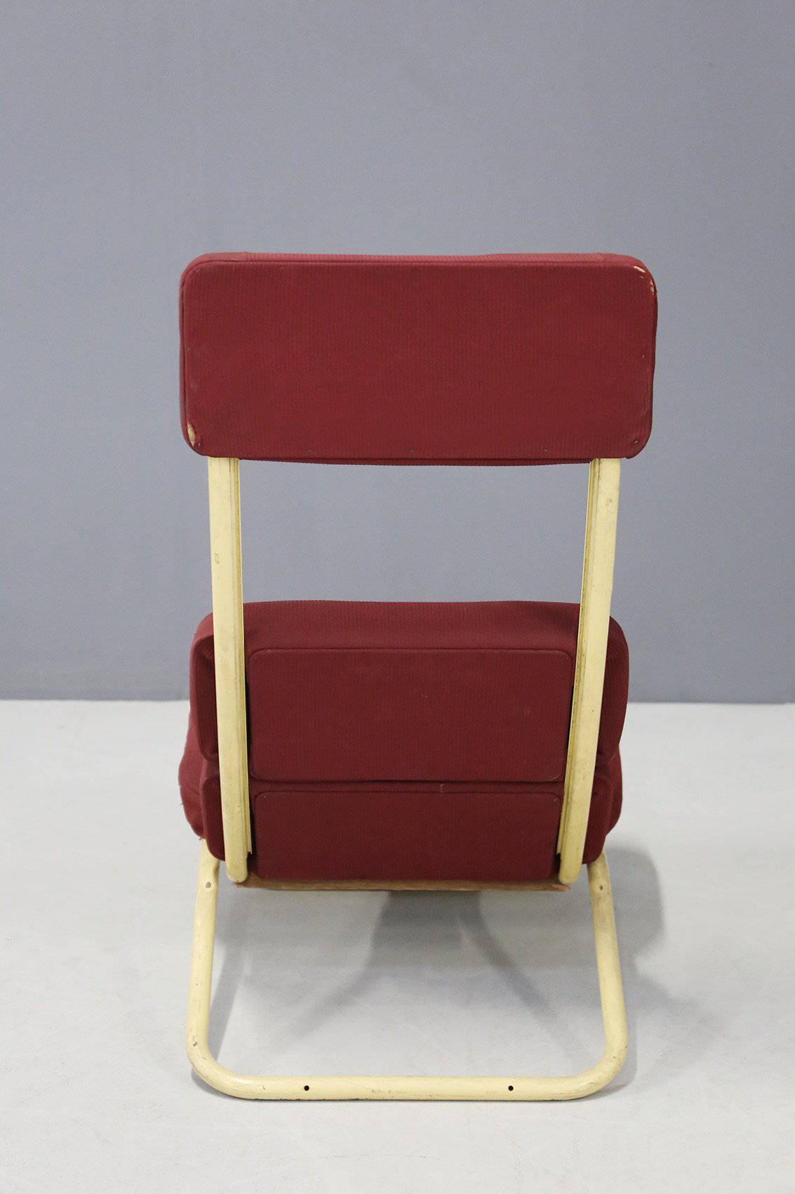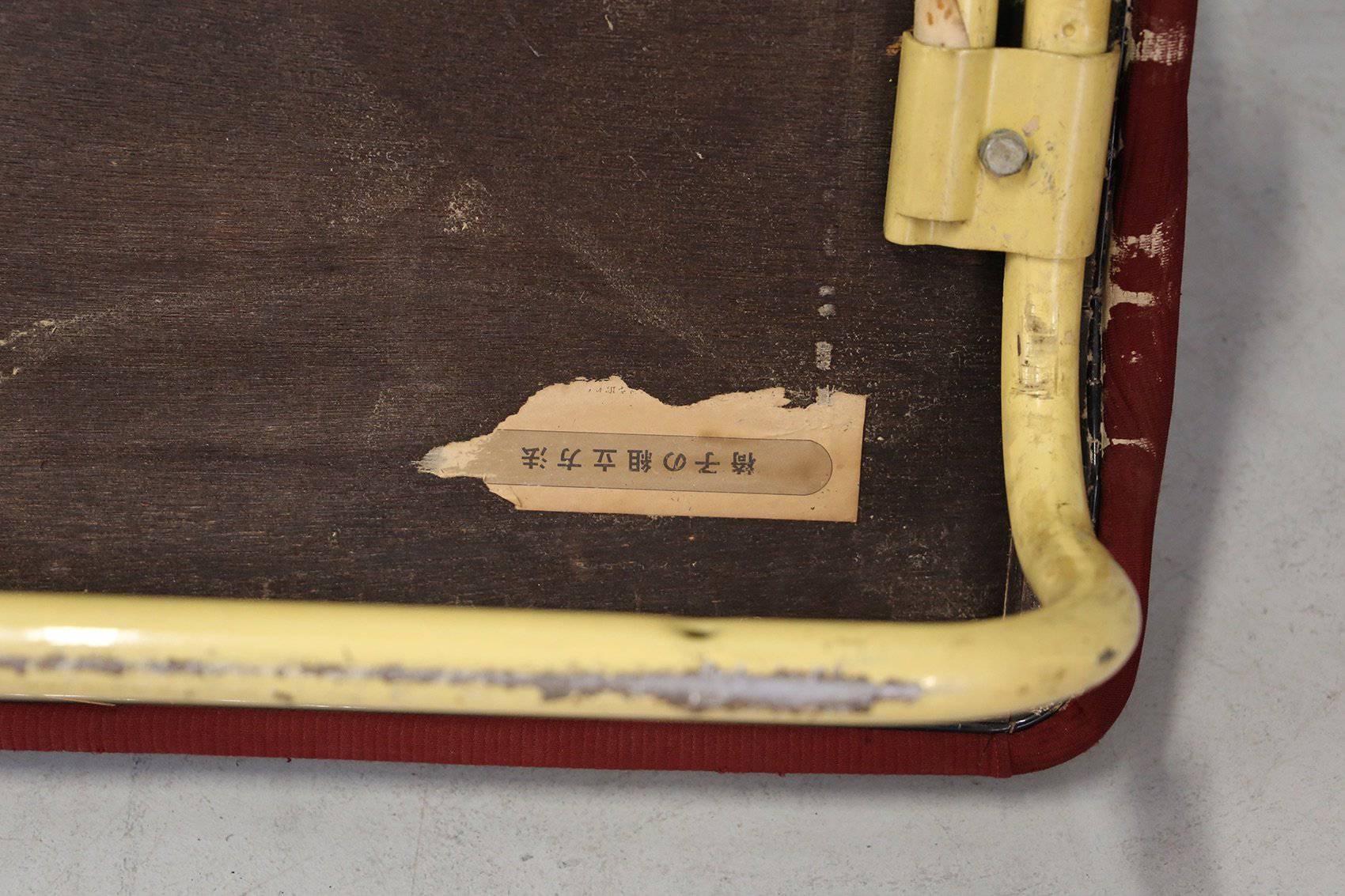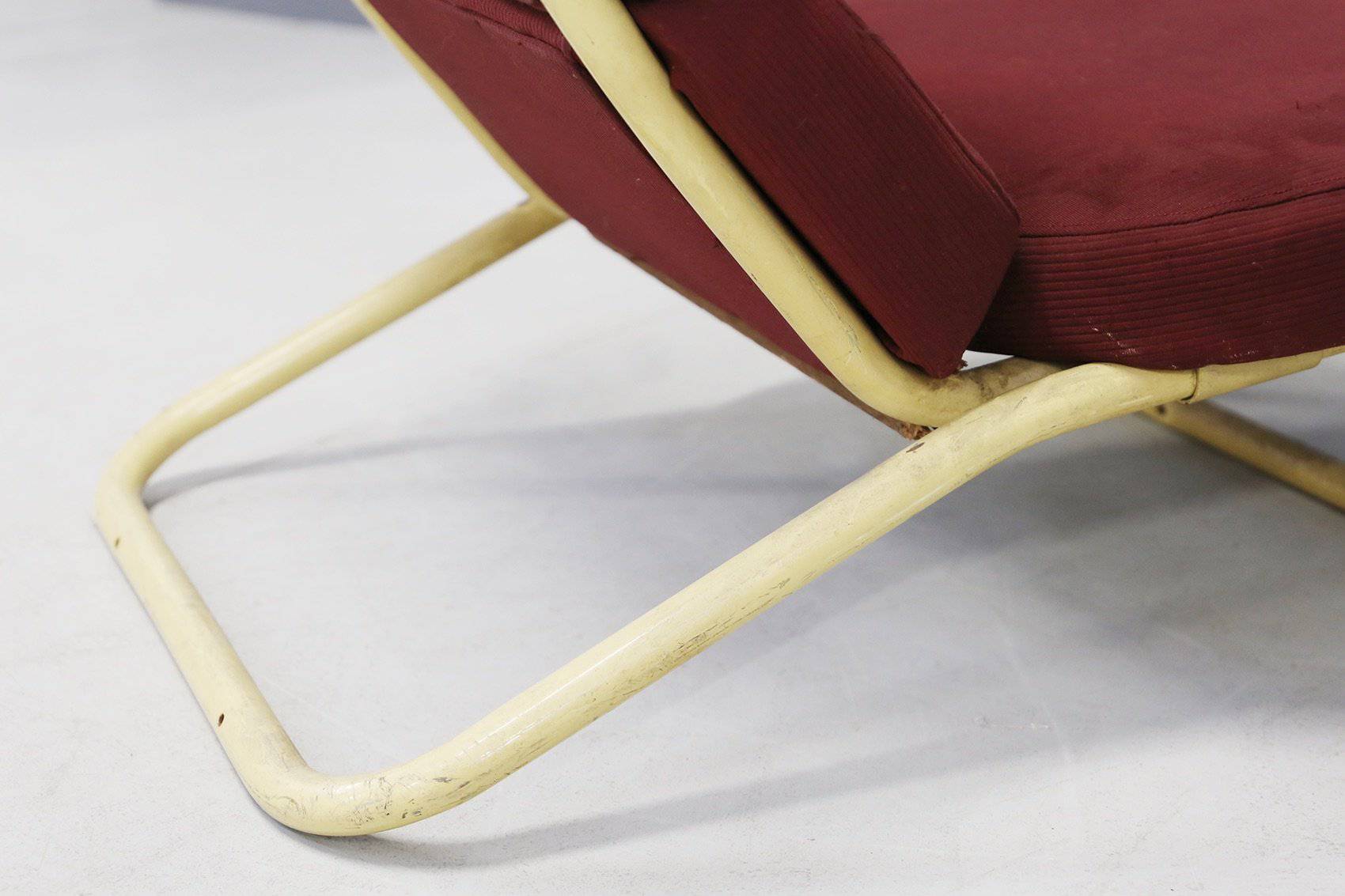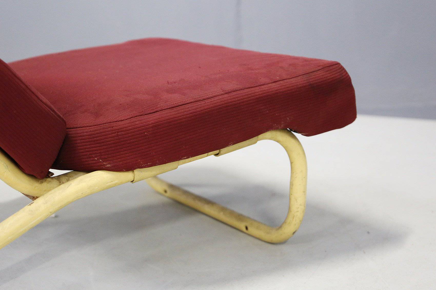 Poltrona giapponese in metallo tubolare giallo e cuscini sfoderabili in tessuto originale rosso mattone. Con etichetta in caratteri giapponesi sotto la seduta. Anni '50. Difetti. Mis. Lung. cm. 58 Alt. cm. 103 Prof. cm. 95 ca.