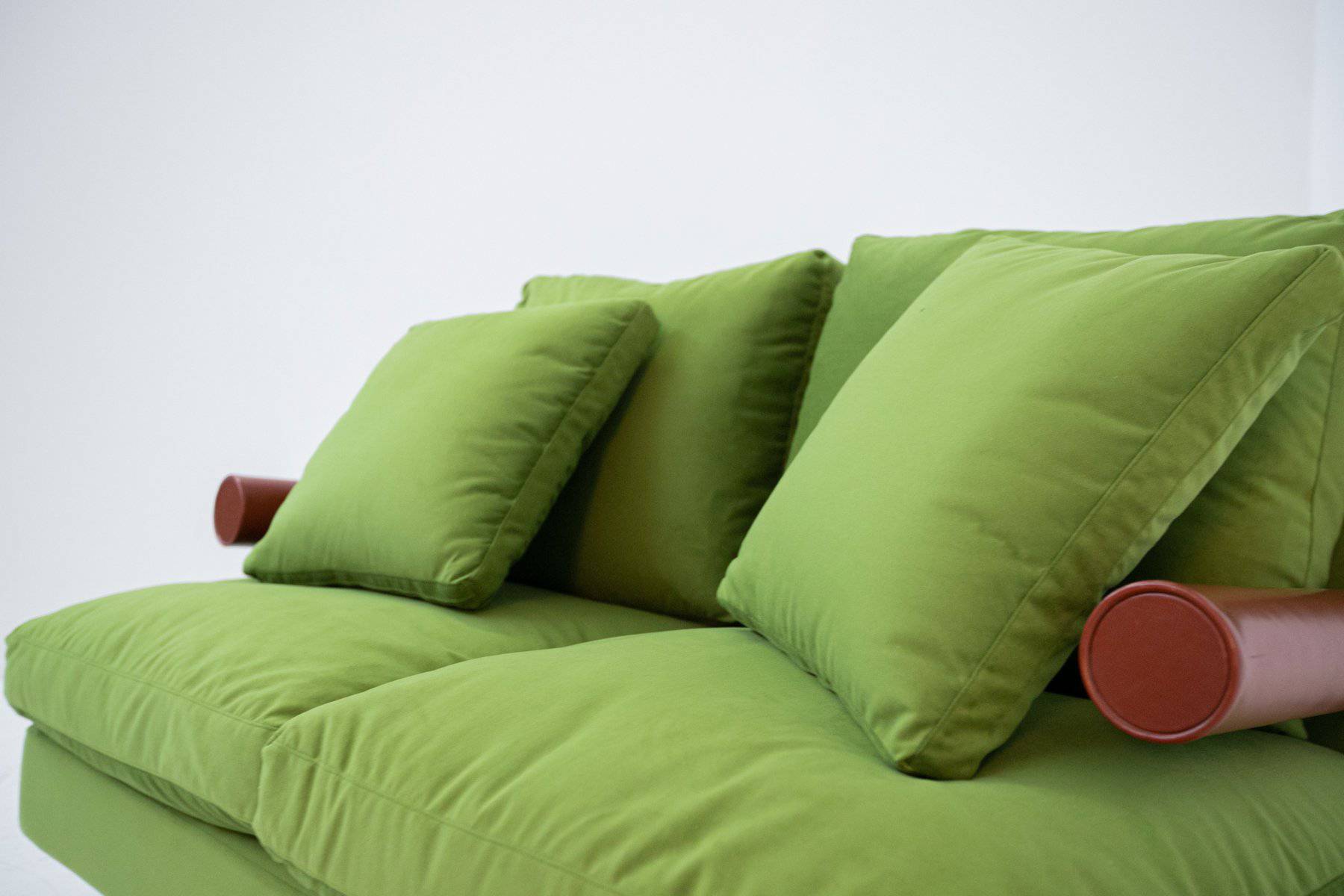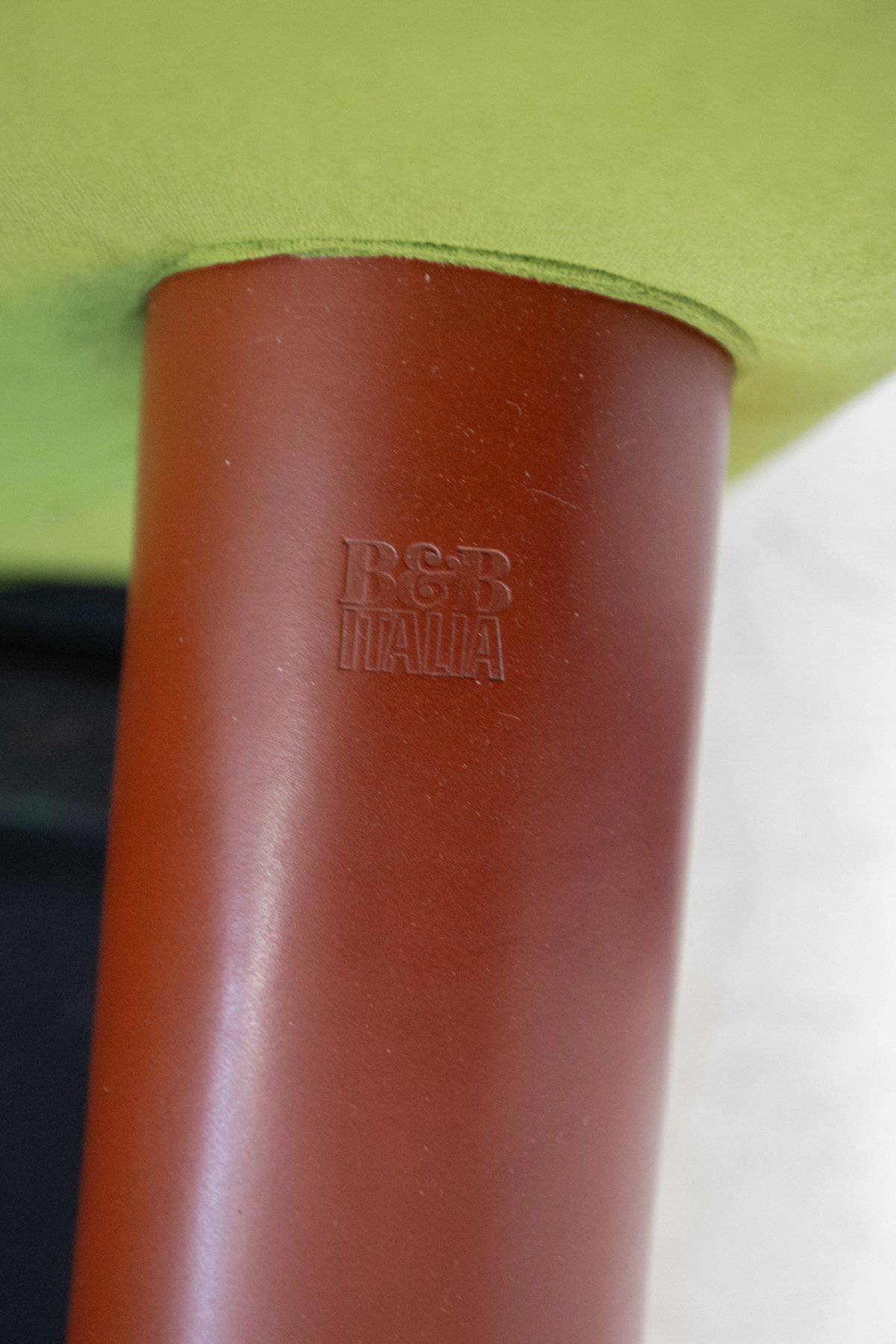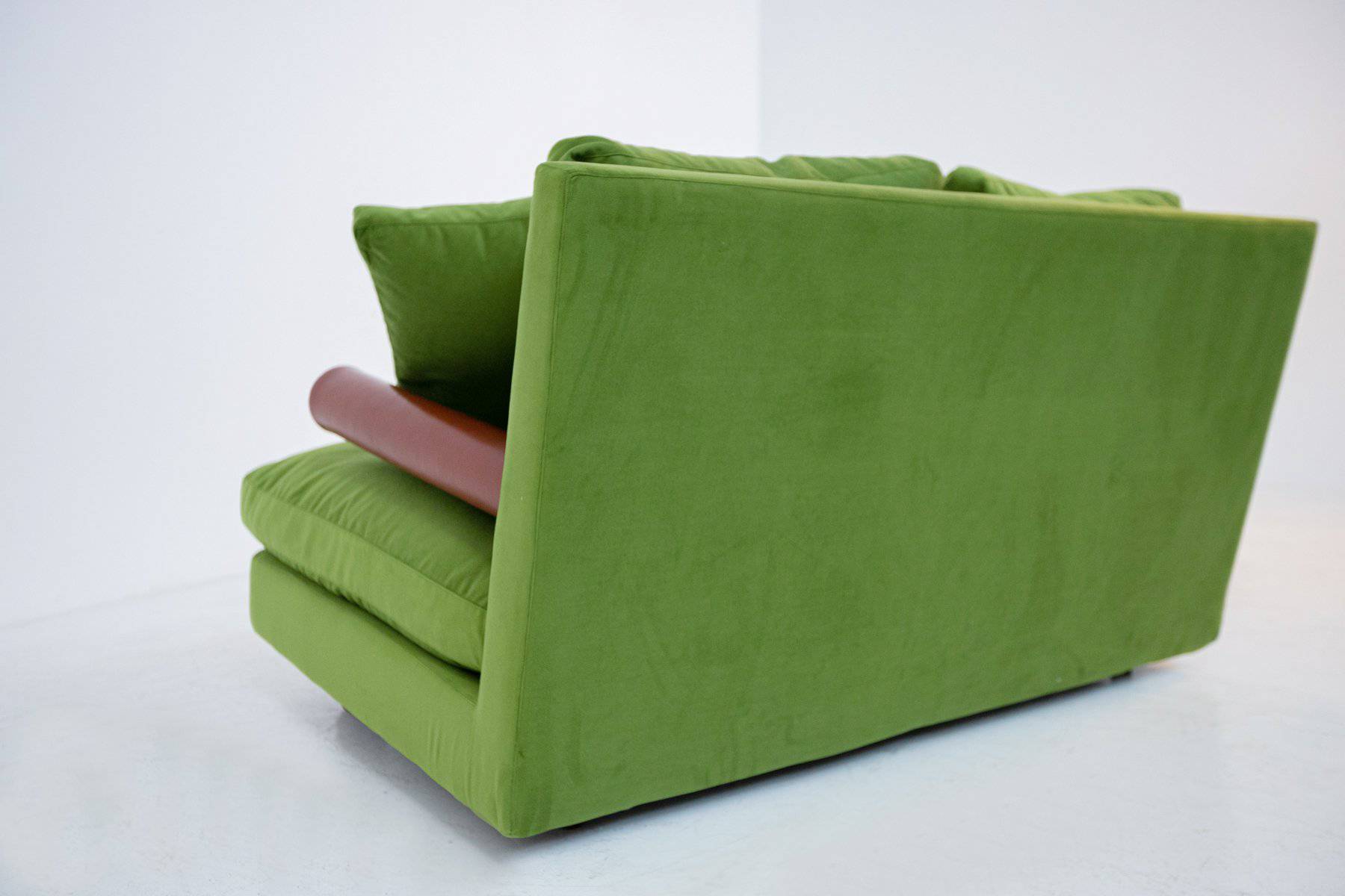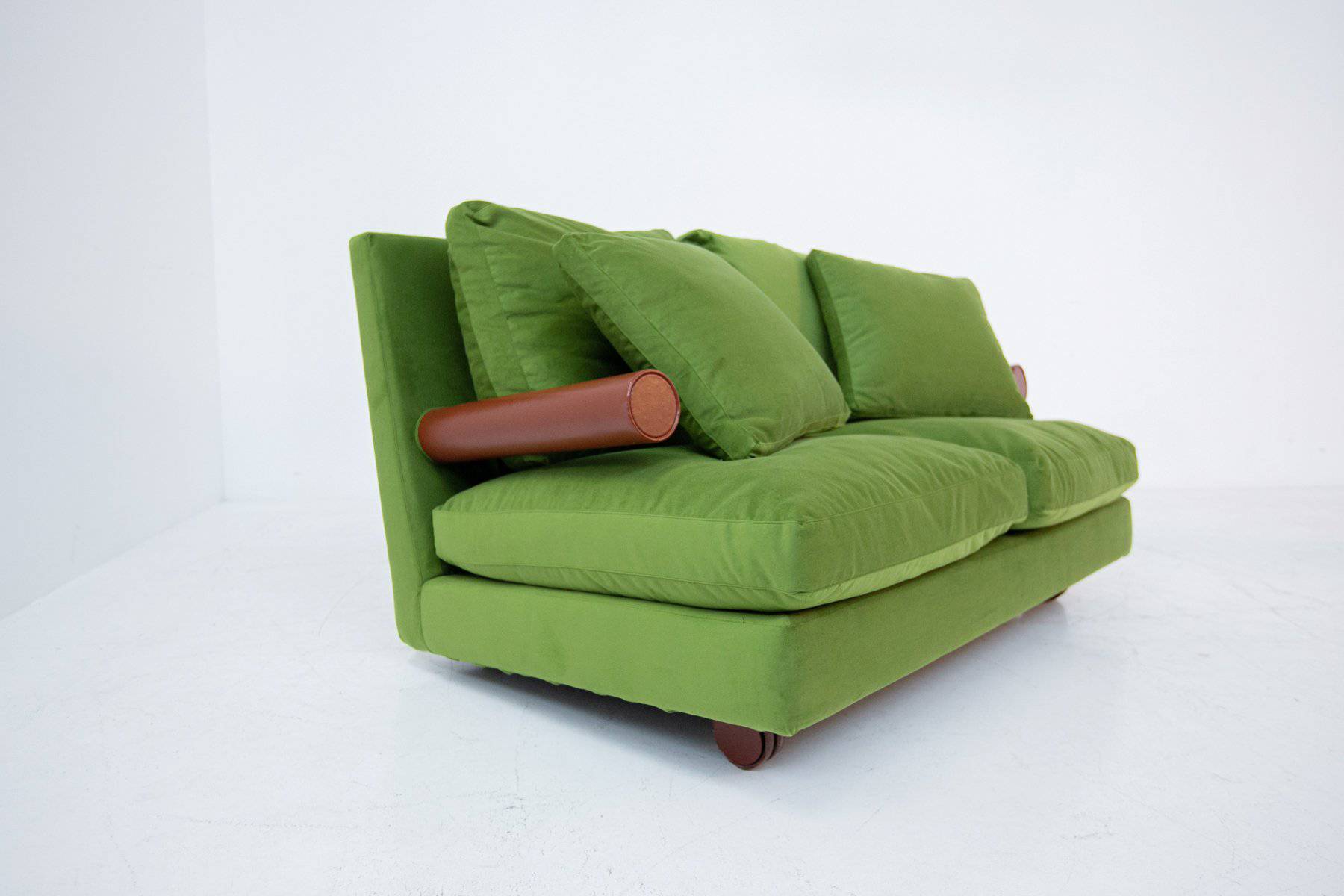 ANTONIO CITTERIO (Meda, 1950) per B&B Italia. Divano a due posti modello Baisity in legno, velluto verde e braccioli in pelle di forma tubolare. 1986. Modello vincitore del Compasso d'Oro nel 1987. Mis. Lung. cm. 150 Alt. cm. 81 Prof. cm. 100 ca.