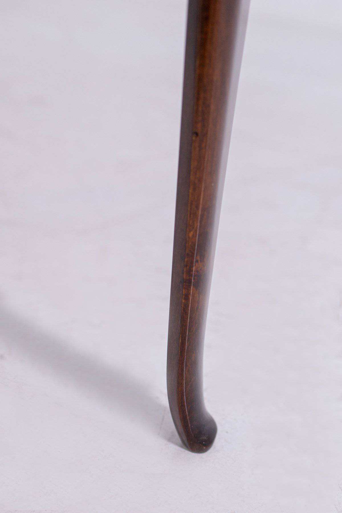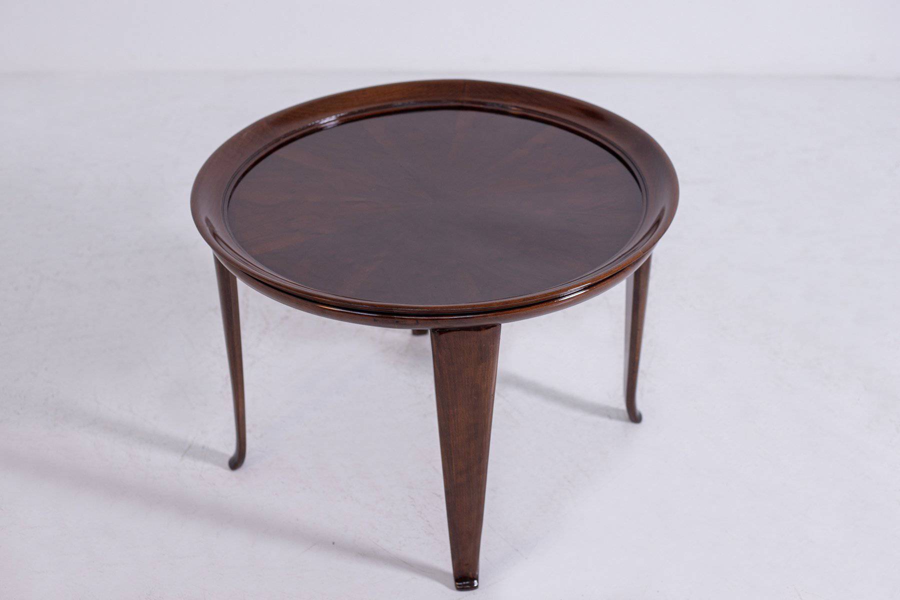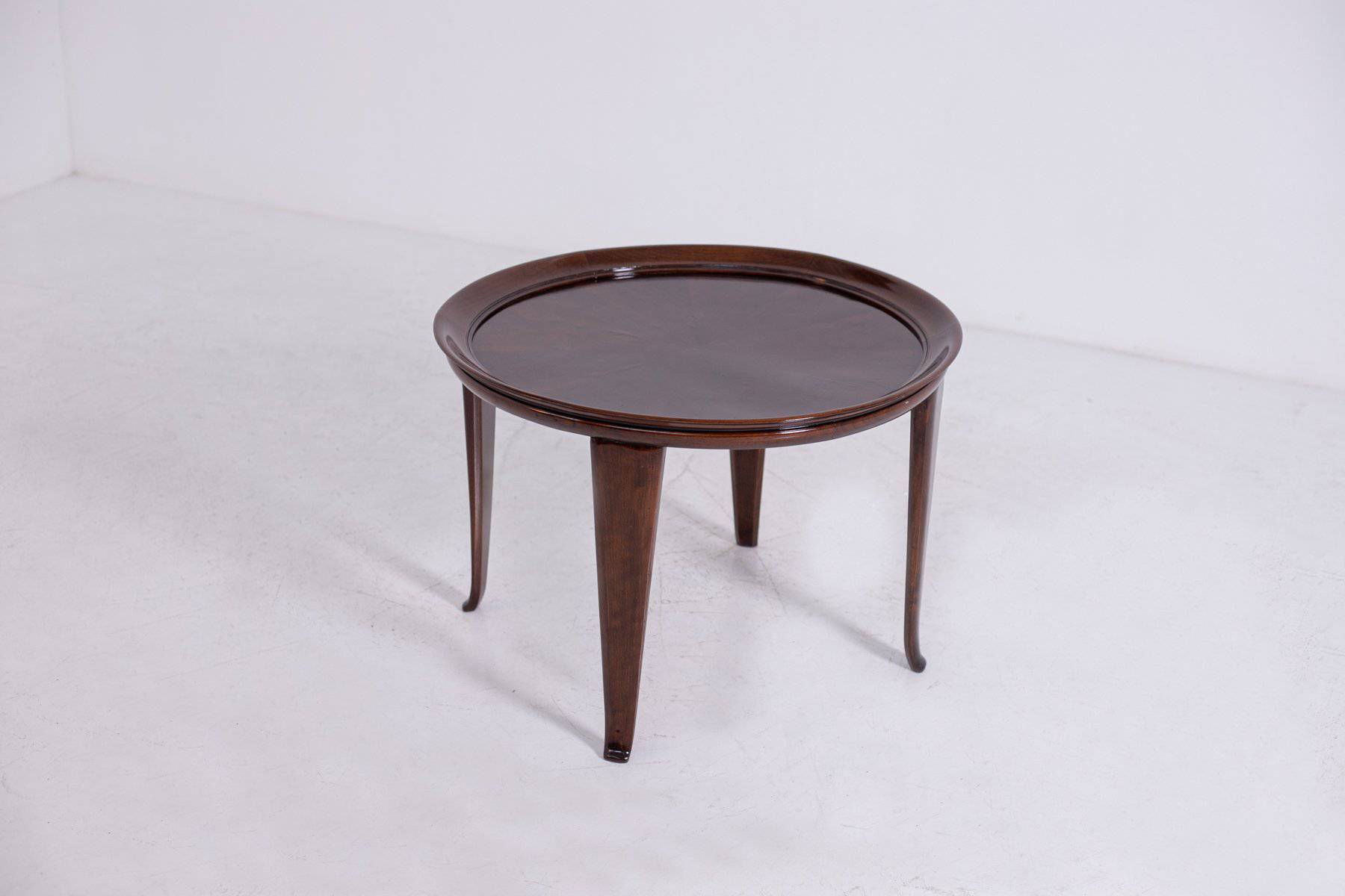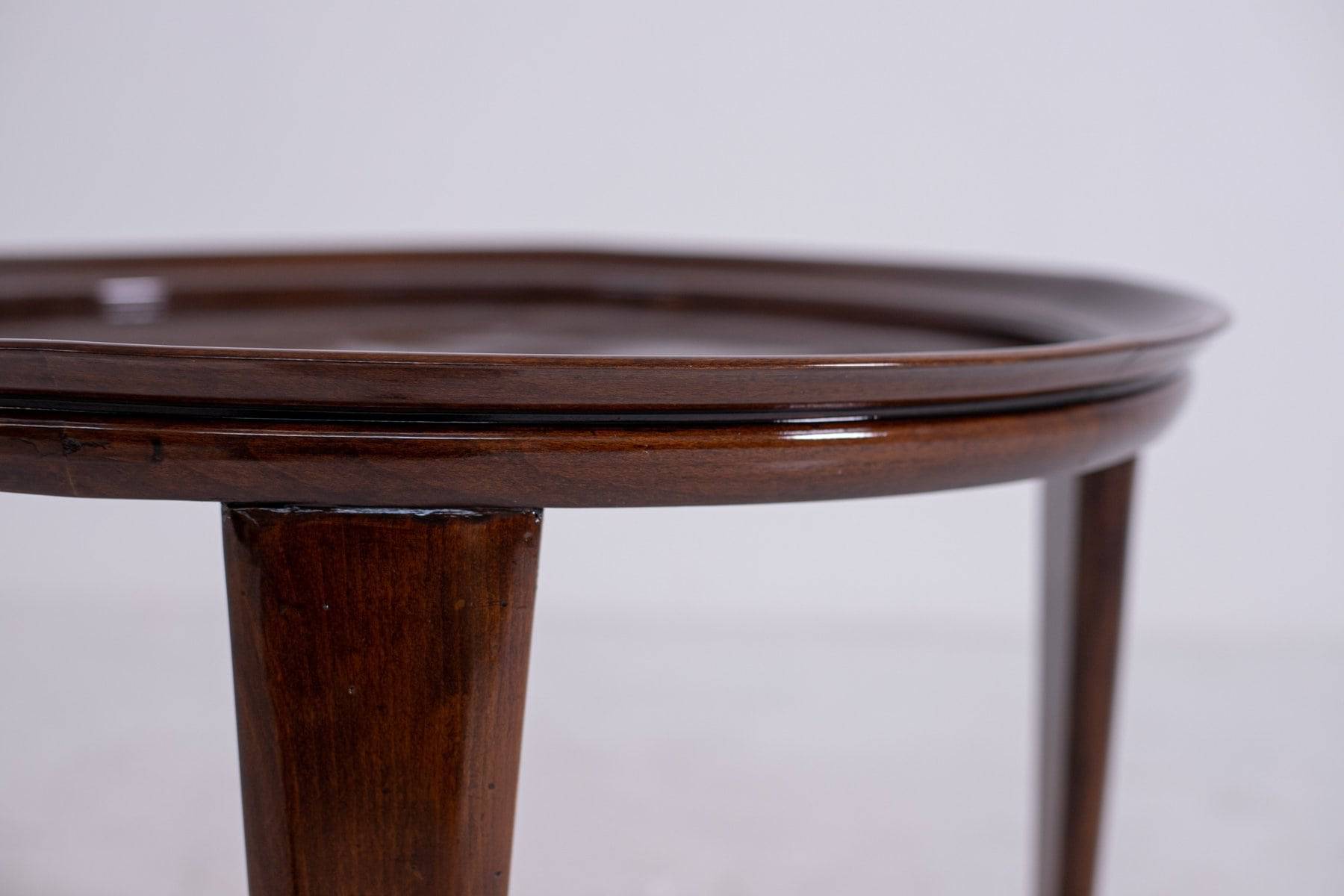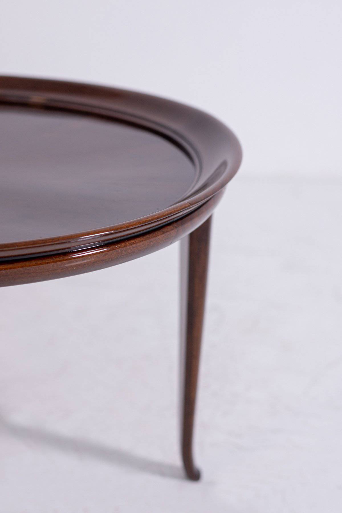 Elegante tavolino in legno di noce con piano circolare con bordo rialzato. Anni '50. Restaurato. Mis. Alt. cm. 49 Diam. cm. 68 ca.