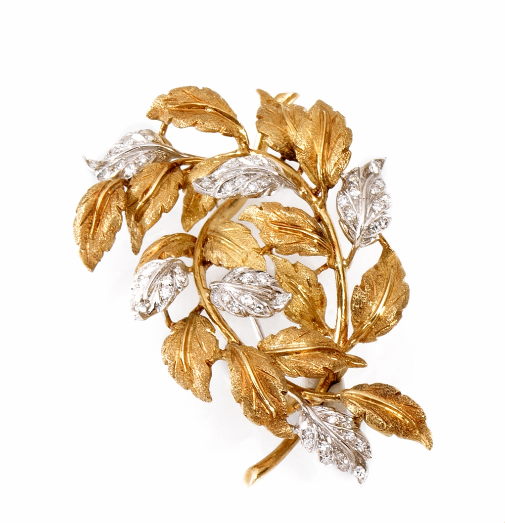 Spilla in oro giallo, oro bianco e diamantimodellata come un tralcio di...