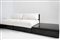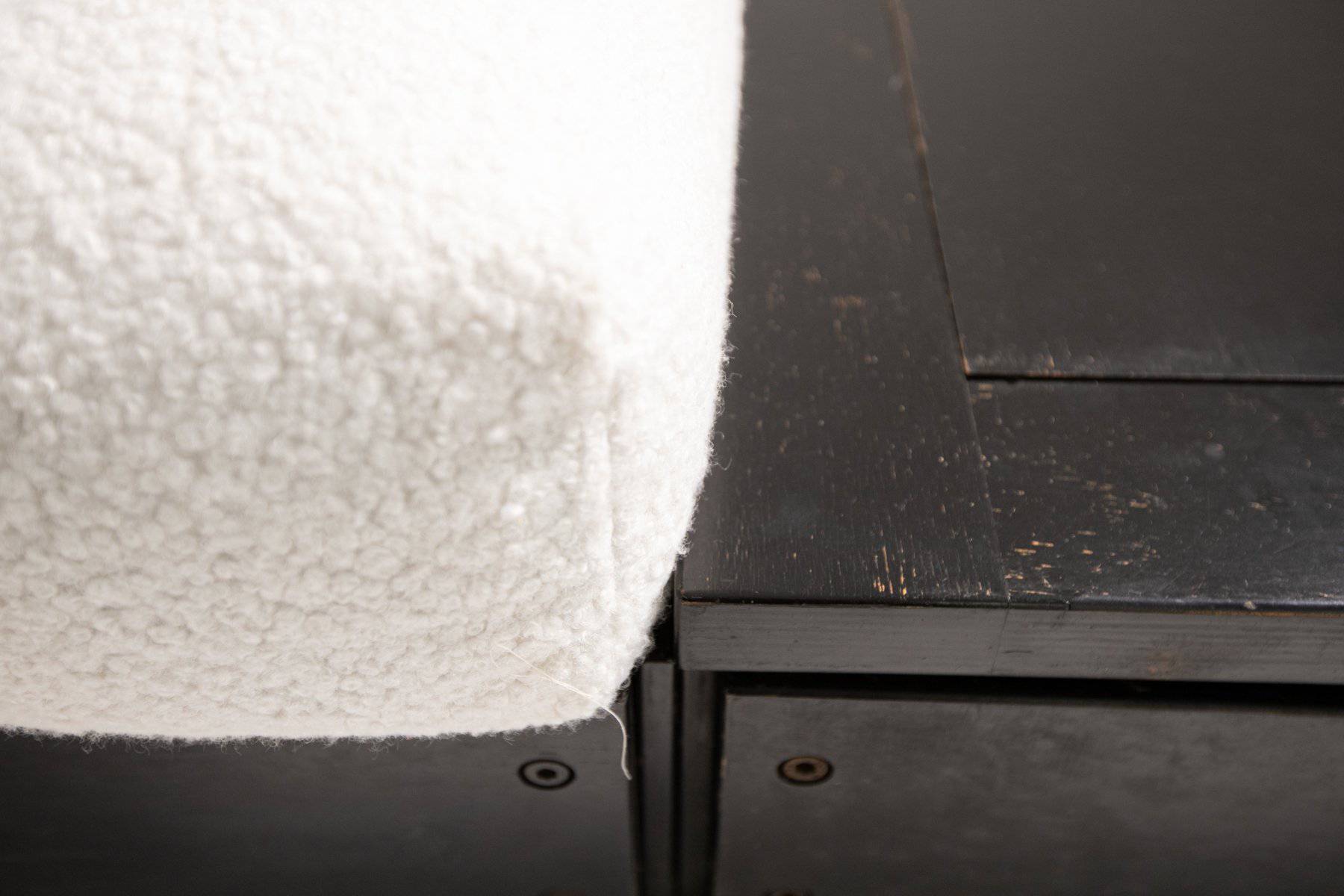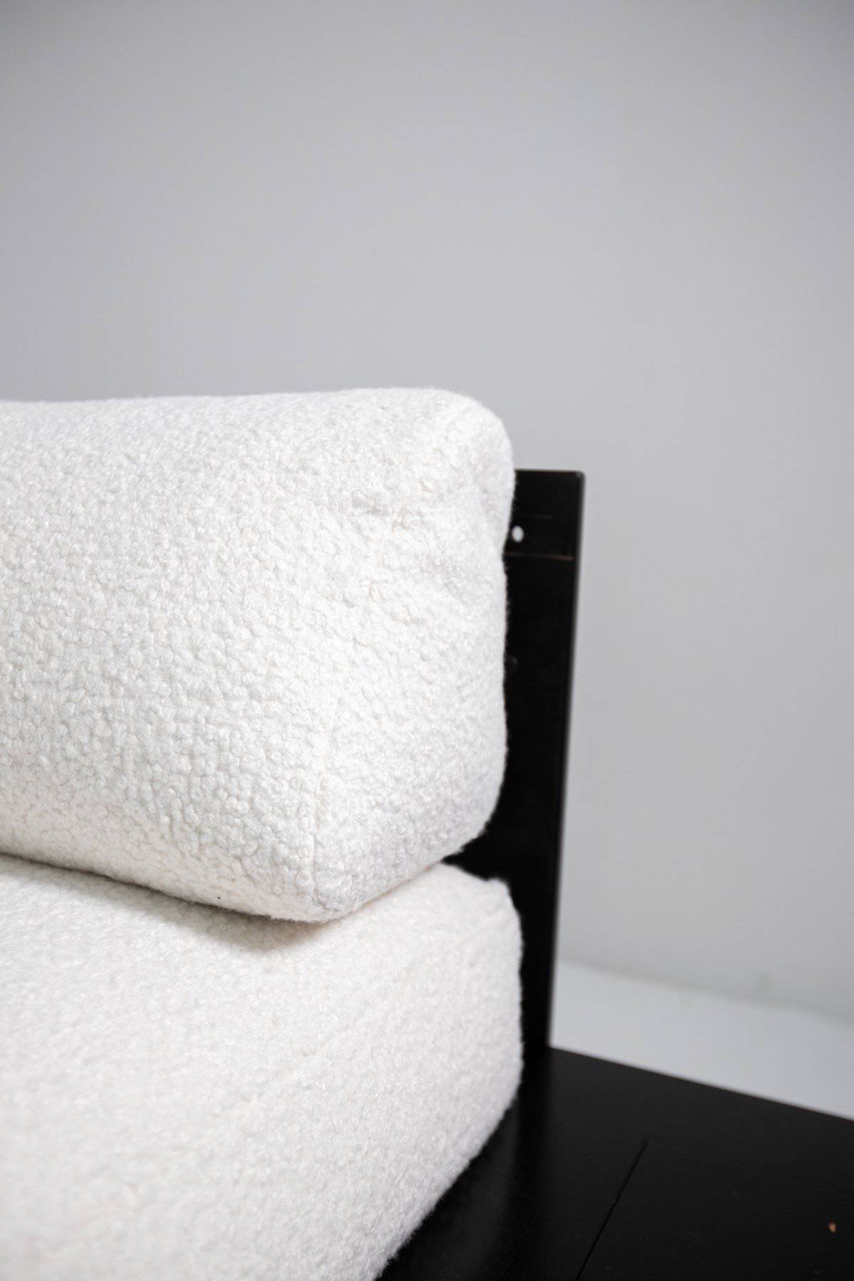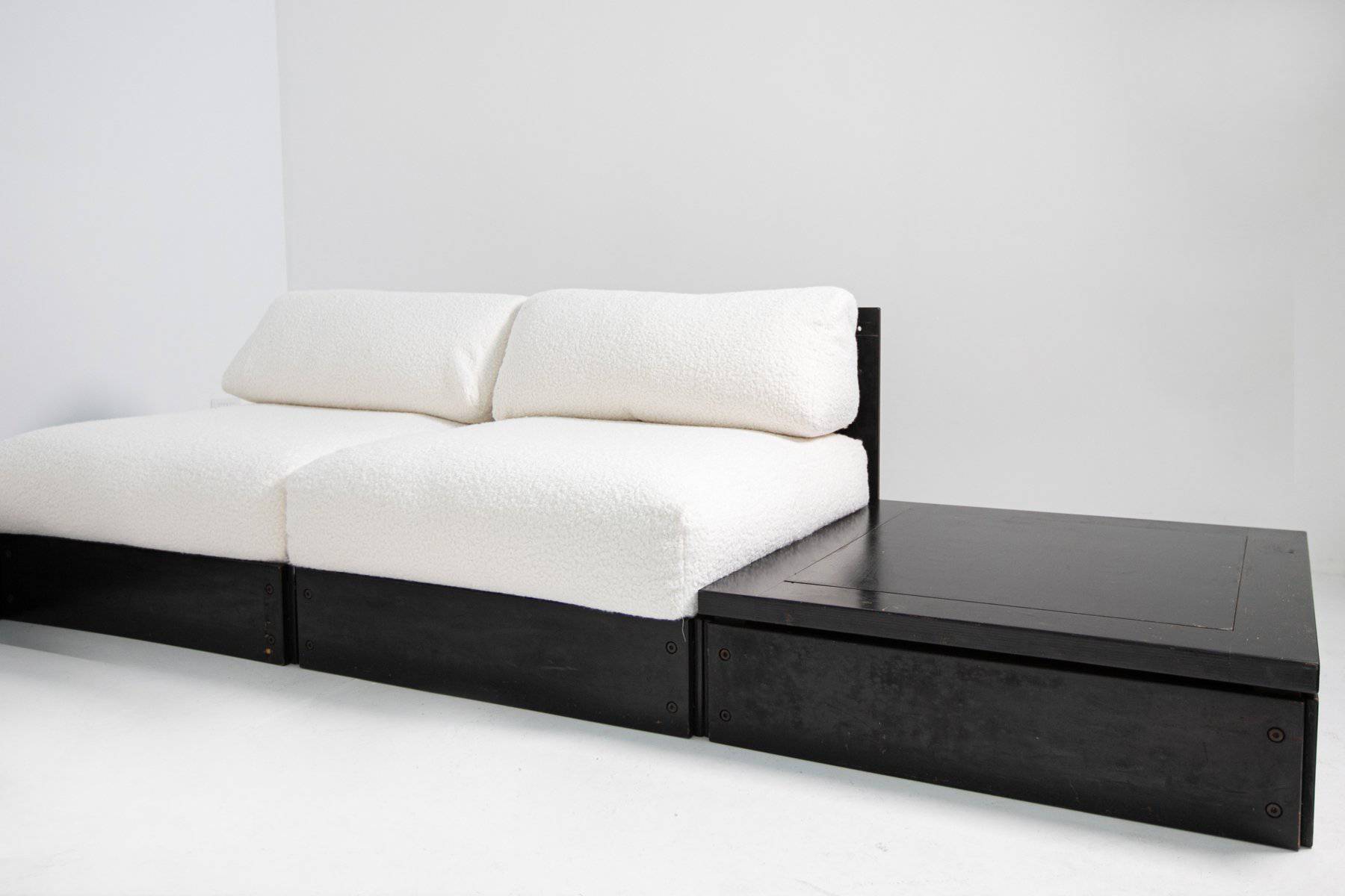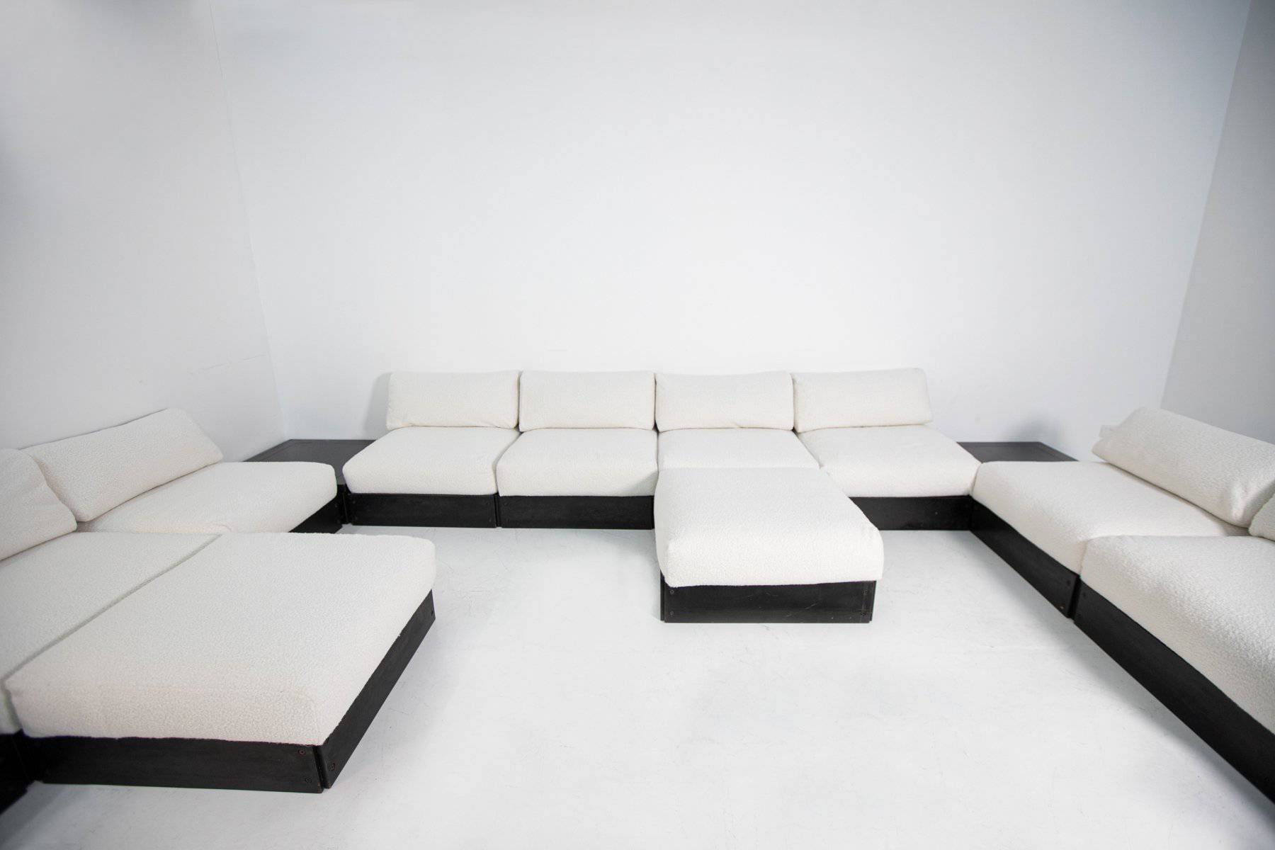 ROLF HEIDE (Kiel, 1932-2020) per ICF. Divano componibile a nove posti in legno tinto nero, cinghie intrecciate e cuscini in tessuto bouclé bianco con due tavolini d'appoggio e due ampi pouff. Anni '70. Pubblicato in G. Gramigna, Repertorio del design italiano 1950-2000, Allemandi, Torino, 2003, p. 190. Mis. singoli moduli Lung. cm. 85 Alt. cm. 72 Prof. cm. 90 ca.