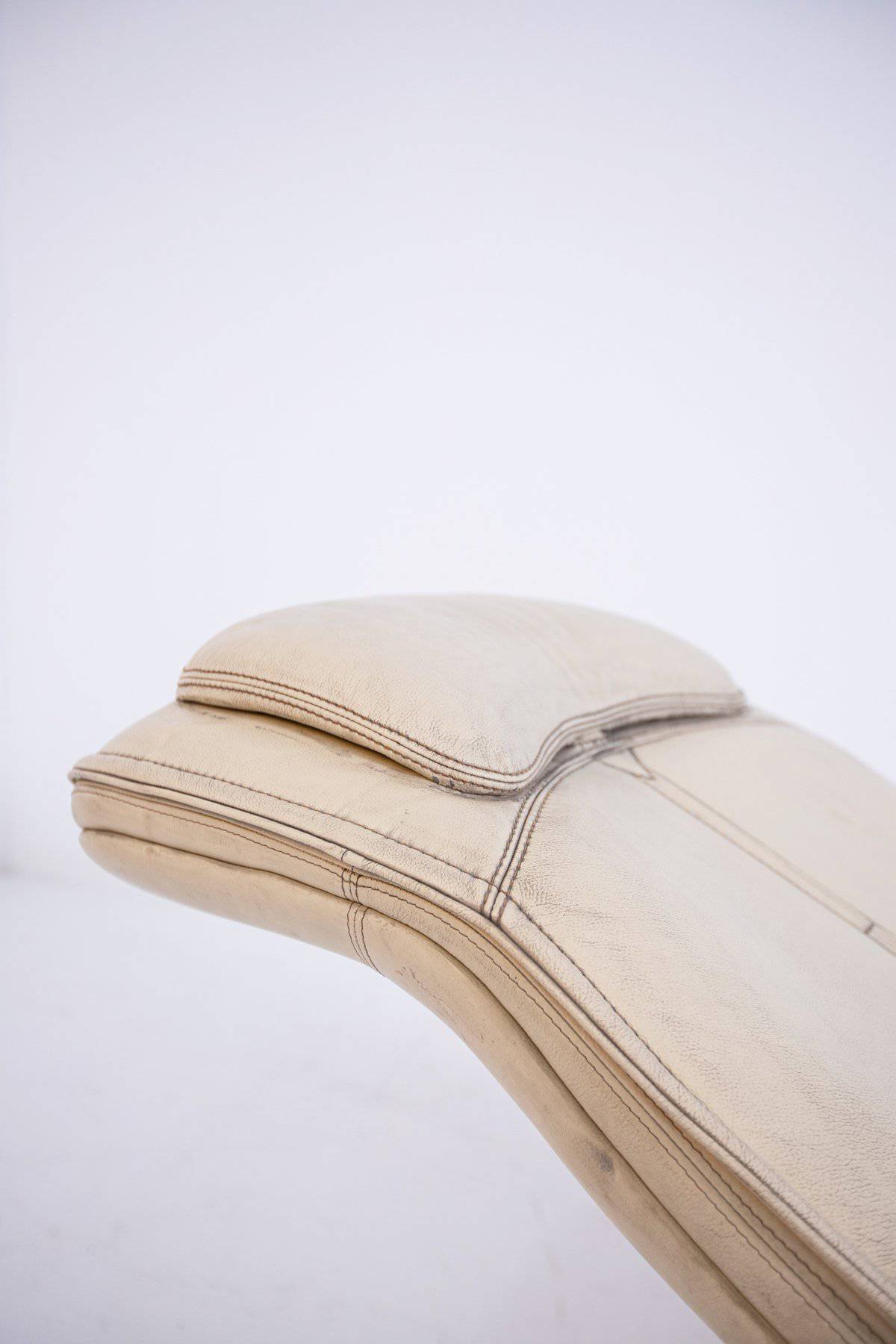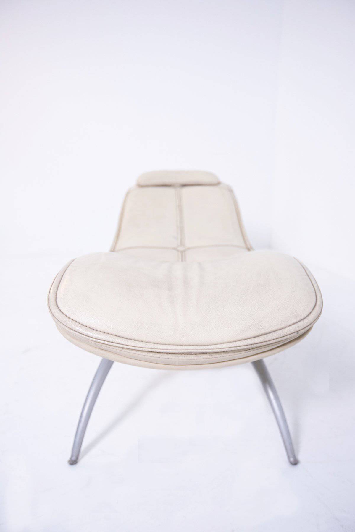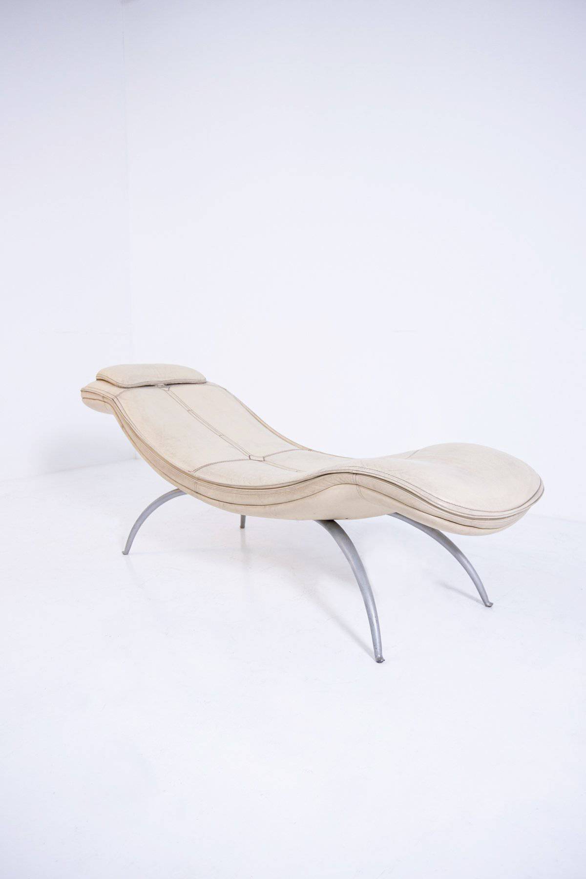 Chaise longue in ferro e pelle color avorio. Produzione MOROSO. Anni '70. Mis. Lung. cm. 61 Alt. cm. 70 Prof. cm. 182 ca.