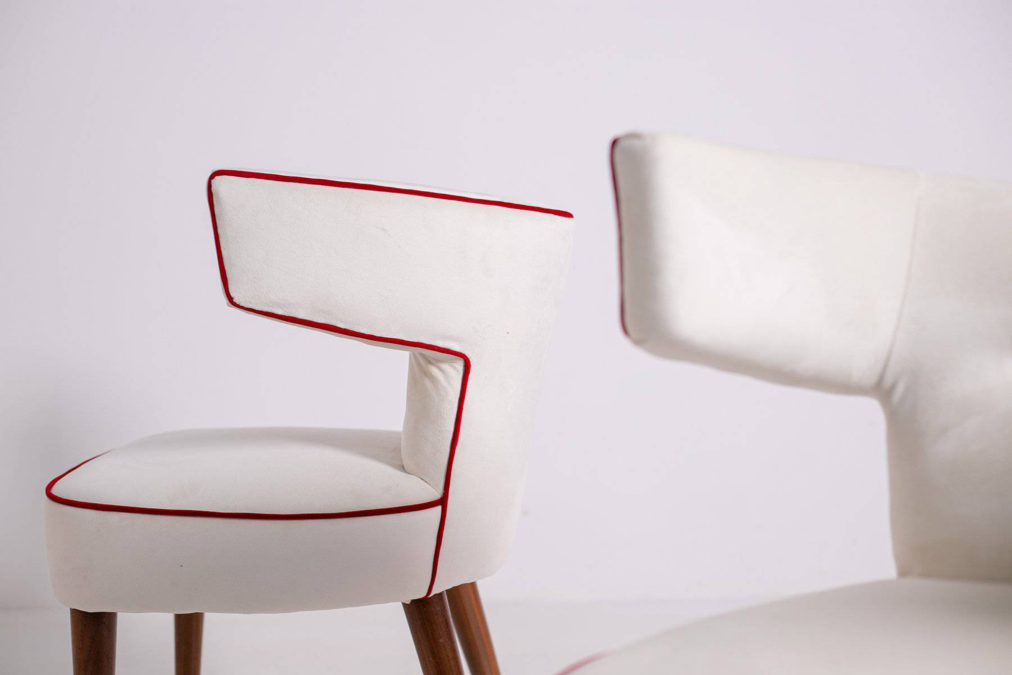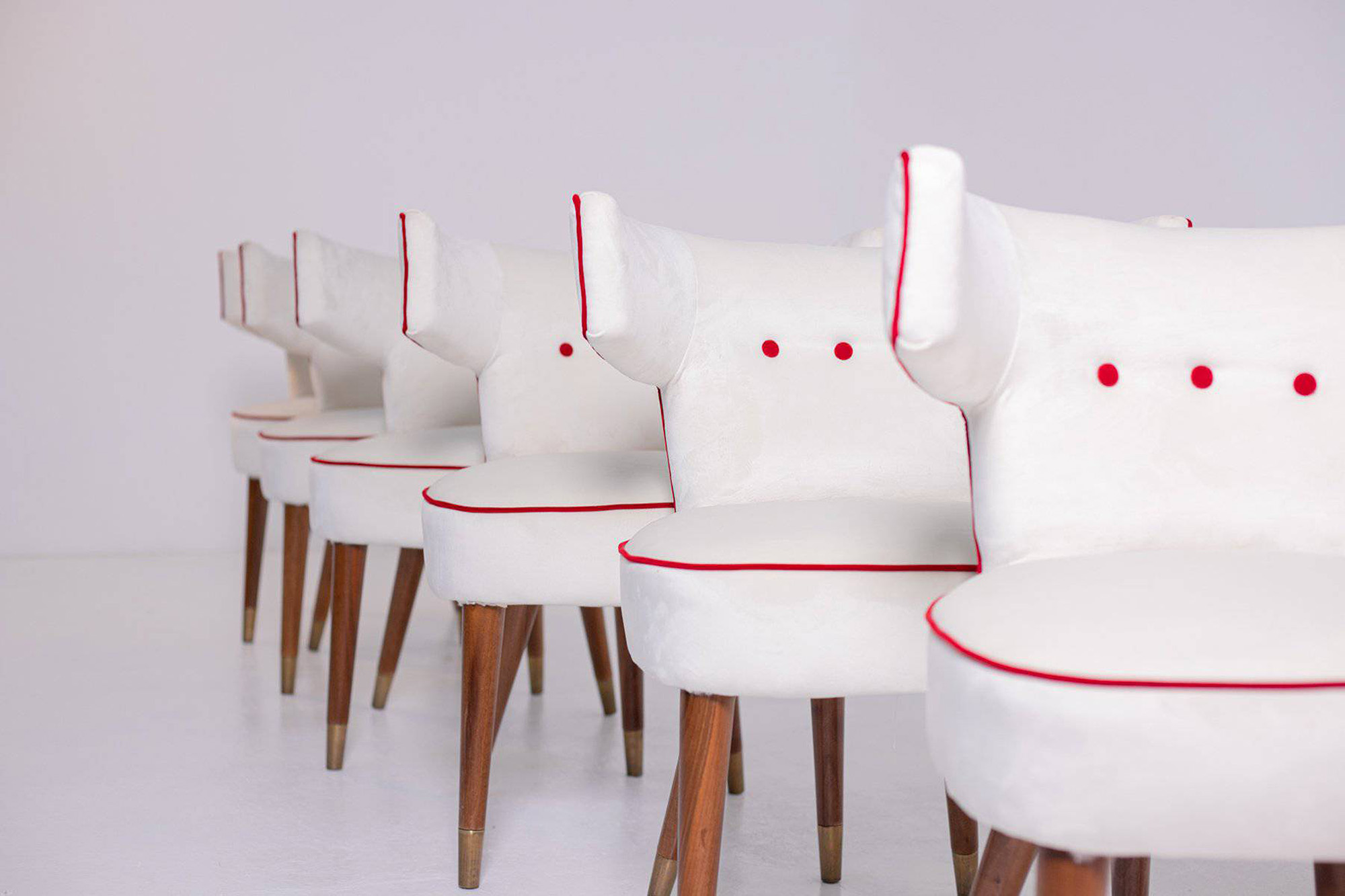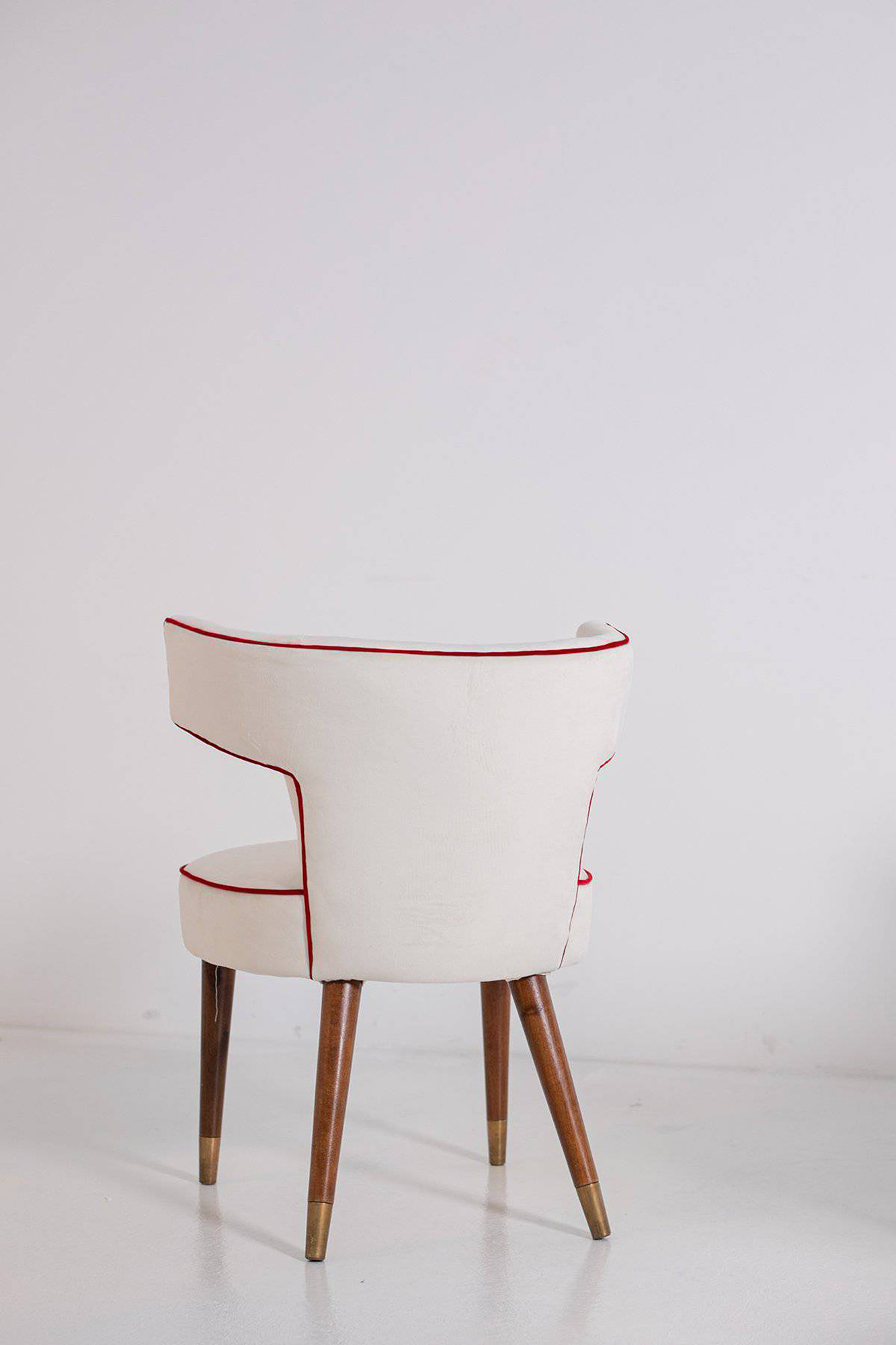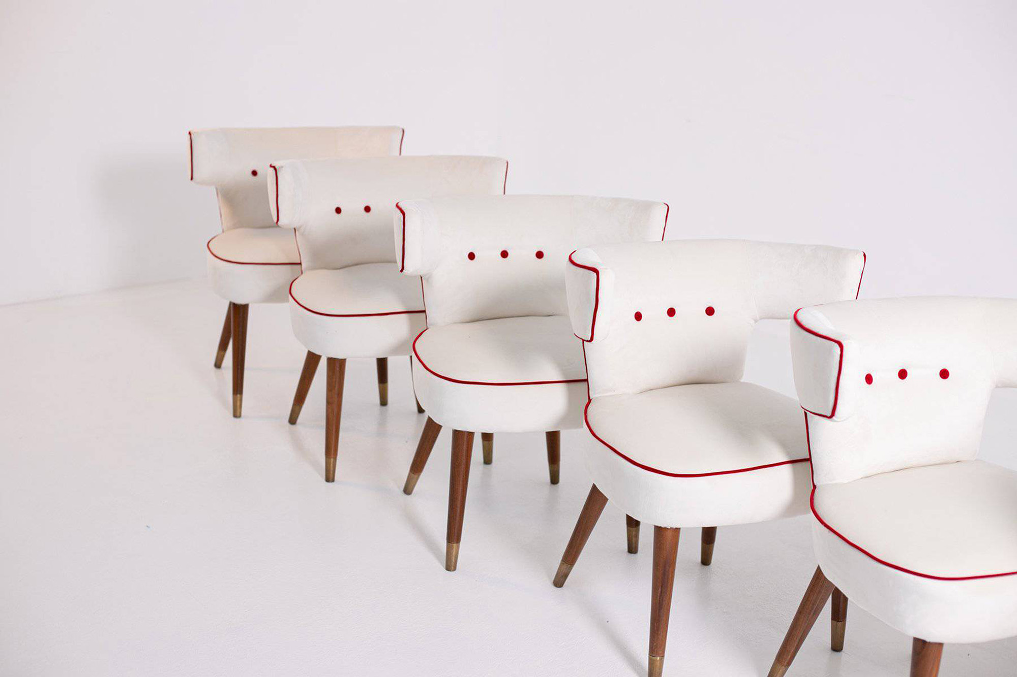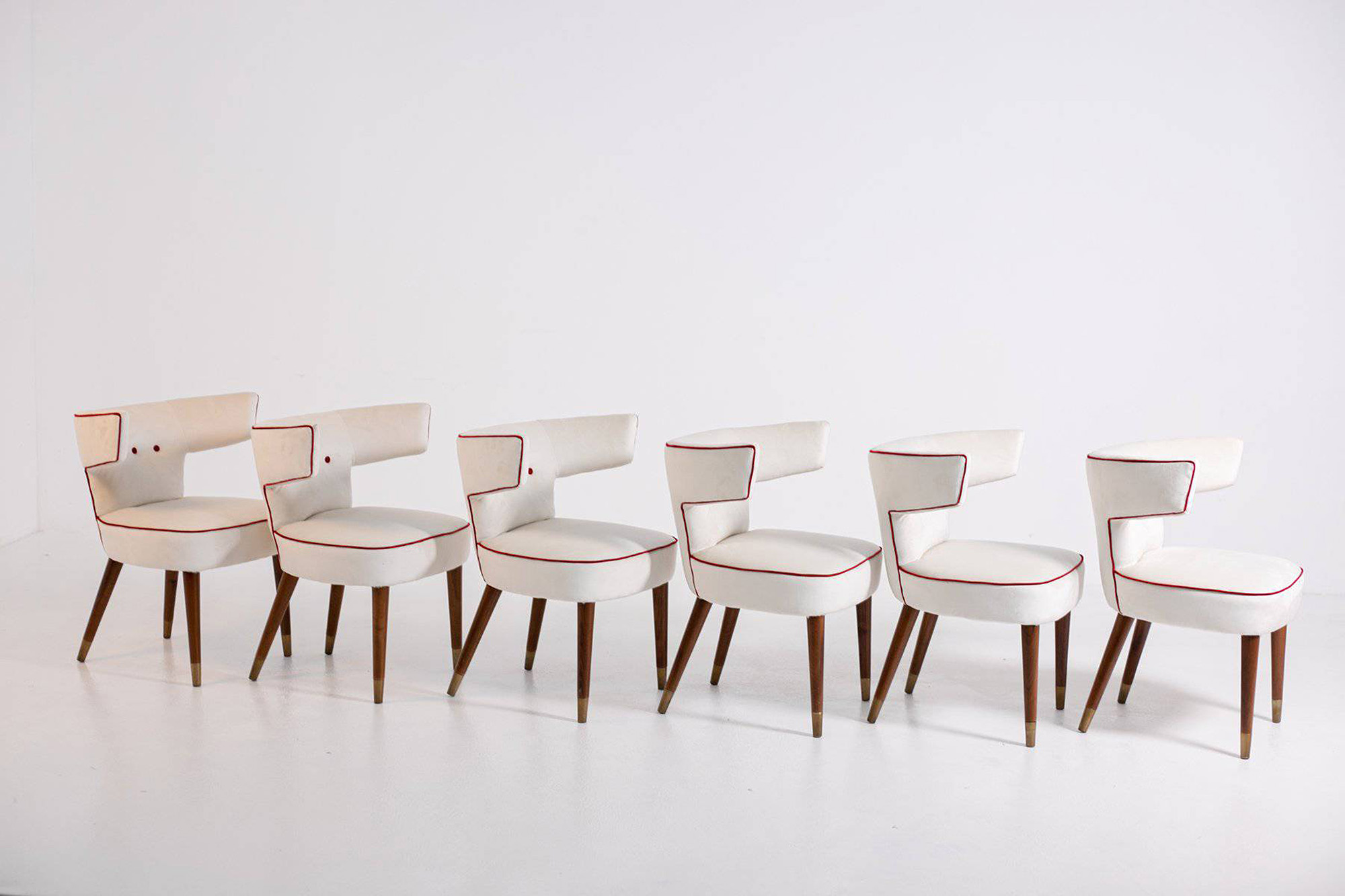 GIO PONTI (Milano, 1891-1979) e NINO ZONCADA (Venezia, 1898 - 1988) per CASSINA. Sei sedie modello 538 in velluto bianco con bordini rossi, legno e ottone, realizzate per la nave Giulio Cesare. Anni '50. Pubblicate su Domus n. 267 Febbraio 1952, Nave Giulio Cesare-Catalogo Navi: il progetto degli interni navali 1948-1953. Mis. Alt. cm. 52 Diam. cm. 112 ca.