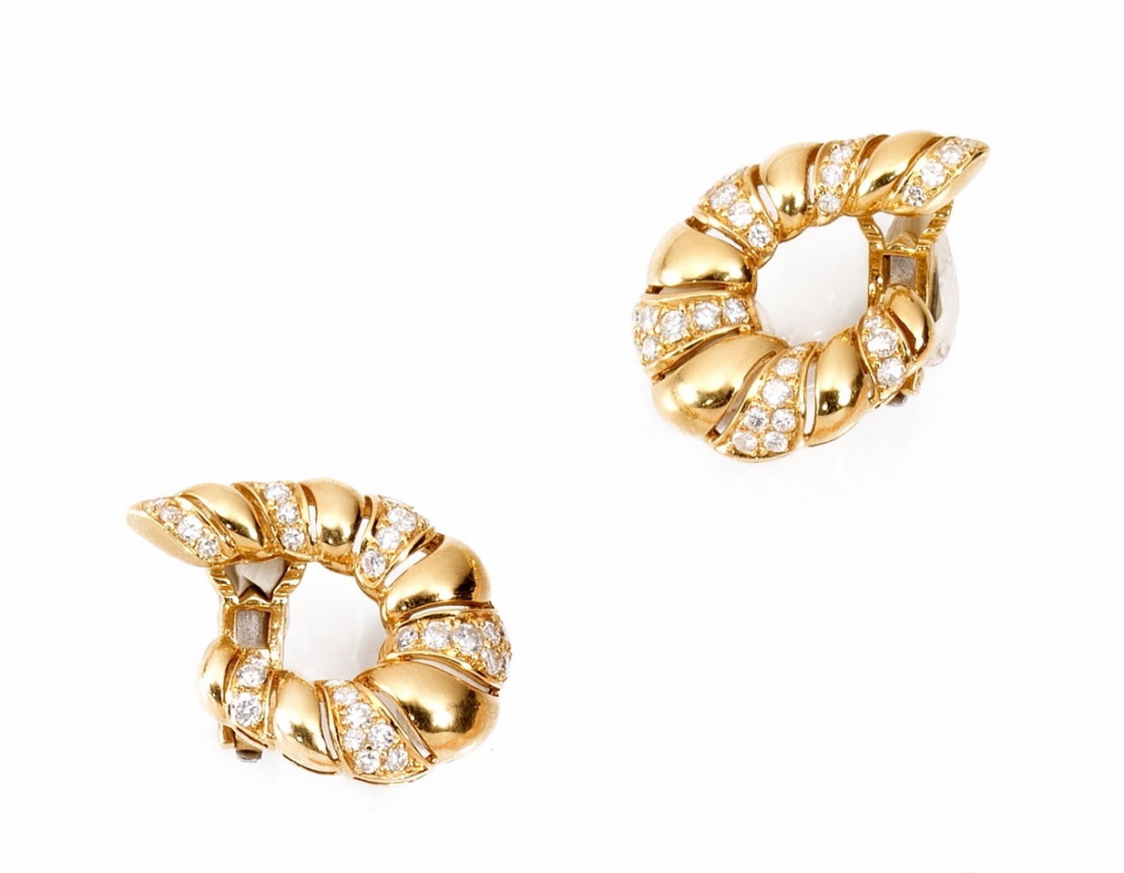 ciascuno modellato come una voluta bombata in oro giallo decorata da inserti in pavè di brillanti, g 17