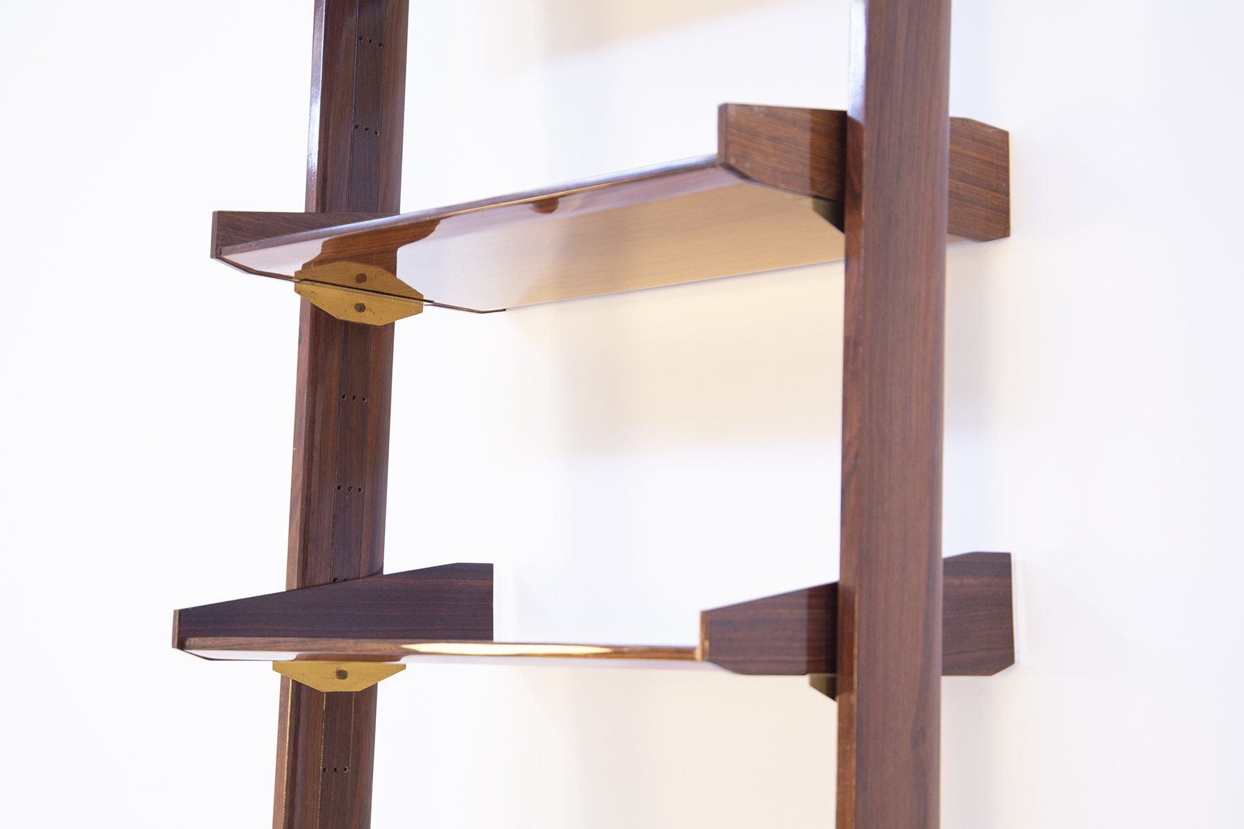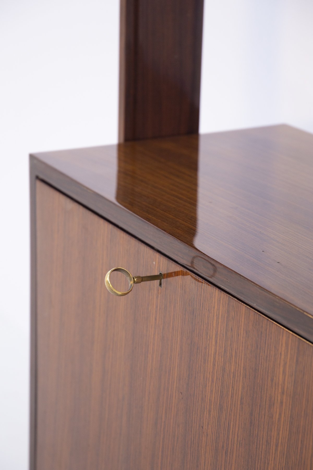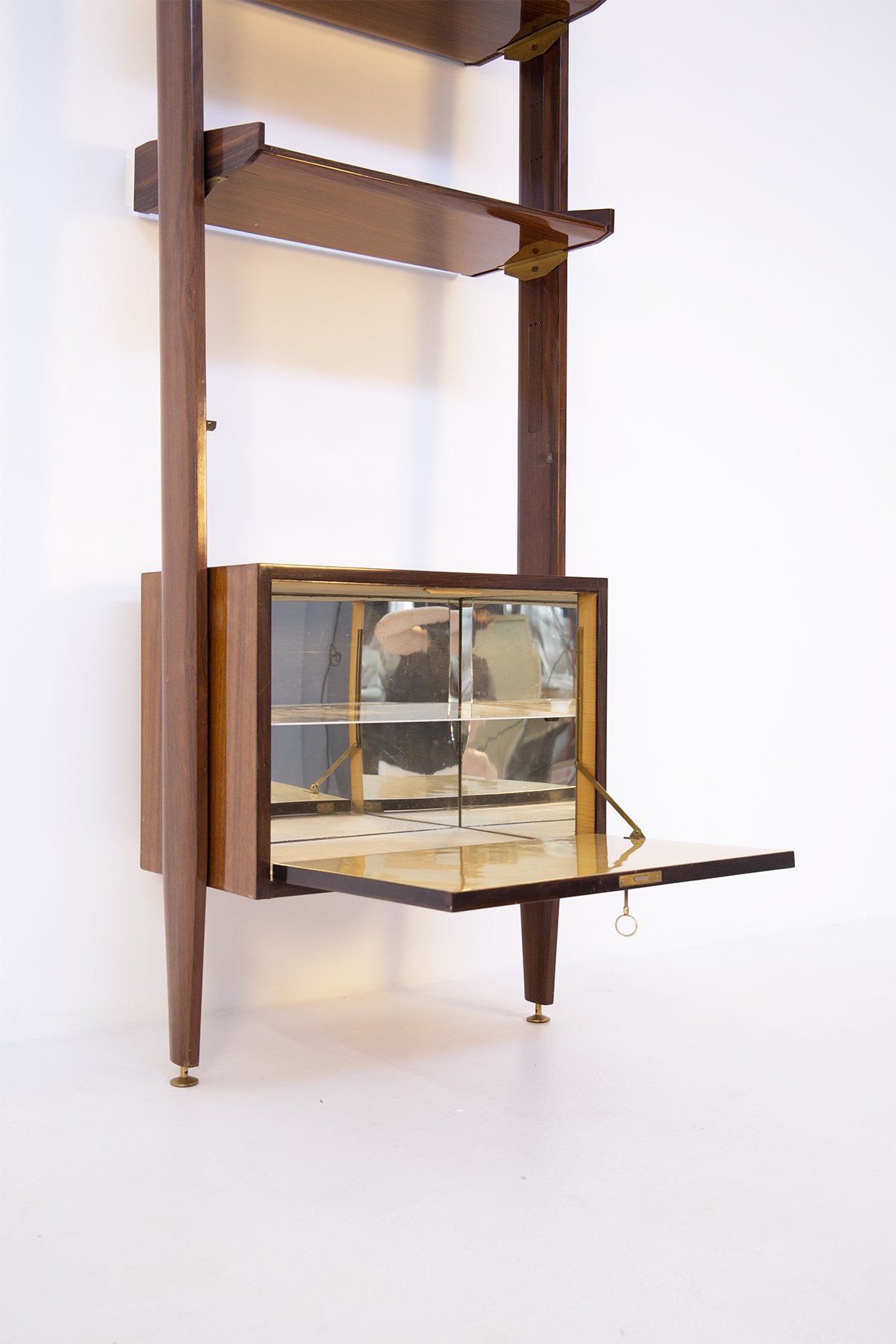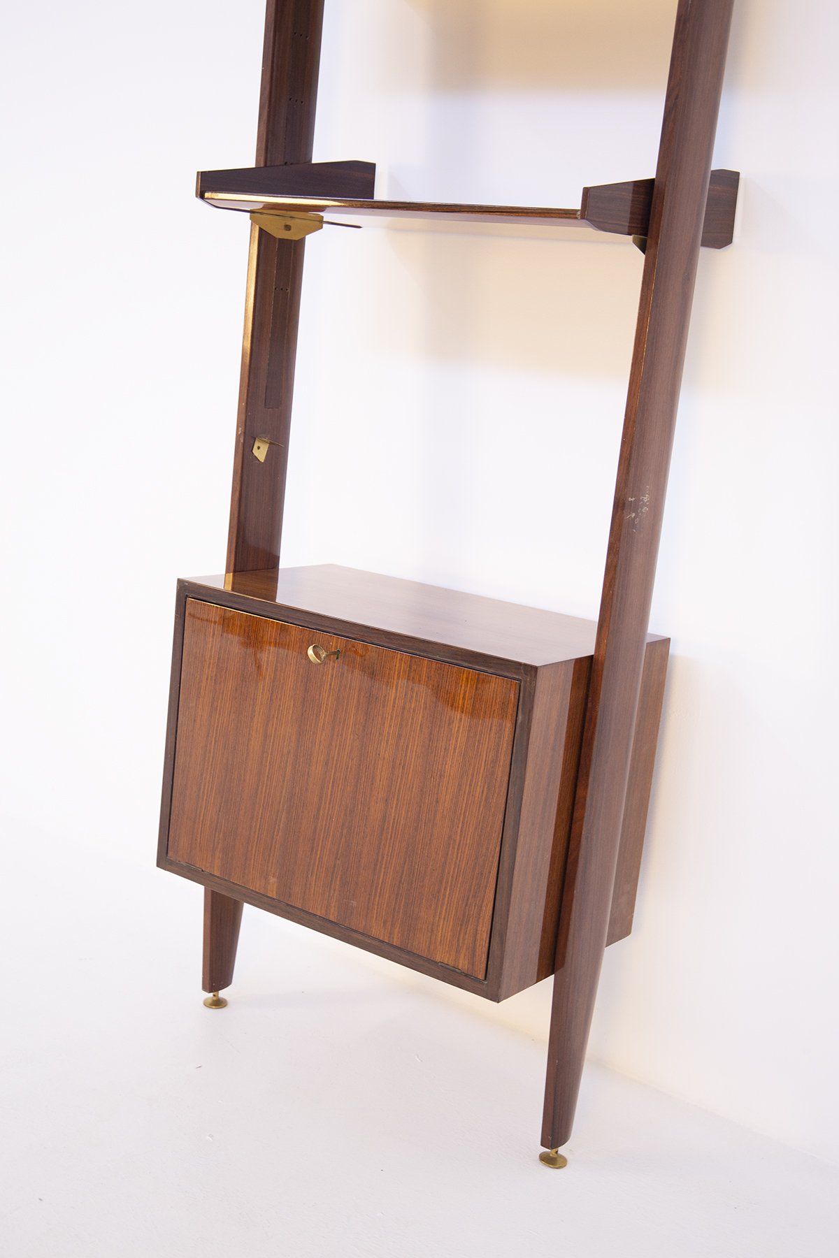 Libreria in legno con piedini in ottone, composta da tre ripiani e un mobile bar. Manifattura italiana. Anni '50. Mancante di uno scaffale. Mis. Lung. cm. 76 Alt. cm. 310 Prof. cm. 43 ca.