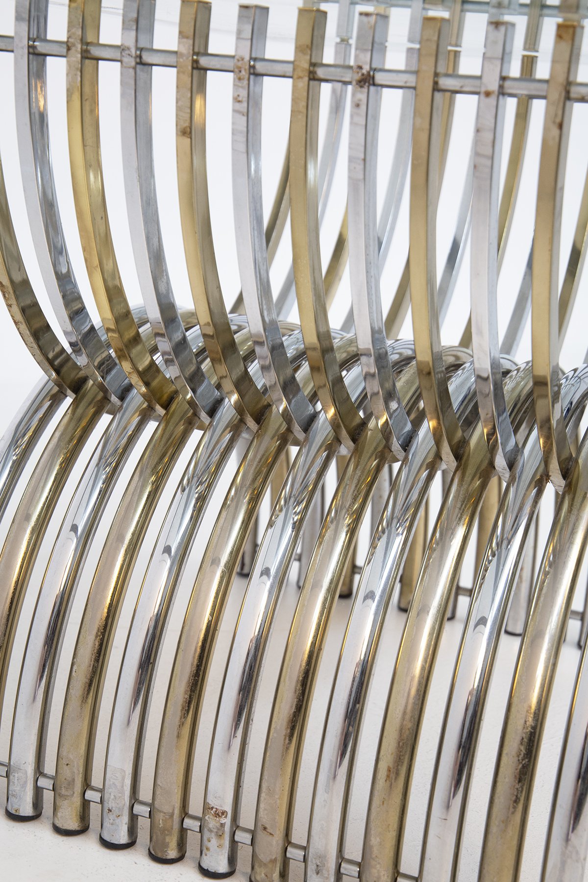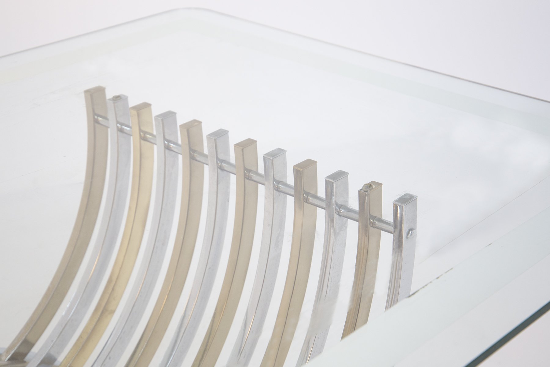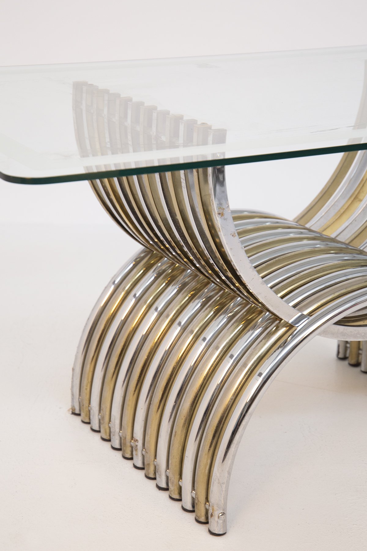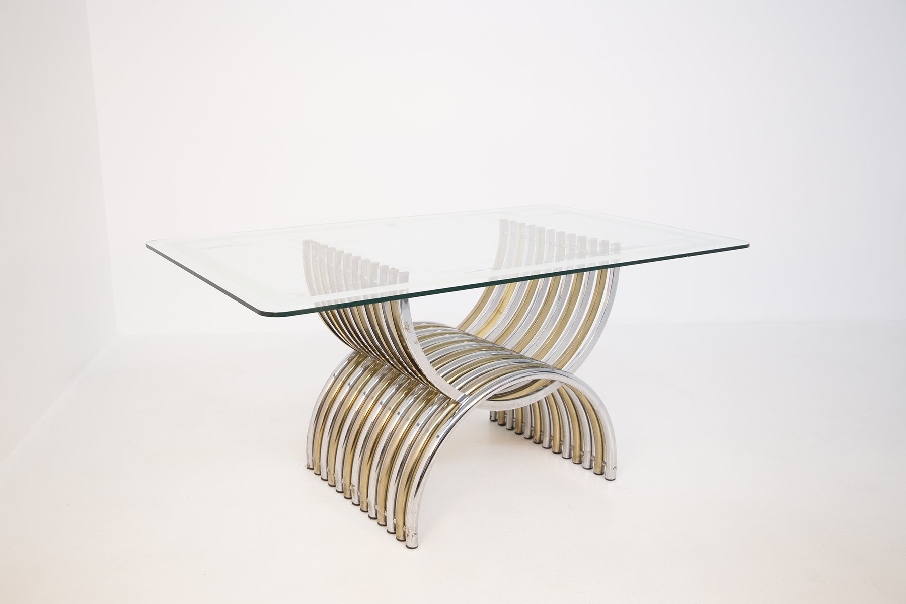 ROMEO REGA (Roma, 1904-1968). Tavolo con piano rettangolare in vetro e base in tubolare d'acciaio sia in cromo che in ottone. Anni '60 Mis. Lung. cm. 161 Alt. cm. 78 Prof. cm. 100 ca.