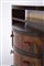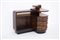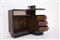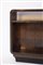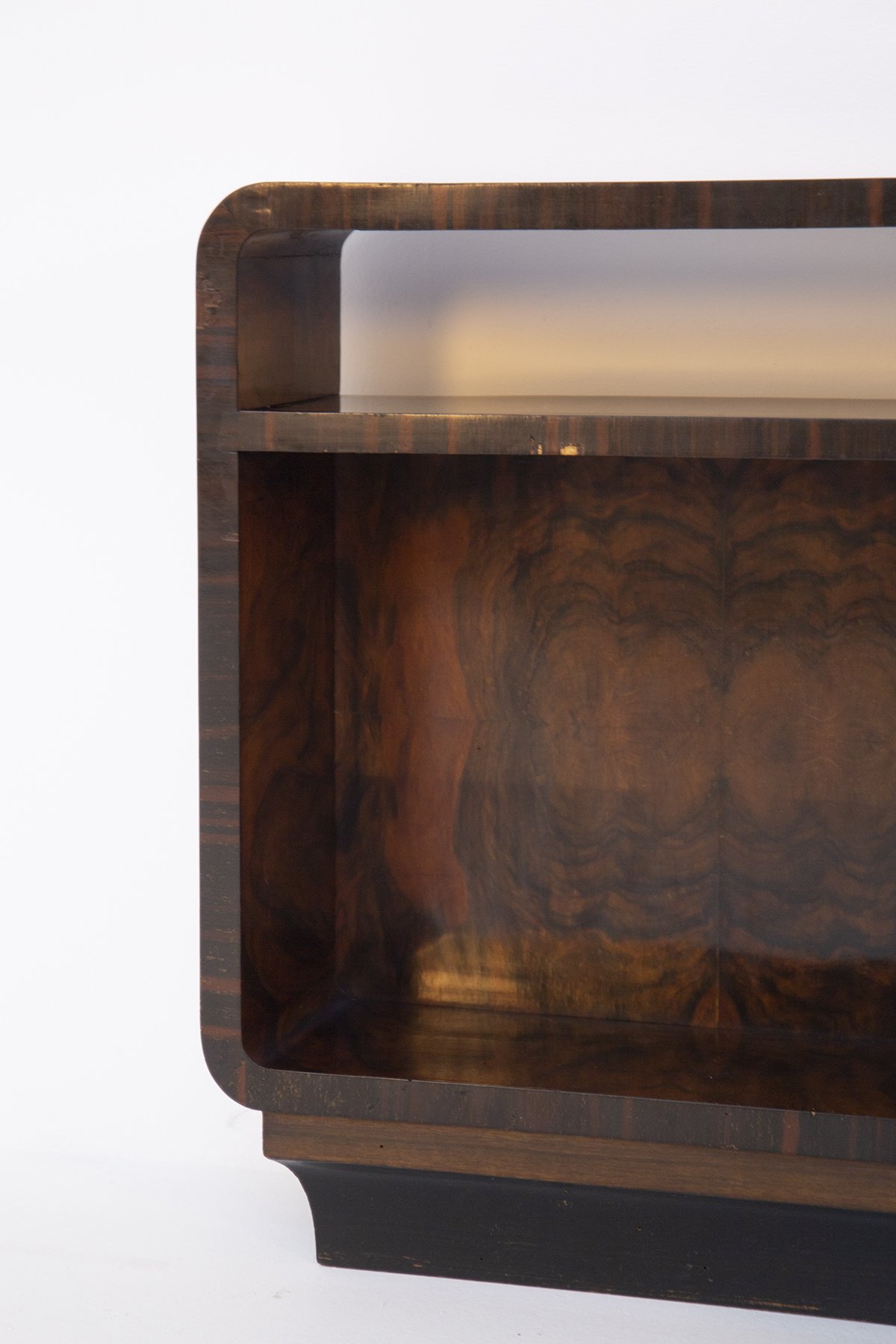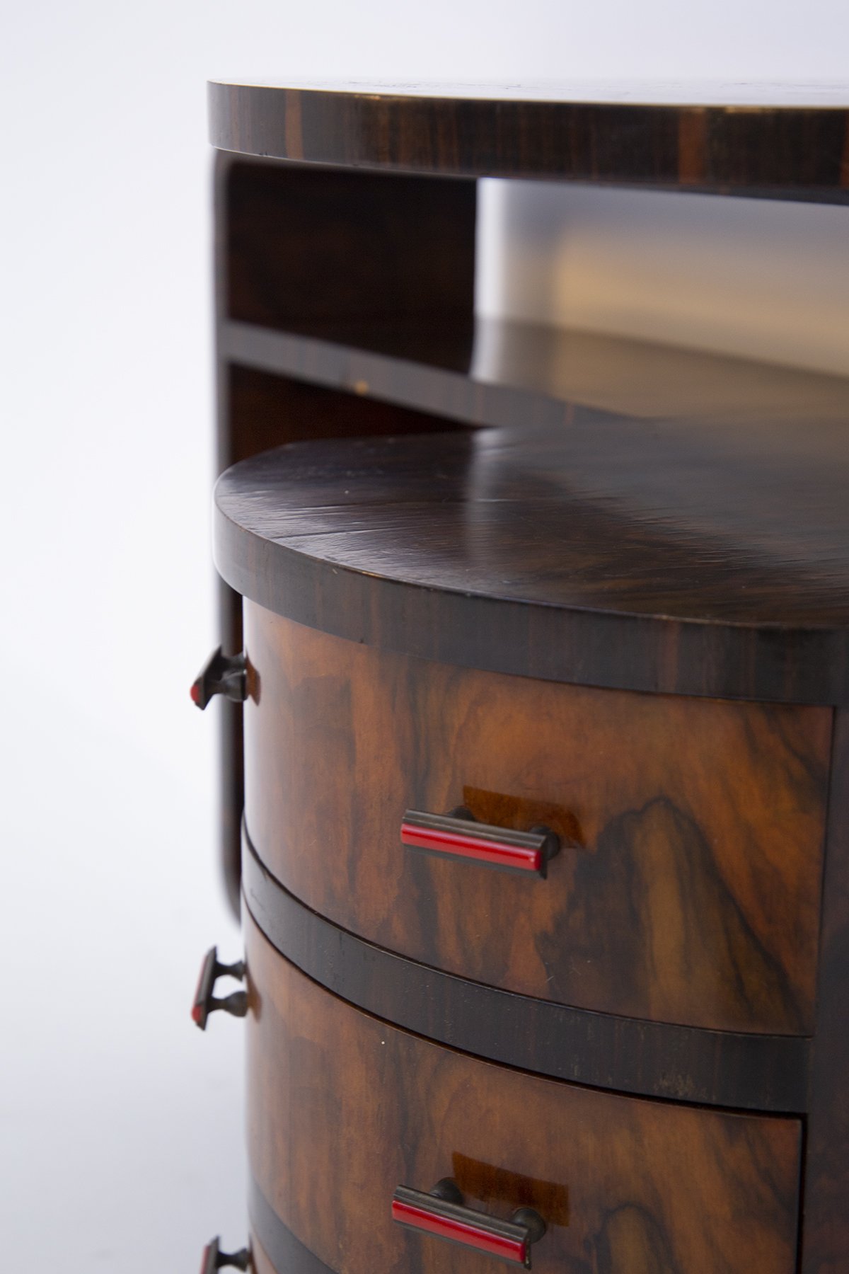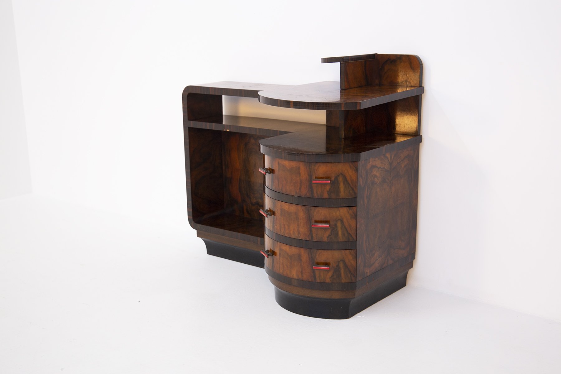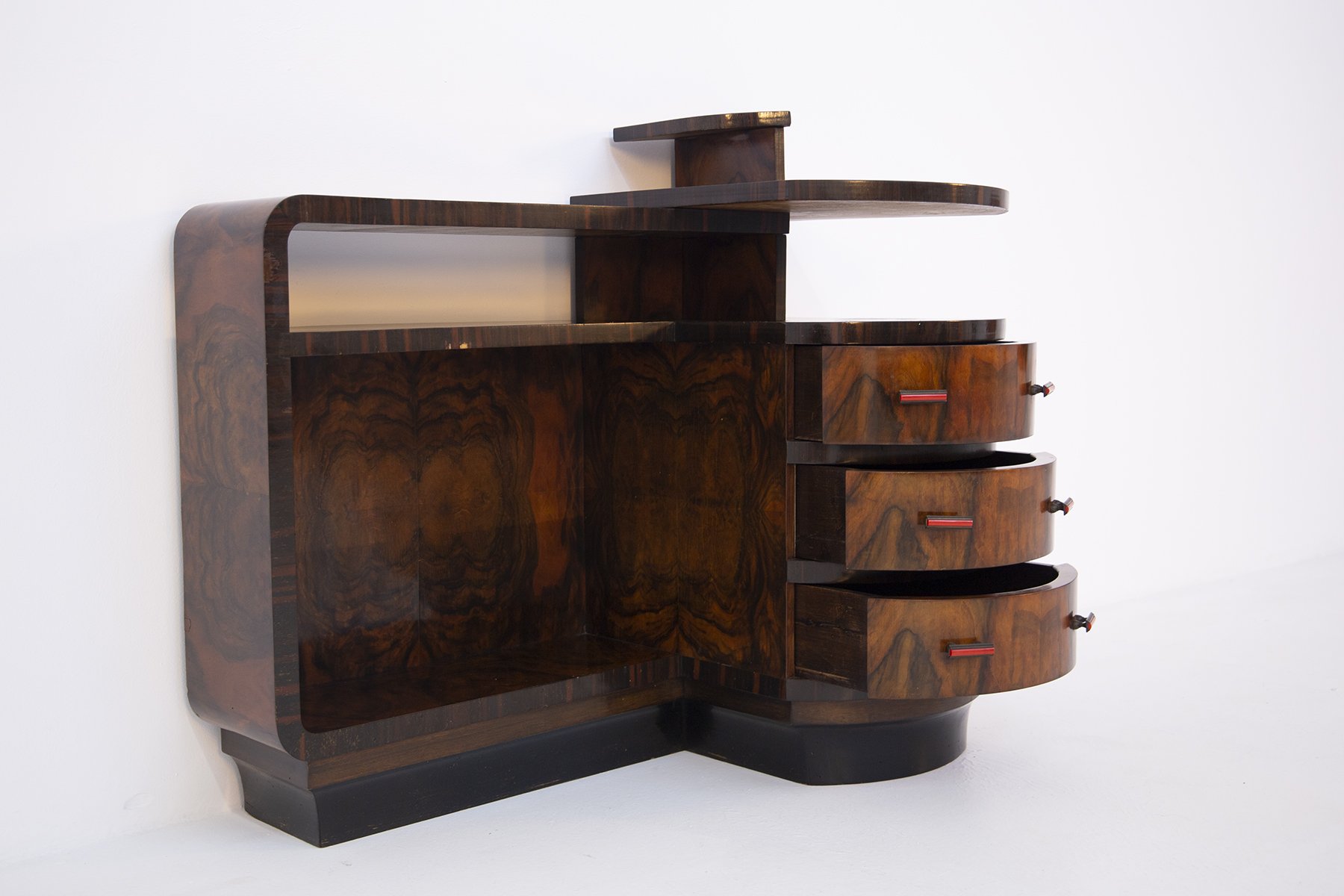 Credenza razionalista in legno di noce con maniglie in bachelite rossa, composta da più ripiani e da tre cassetti laterali. Anni '20. Mis. Lung. cm. 60 Alt. cm. 38 Prof. cm. 48 ca.