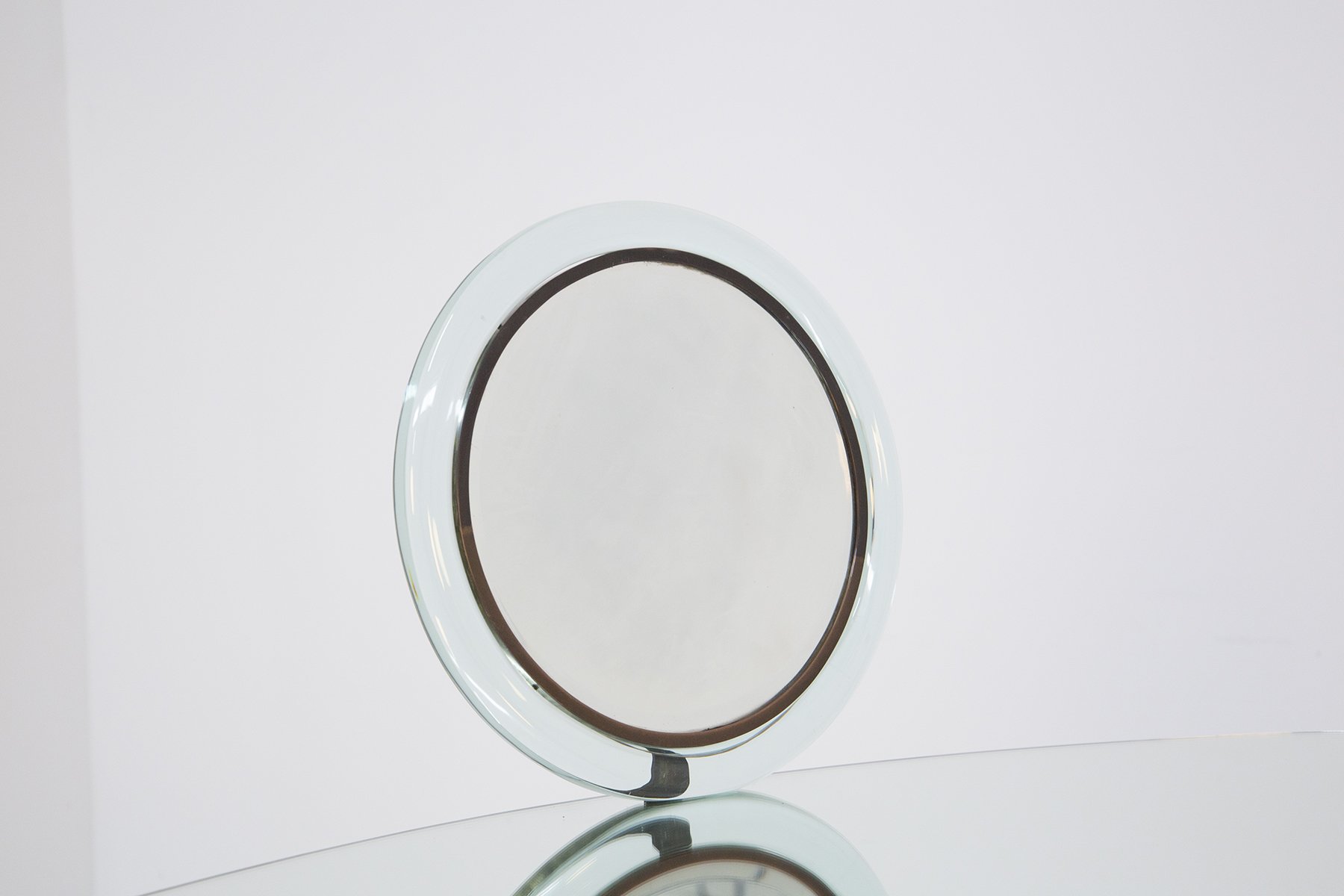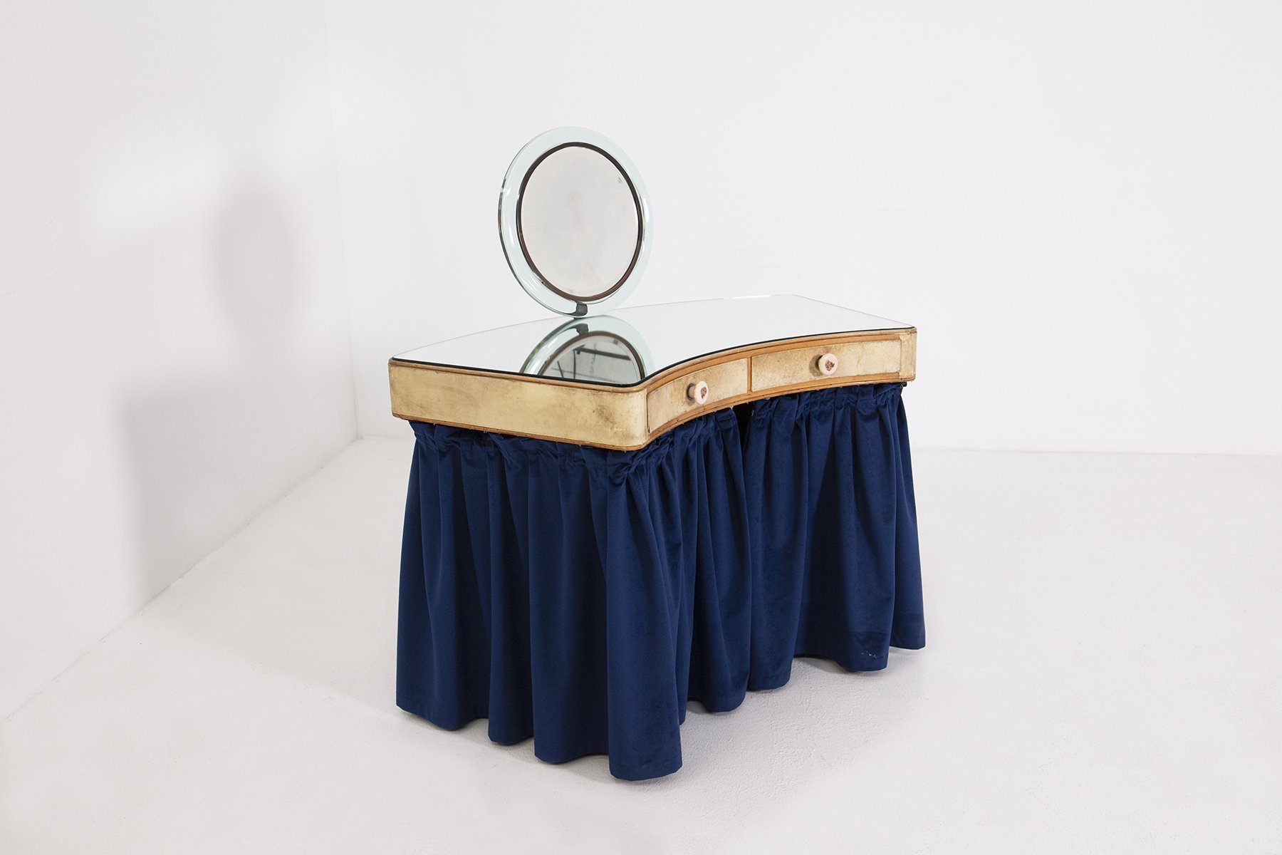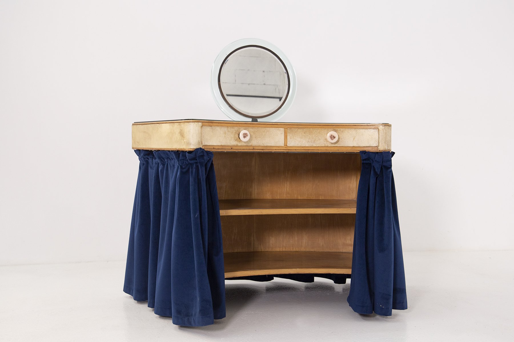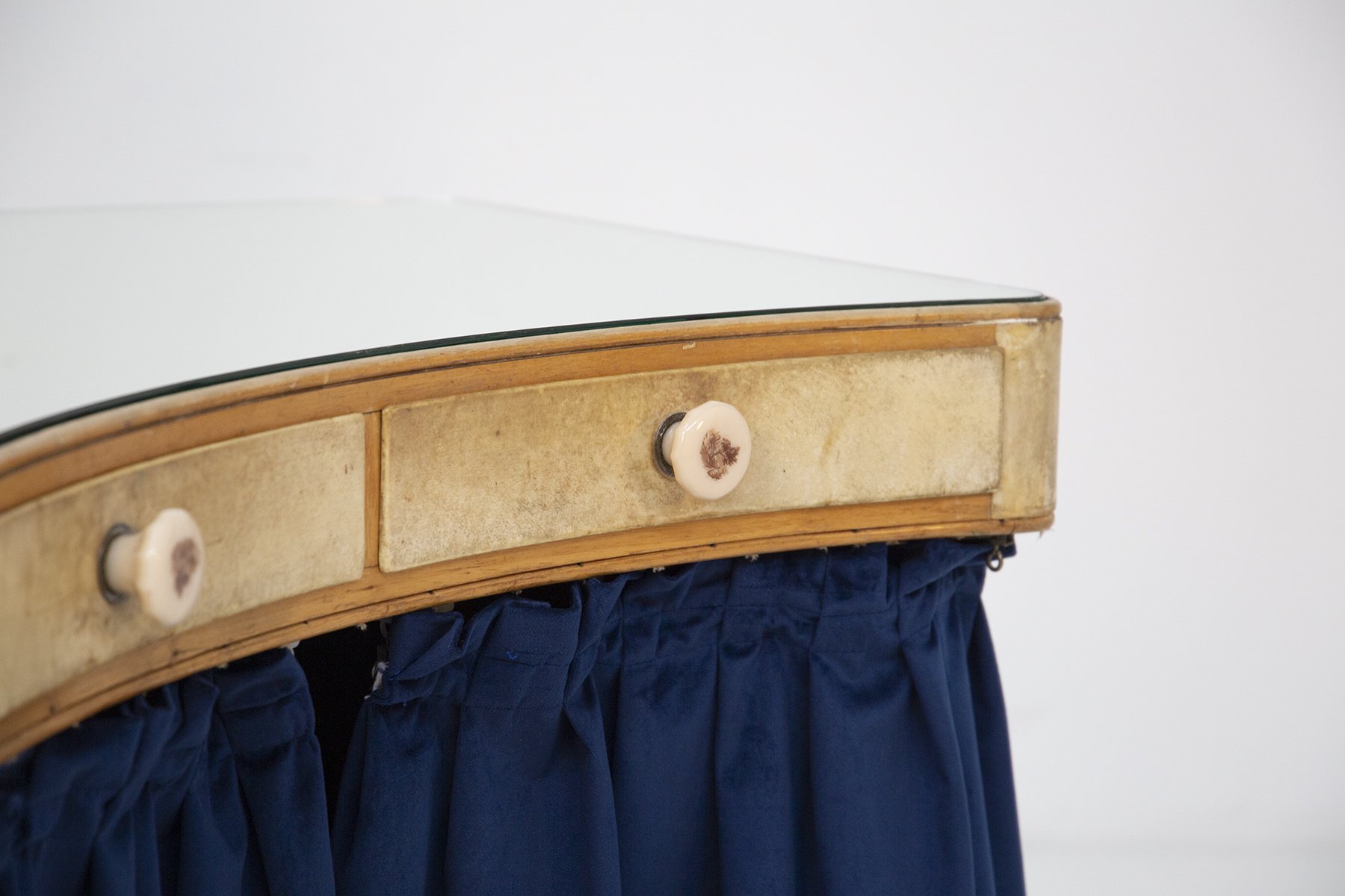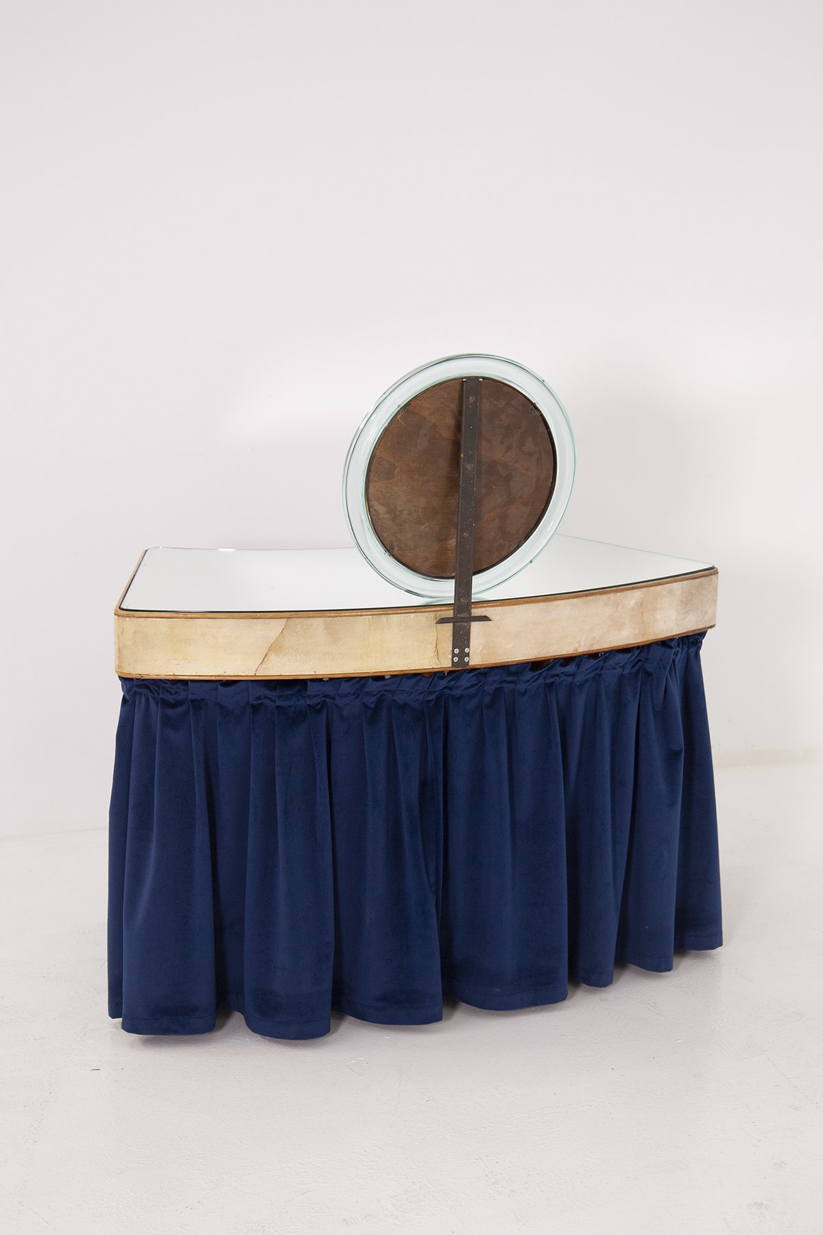 PIETRO CHIESA (Attr.) (1892- 1948, Milano). Petineuse con piano in vetro e specchio rotondo, cassetti in pergamena e pomelli in madreperla, la parte inferiore è composta da ripiani in legno coperti da una tendina di velluto blu. Anni '40. Mis. Lung. cm. 113 Alt. cm. 119 Prof. cm. 72 ca.