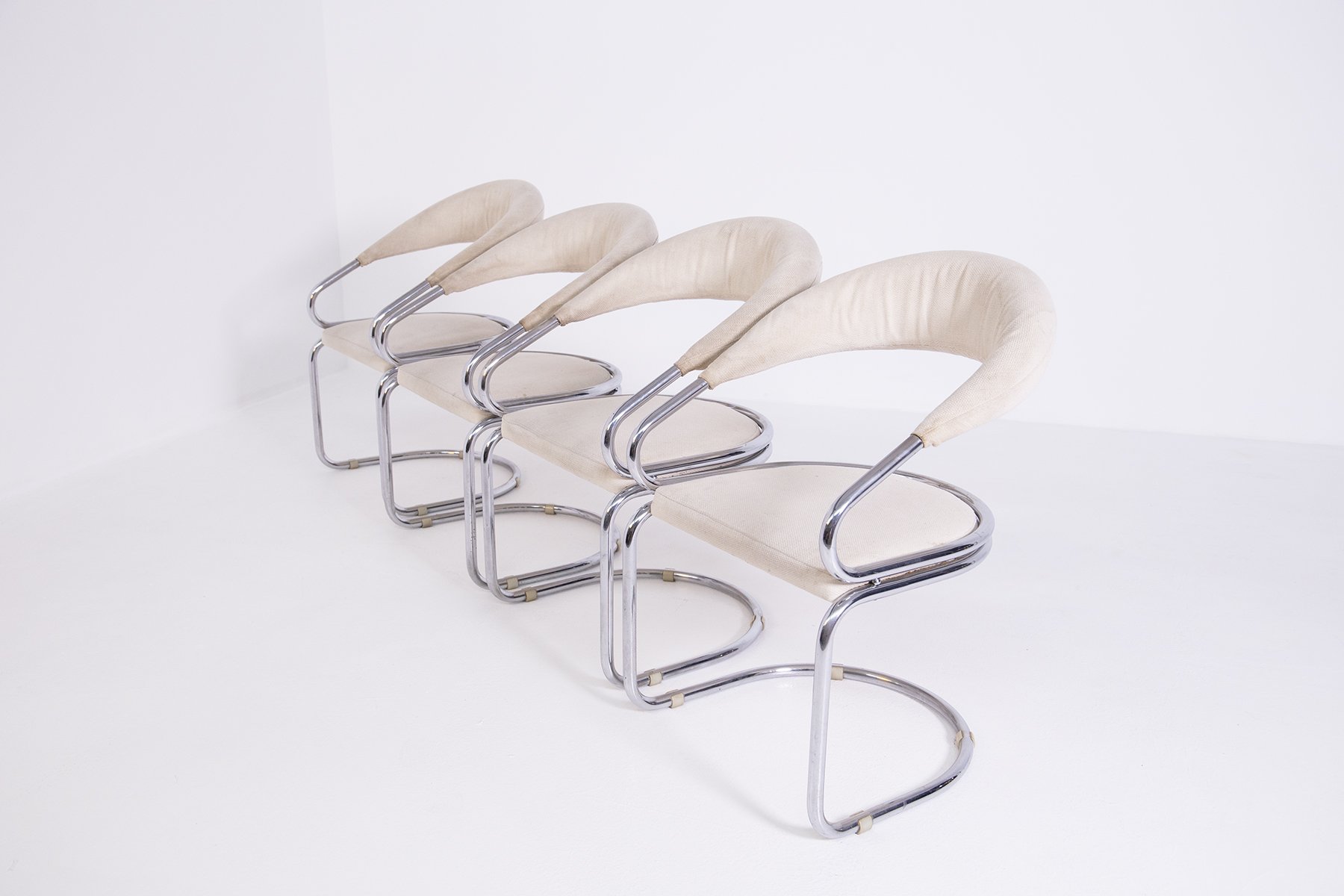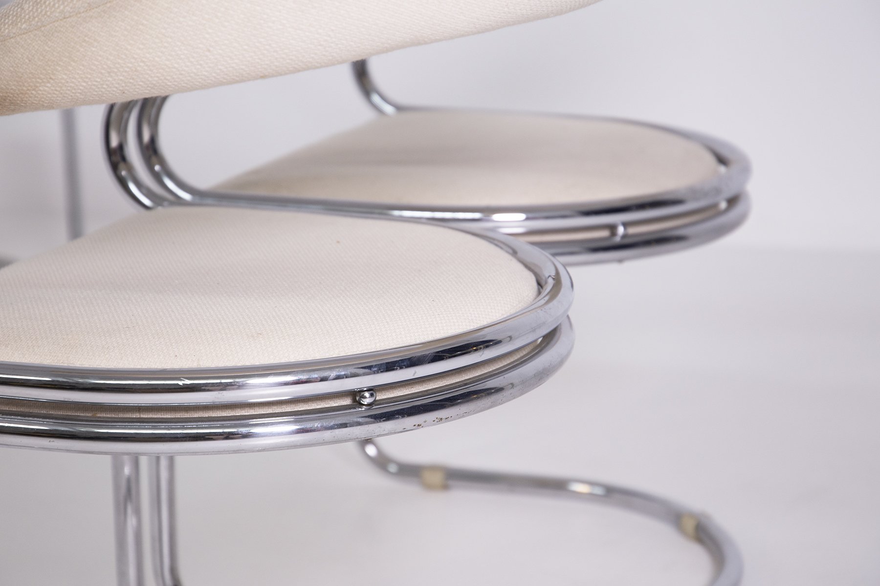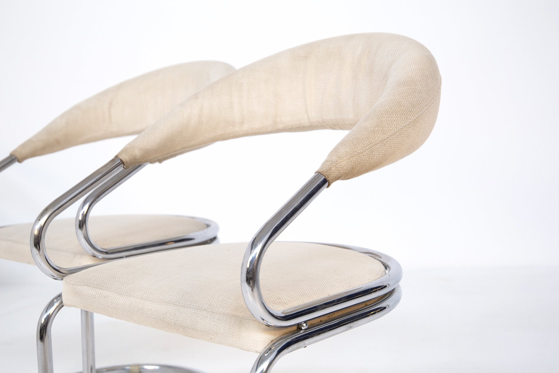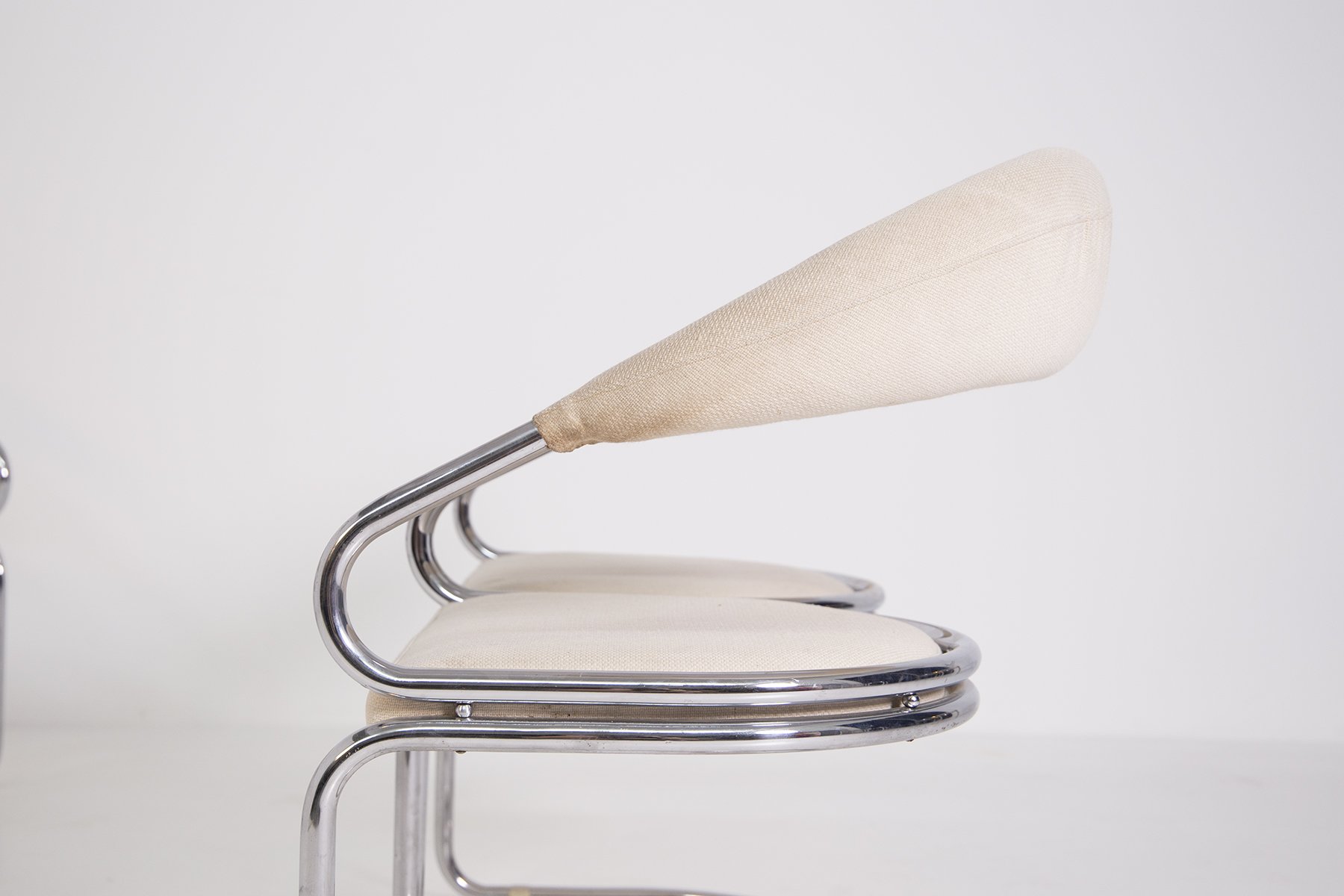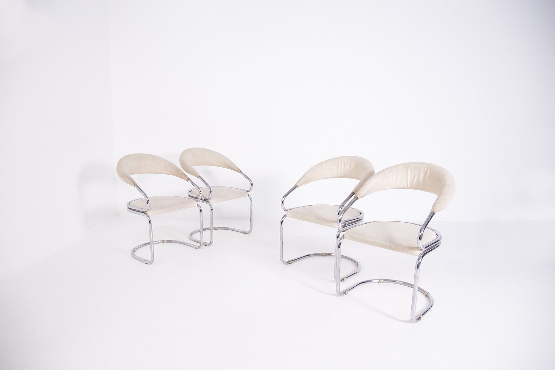 GIOTTO STOPPINO (Vigevano, 1926 - Milano, 2011). Quattro sedie con base in tubolare d'acciaio cromato e sedute in tessuto di cotone beige. Anni '60. Mis. Lung. cm. 58 Alt. cm. 87 Prof. cm. 58 ca.