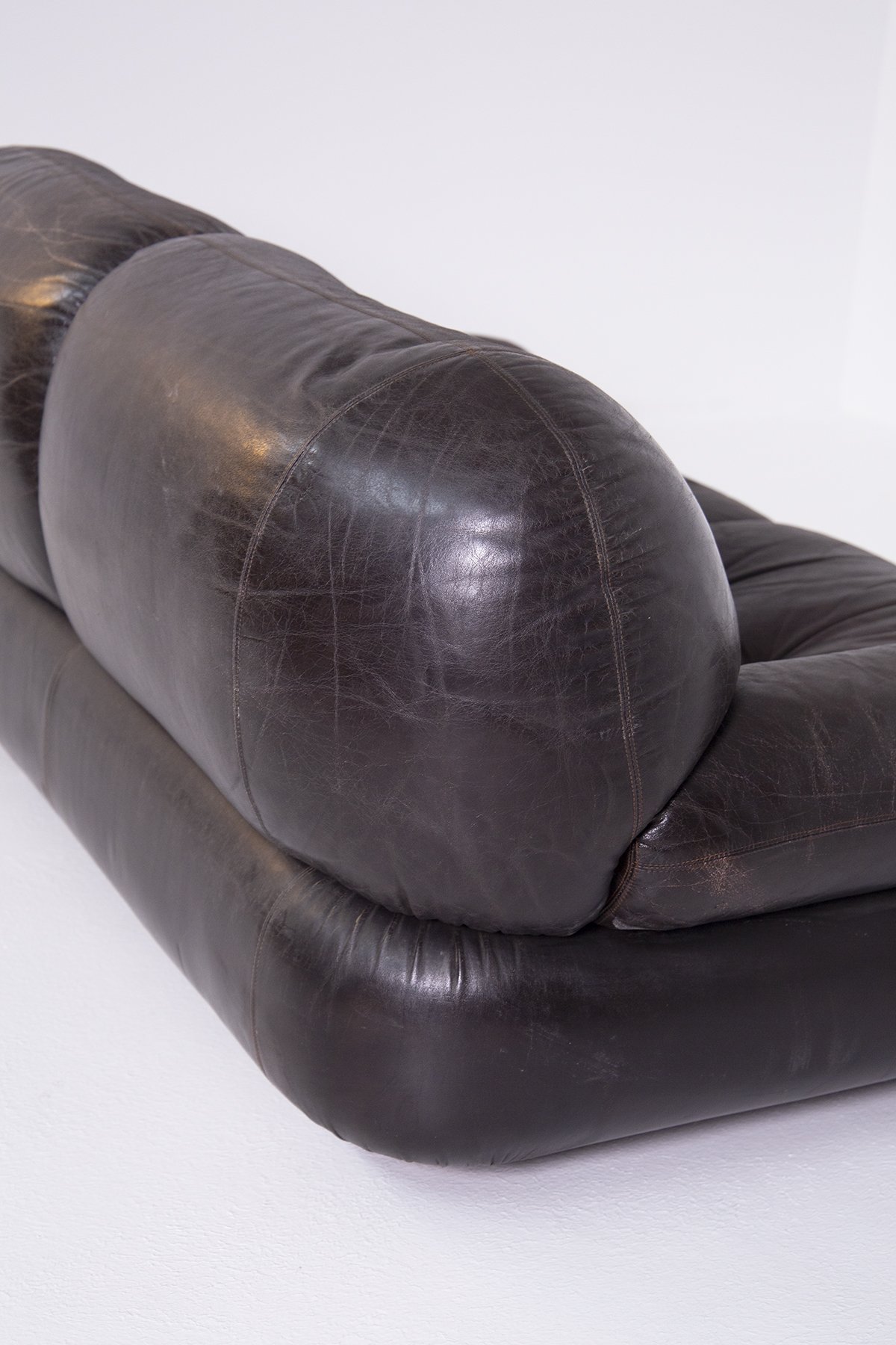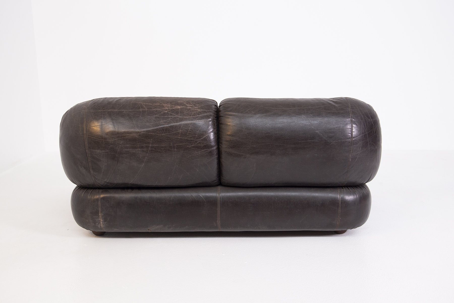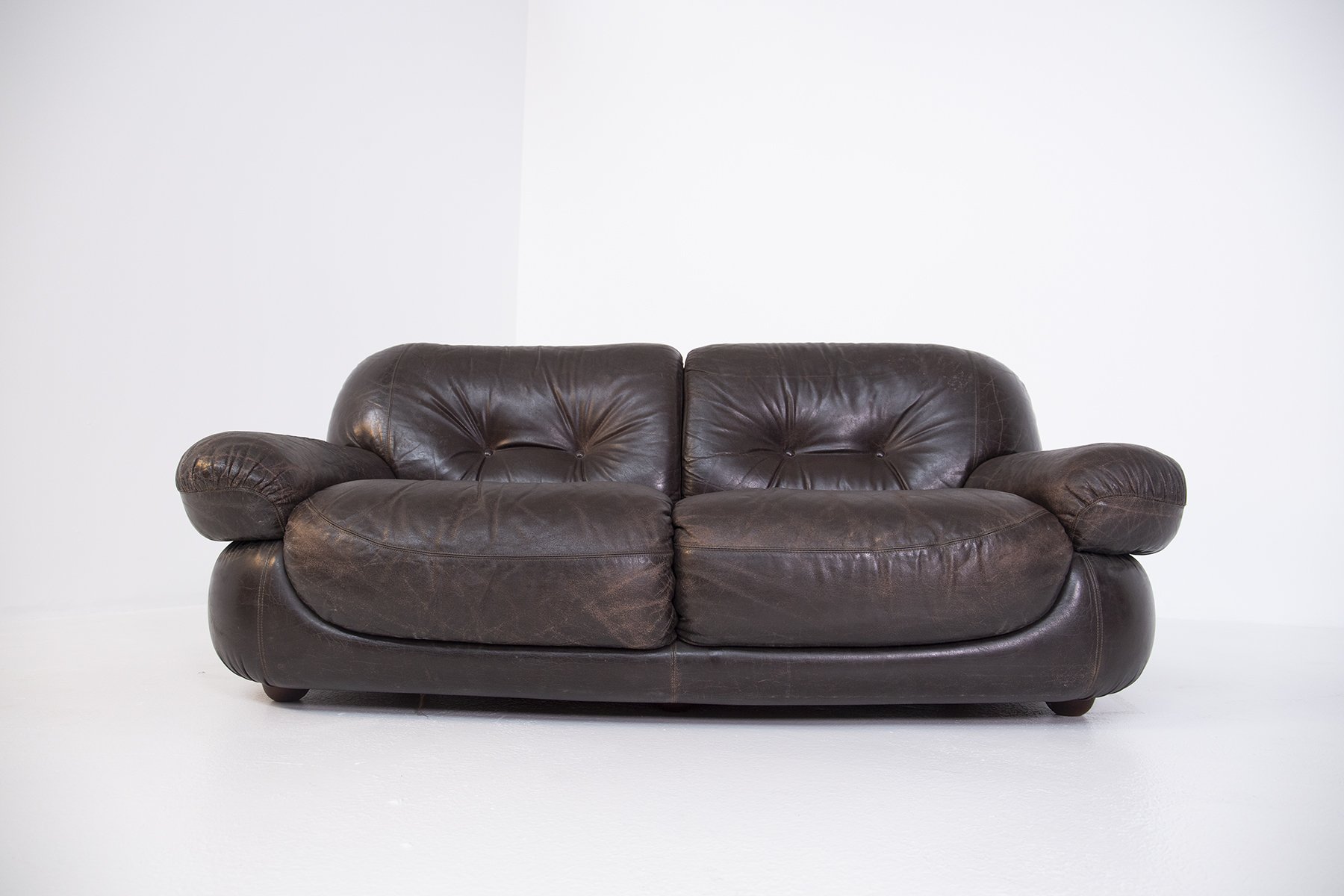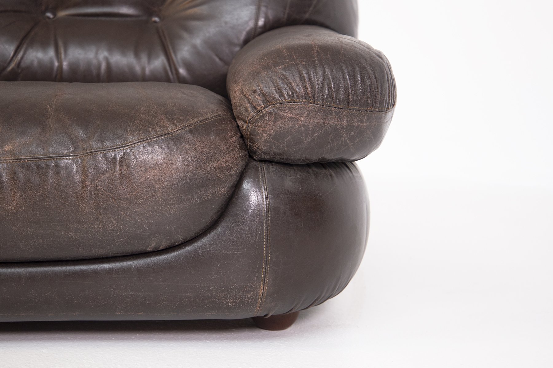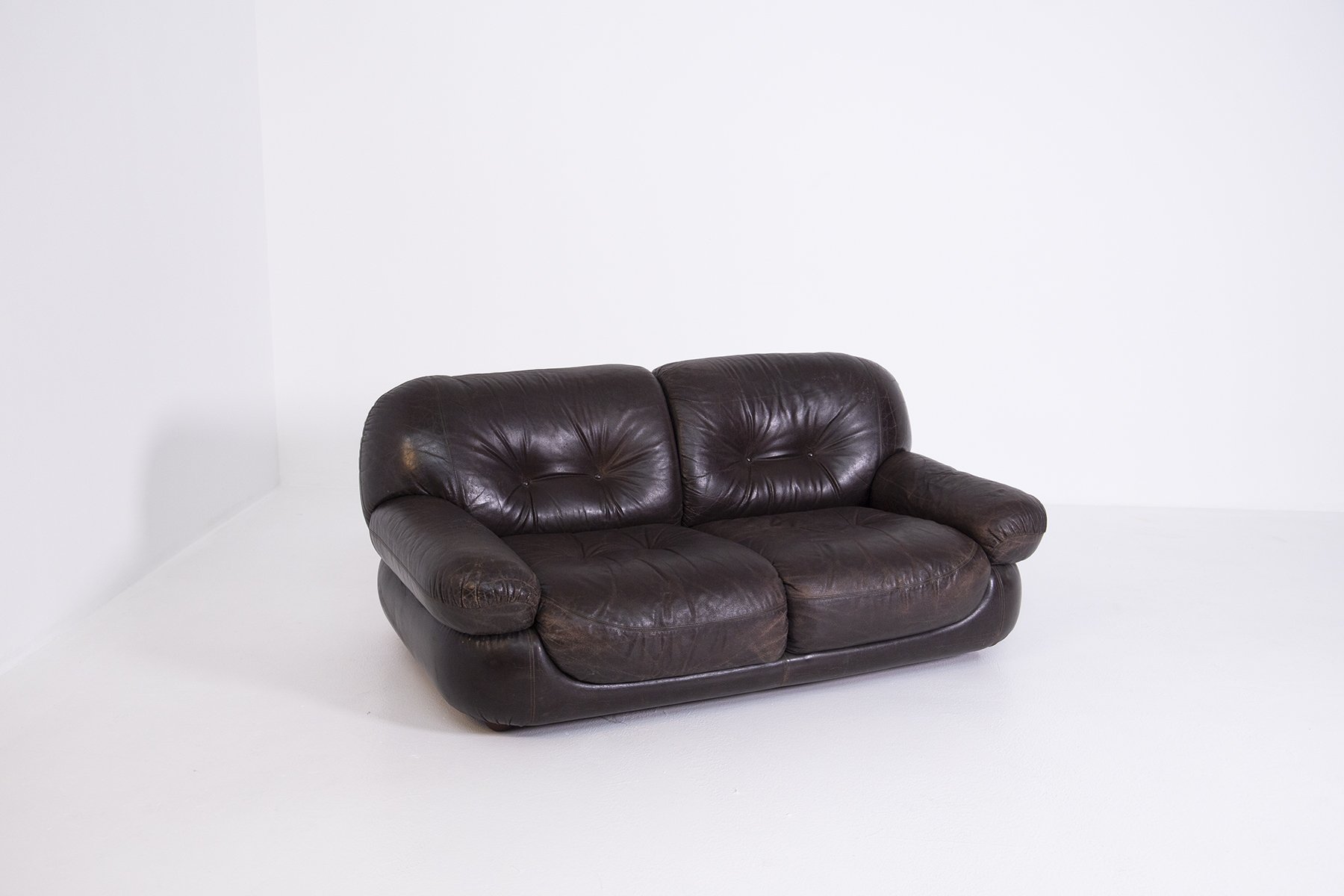 Divano a due posti in pelle marrone con piedini in legno. Manifattura italiana. Anni '70. Mis. Lung. cm. 170 Alt. cm. 75 Prof. cm. 100 ca.