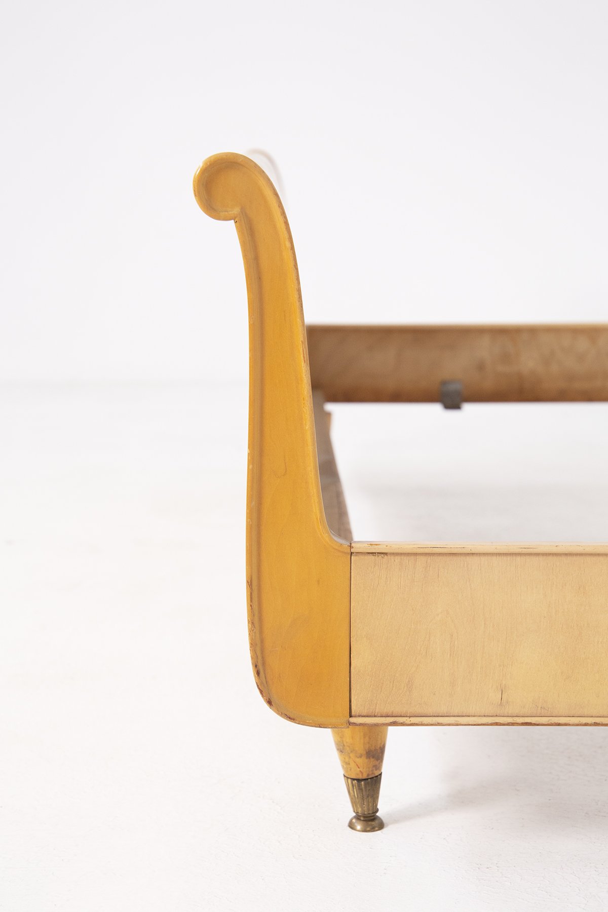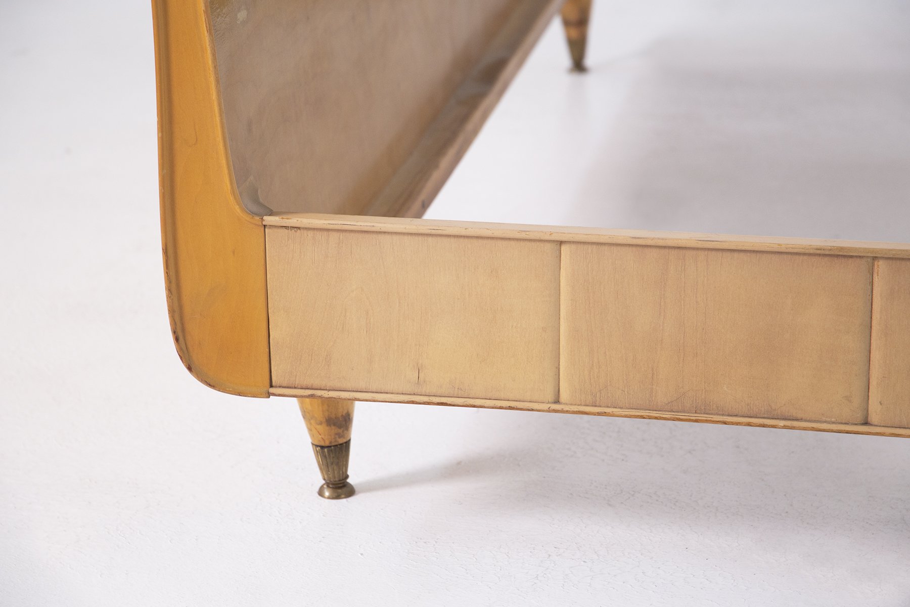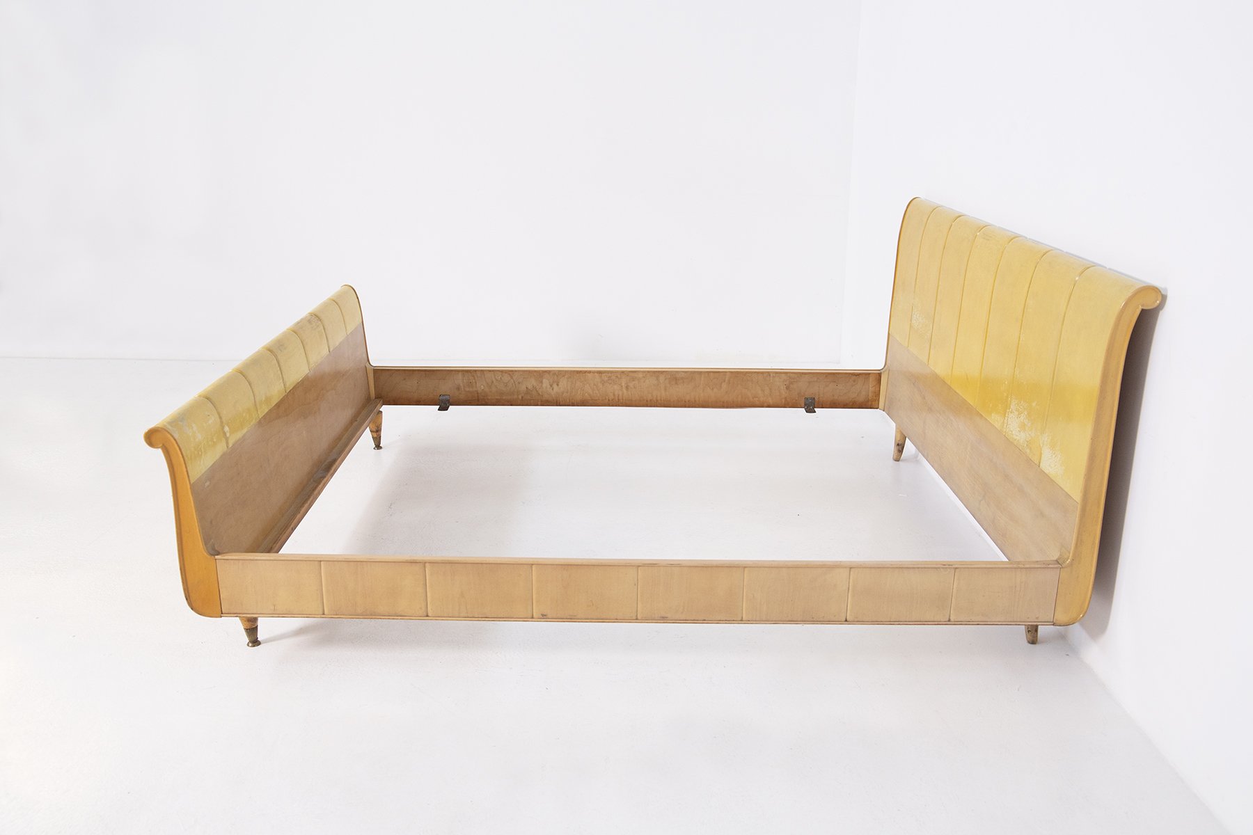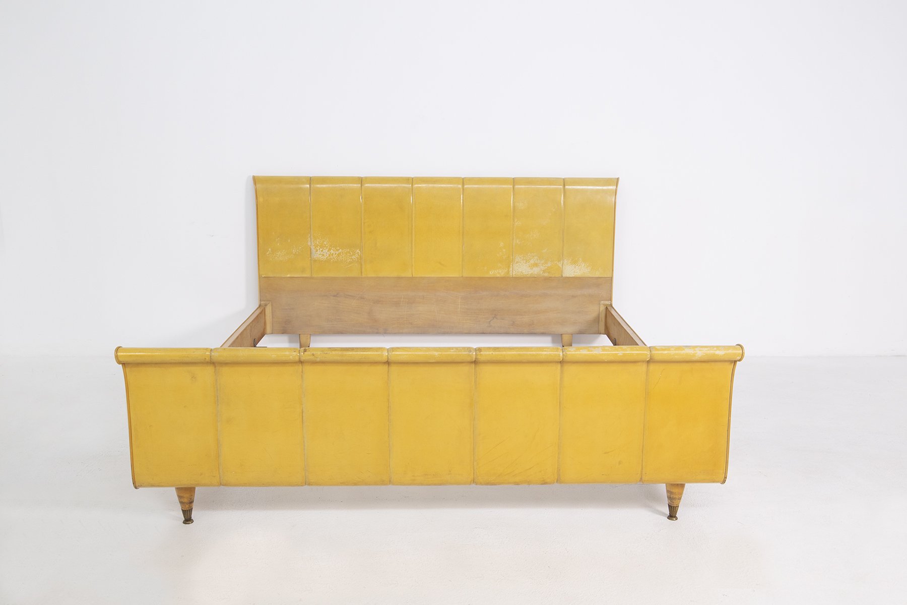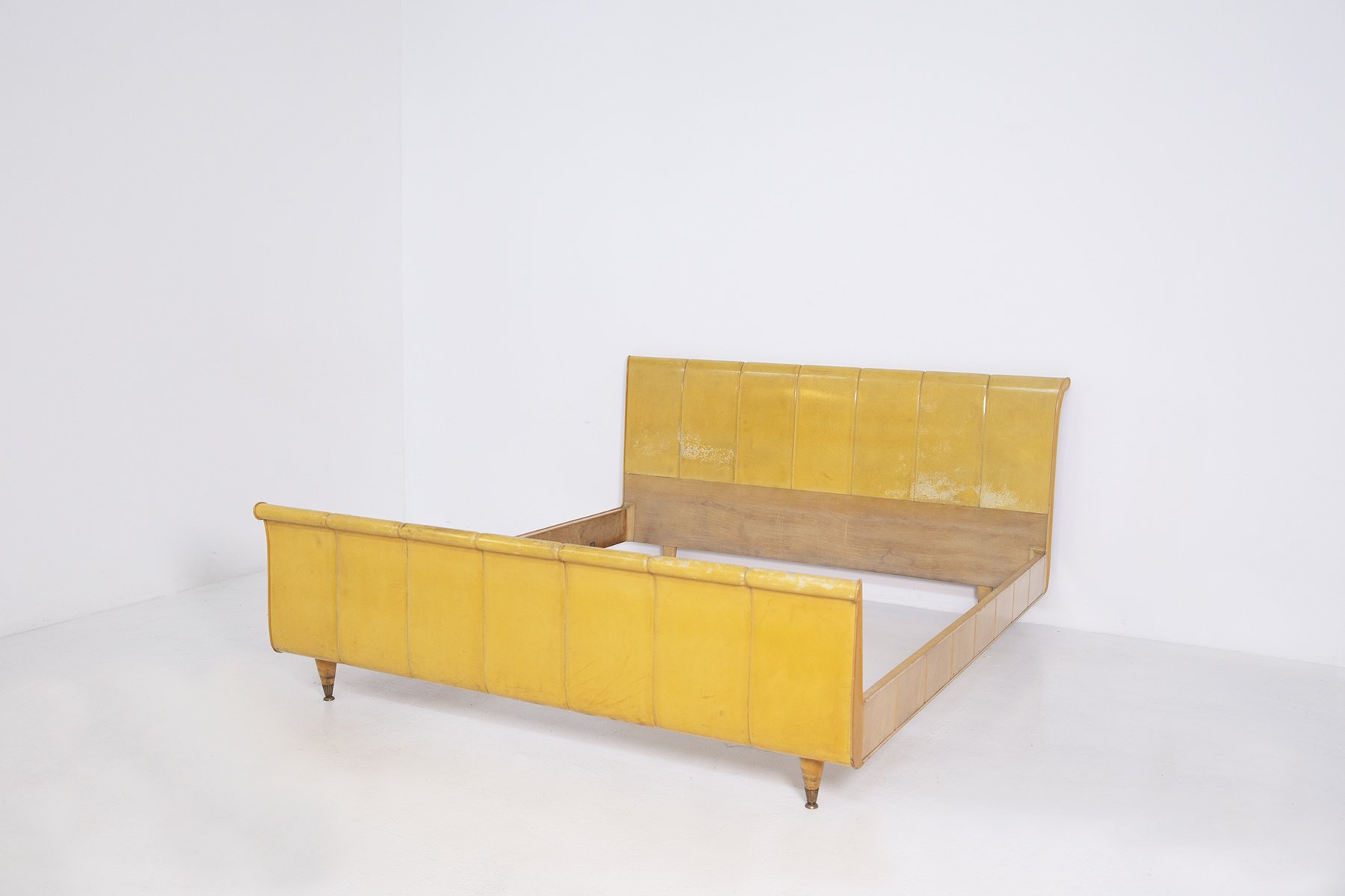PAOLO BUFFA (Milano 1903-1970). Letto in legno e pergamena gialla. Anni '50. Segni d'usura. Esempio simile pubblicato su Arredamento Moderno 4 Serie Imm. 575 Mis. Lung. cm. 190 Alt. cm. 97 Prof. cm. 220 ca.
