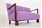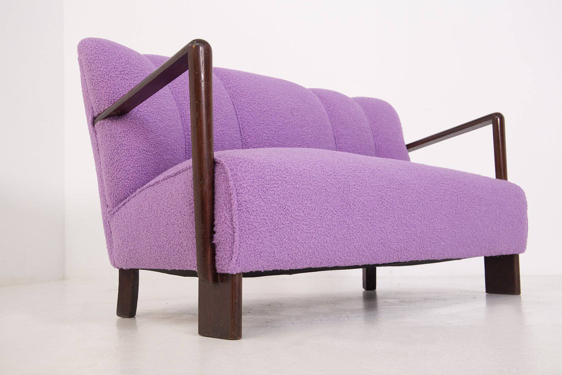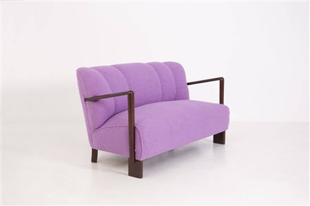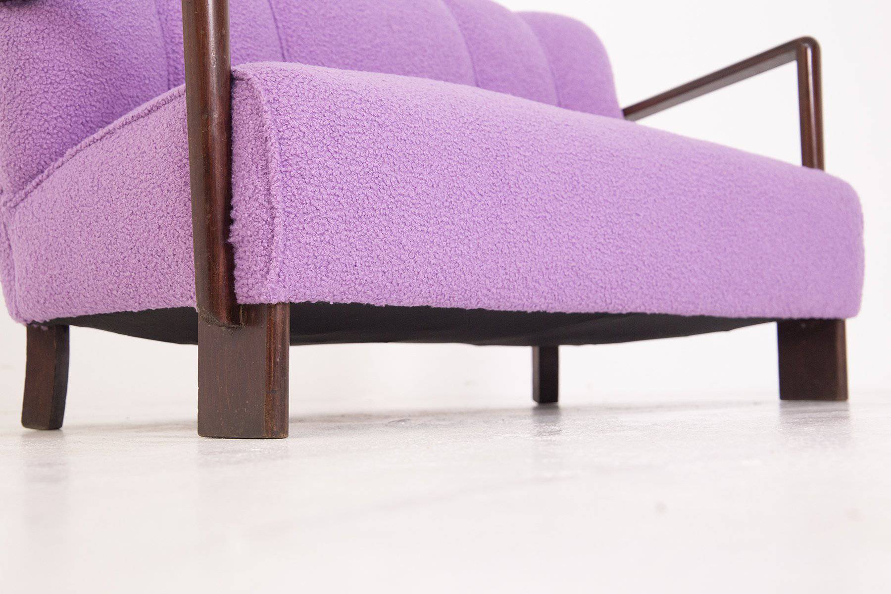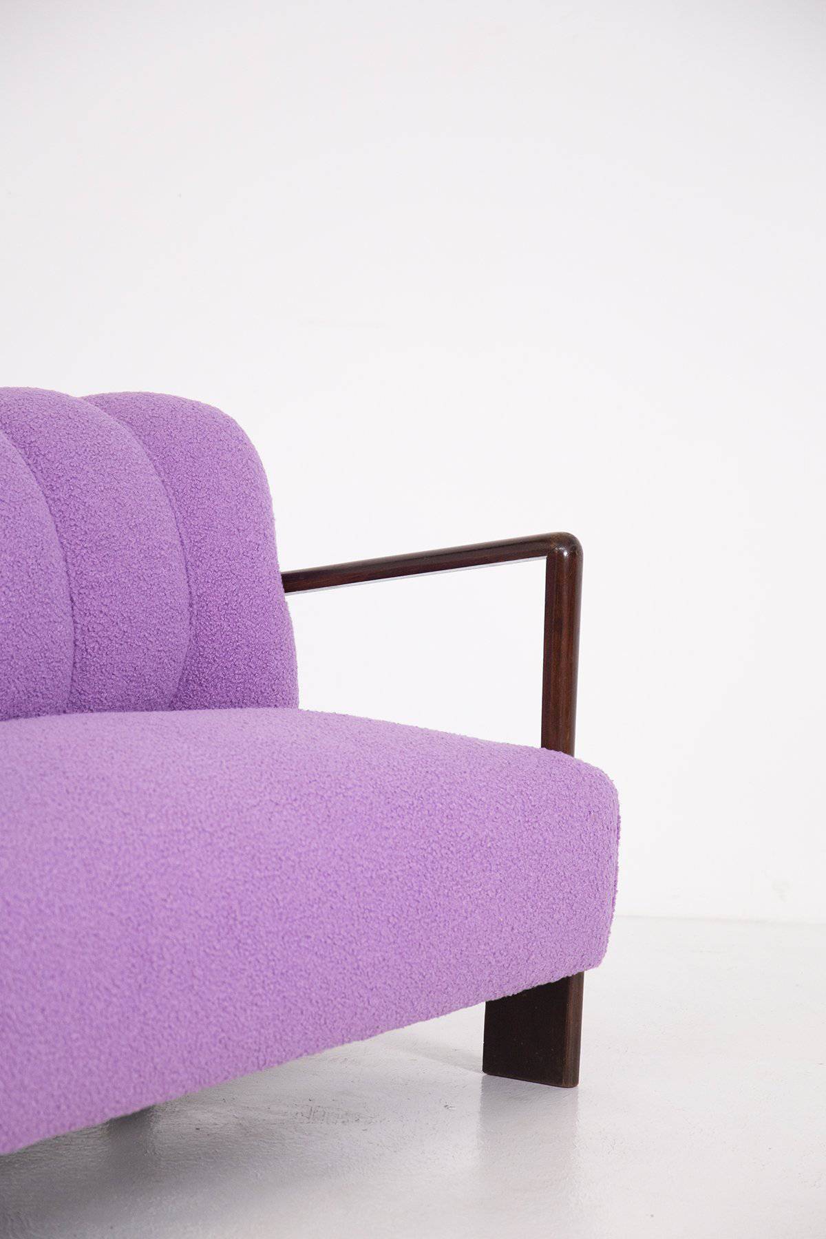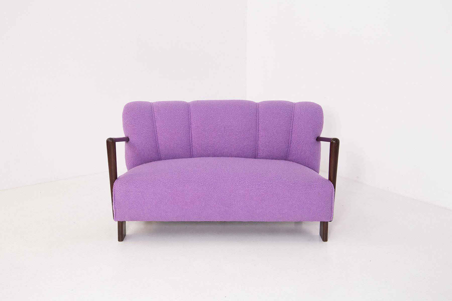 Divano a due posti con struttura in legno e seduta rivestita con tessuto bouclé viola. Manifattura italiana. Anni '50. Mis. Lung. cm. 139 Alt. cm. 78 Prof. cm. 70 ca.