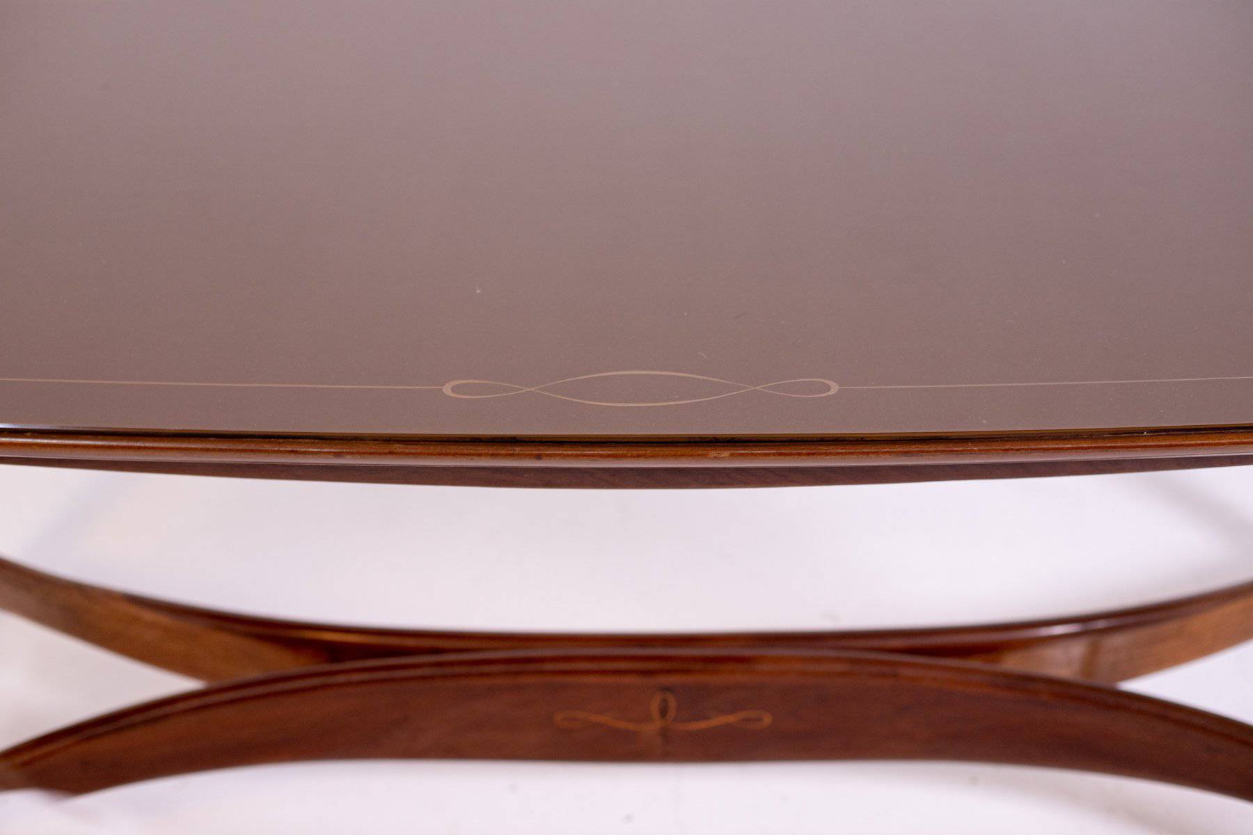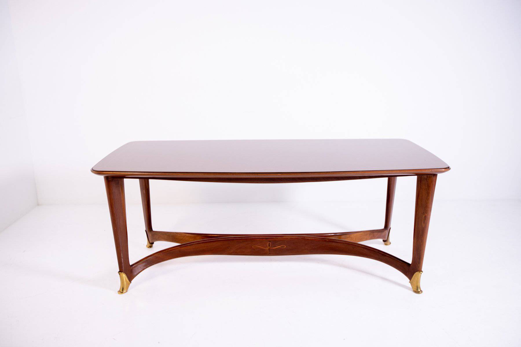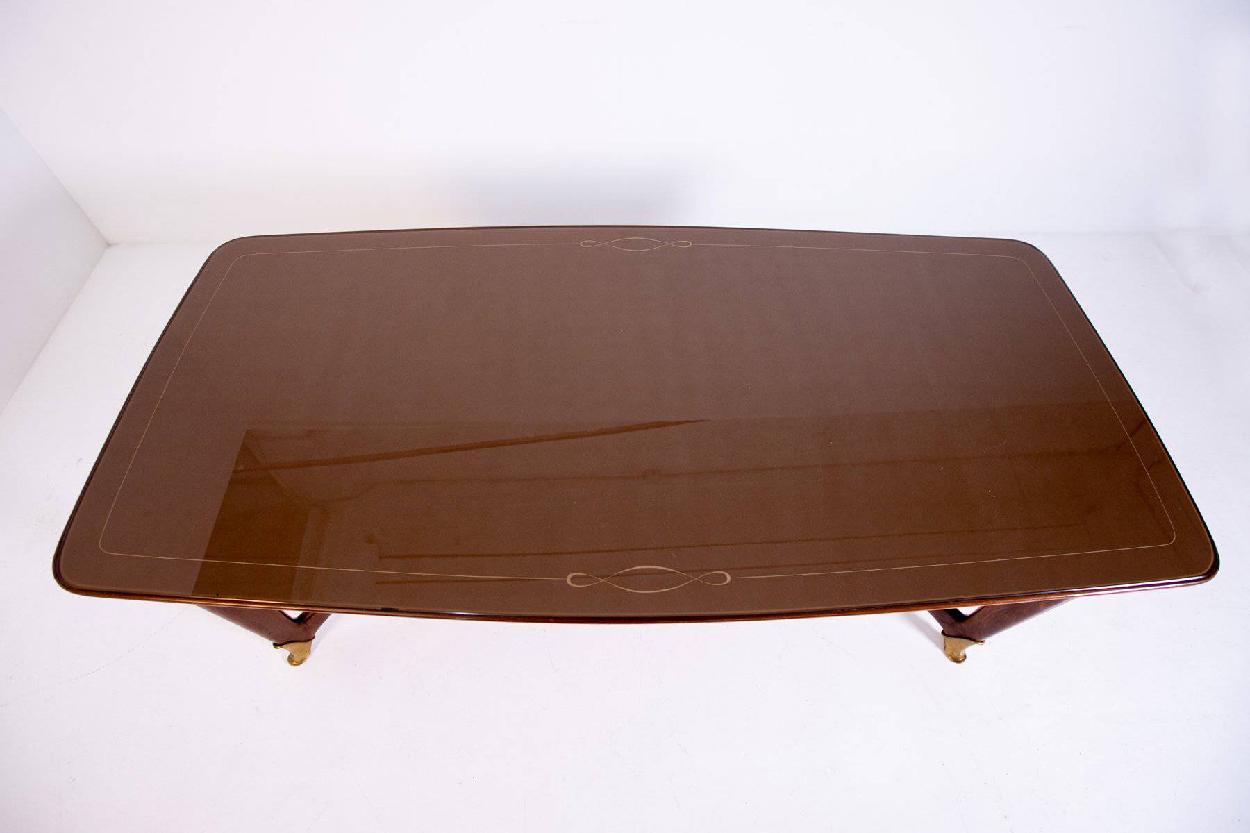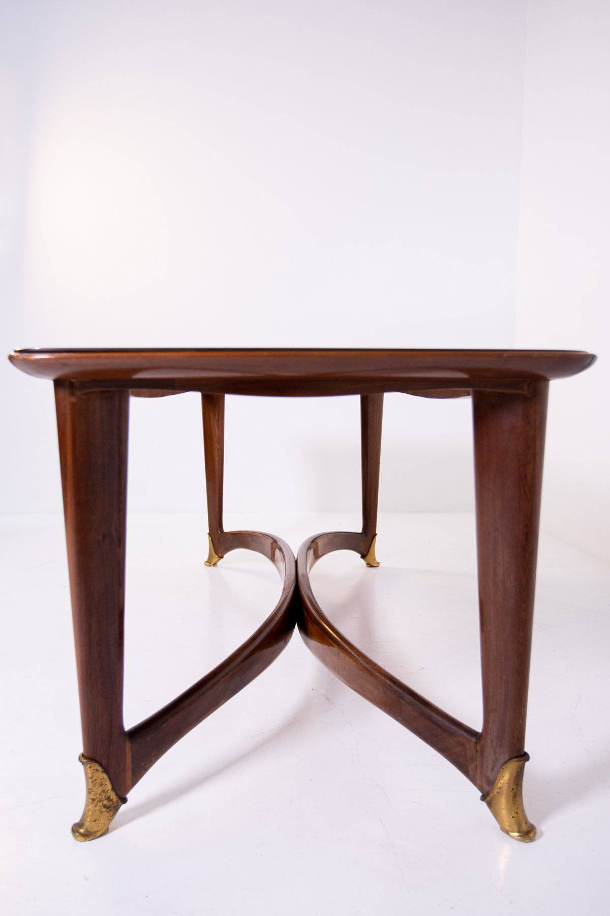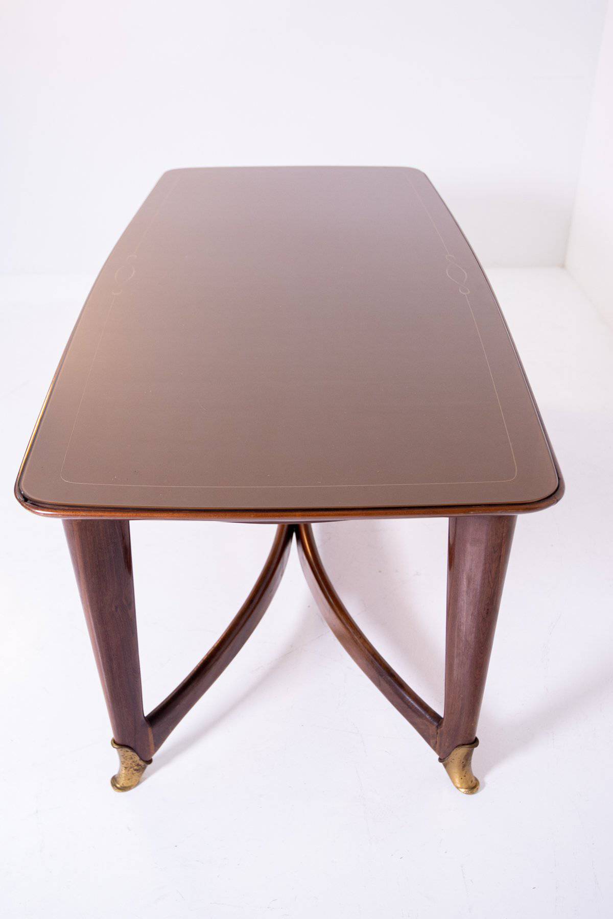 GUGLIELMO ULRICH (Milano, 1904-1977). Tavolo da pranzo in legno di noce con piedini in ottone e piano in vetro opalino. Anni '50. Esempio simile pubblicato nel libro di Ulrich. Mis. Lung. cm. 197 Alt. cm. 78 Prof. cm. 87 ca.