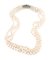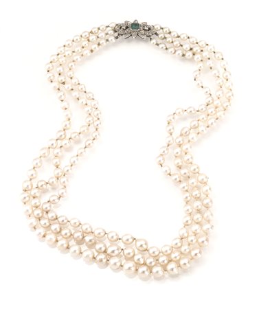 realizzata a tre fili di perle poste in gradazione diam da mm 5 a mm 10, fermatura sagomata in oro bianco traforato decorata in rose di diamante e centrata da uno smeraldo