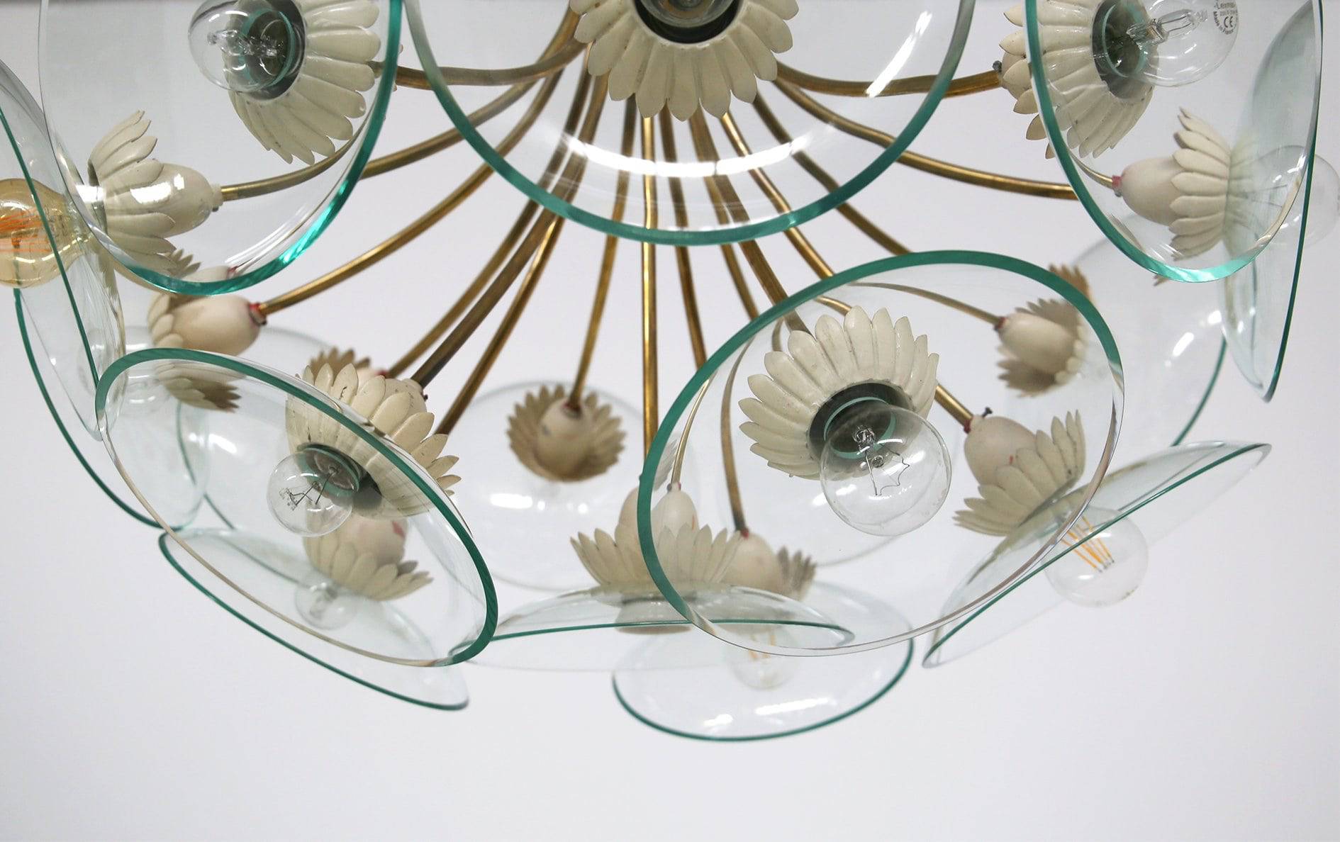 PIETRO CHIESA (Sagno, 1876 - Sorengo, 1959) per FONTANA ARTE. Lampadario sedici luci in ottone, alluminio cromato e cristallo. Anni '50. Esempio simile pubblicato in Roberto Aloi, Modern Furniture, quinta serie, Milano, 1952, fig. 206 e in Franco Deboni, Fontana Arte: Gio Ponti, Pietro Chiesa, Max Ingrand, Torino, 2012, fig. 34. Mis. Lung. cm. 85 Alt. cm. 90 Prof. cm. 85 ca.