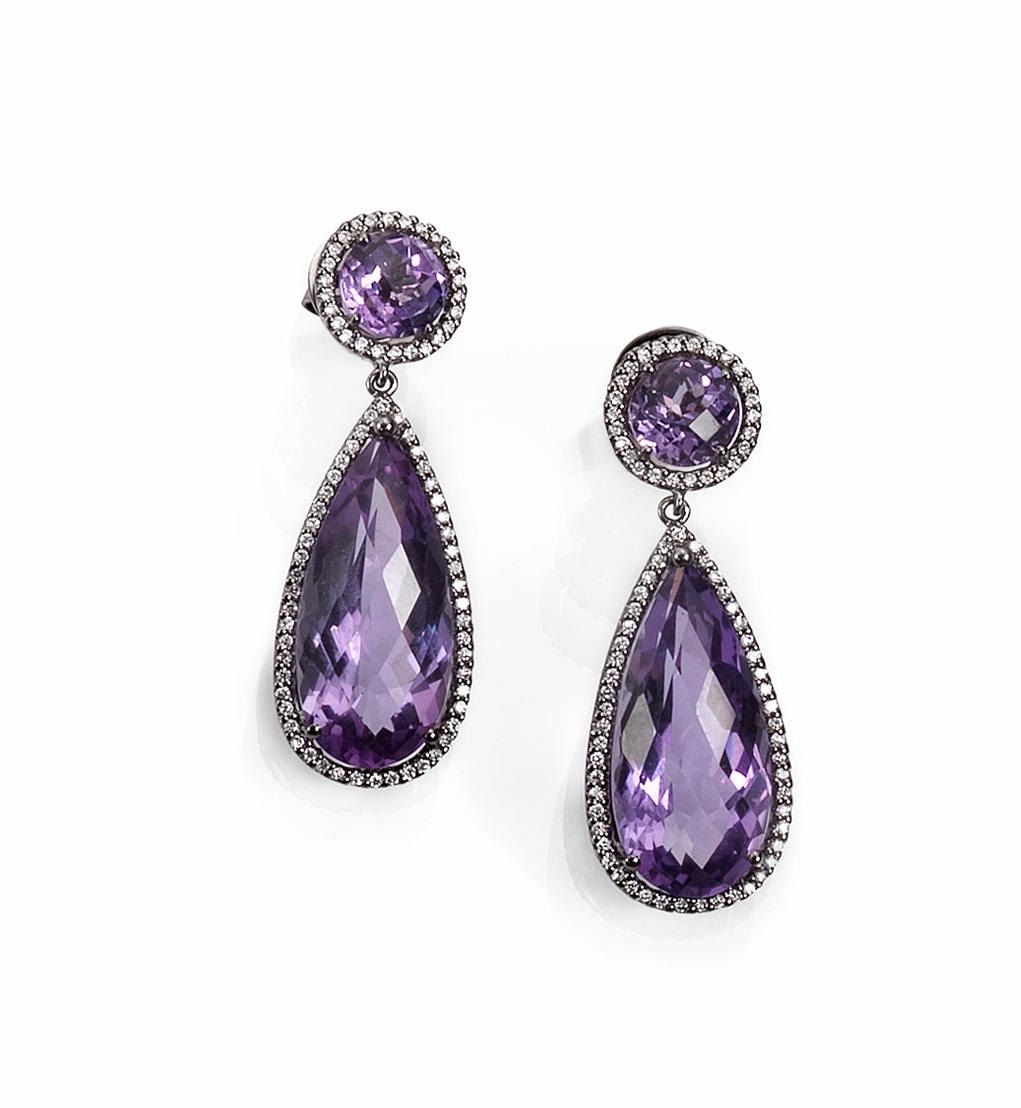 ciascuno formato da un'ametista circolare di taglio briolettato montata entro una cornice in brillanti a cui è sopsesa un'ametista a goccia analogamente montata