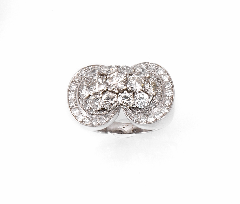 montatura bombata con motivo a doppia C in pavè di brillanti riunita da tre linee di brillanti per complessivi ct 2,50 circa, g 14