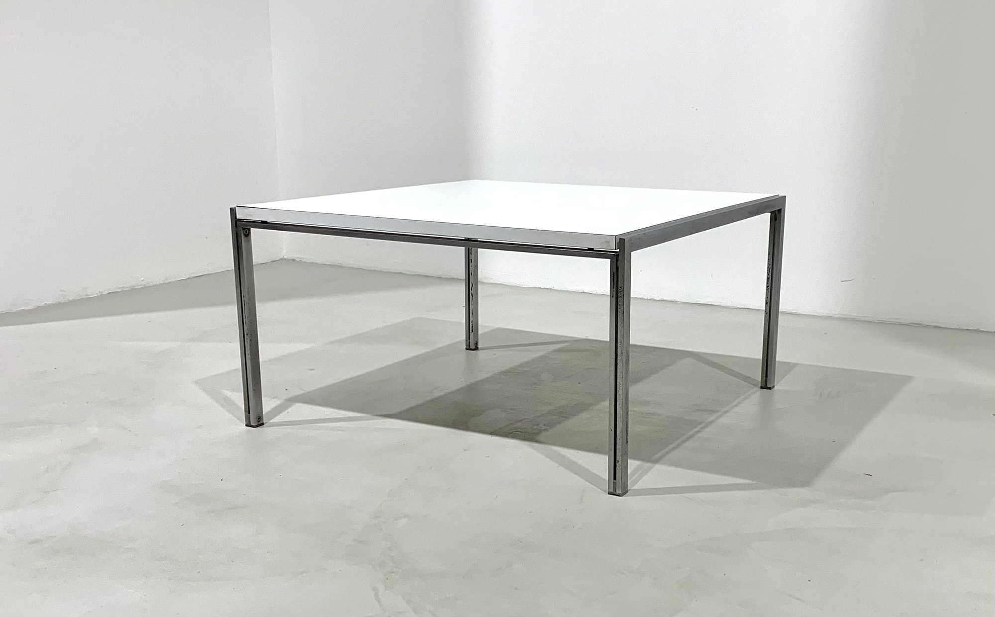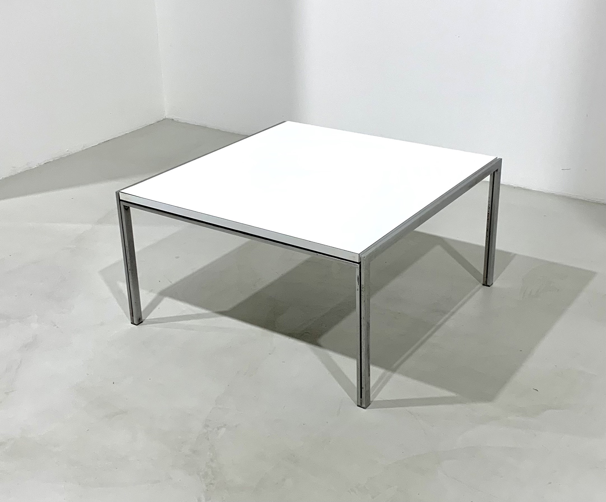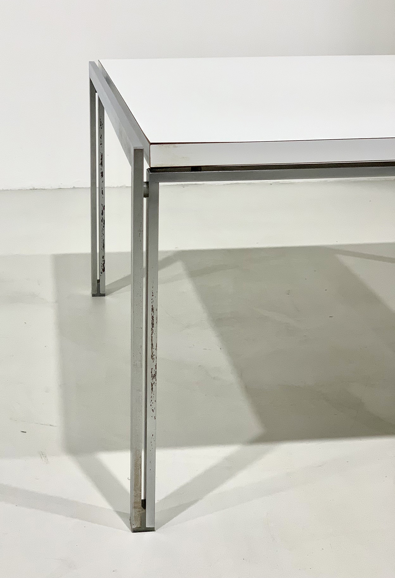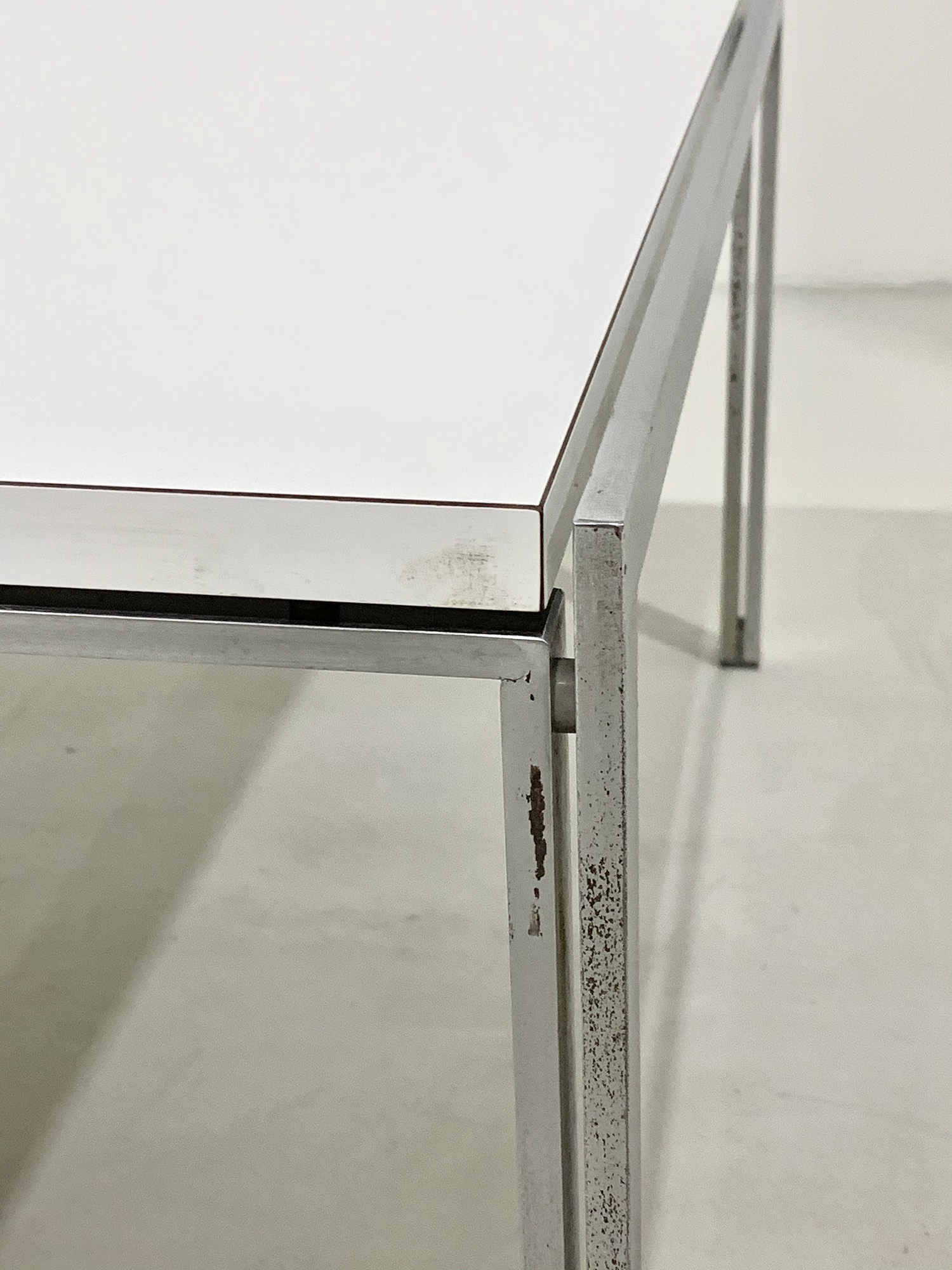 Tavolino in acciaio cromato e legno laminato. Manifattura italiana. Anni '70 Mis. Lung. cm. 80 Alt. cm. 43 Prof. cm. 80 ca.