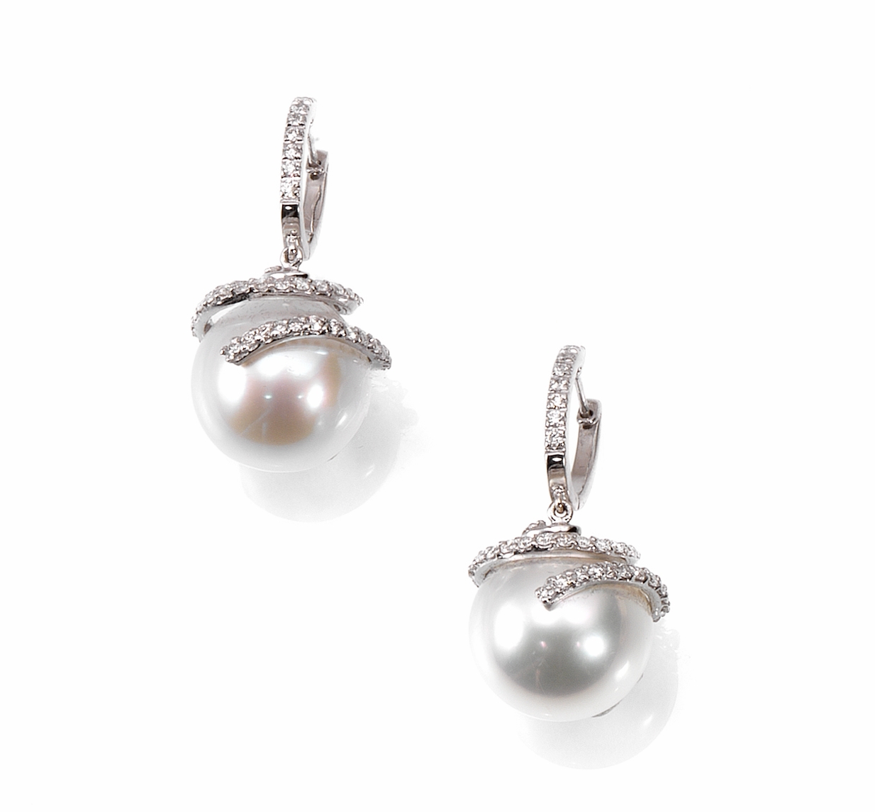ciascuno formato da un cerchietto ovalizzato decorato da una linea di brillanti a cui è sospesa una perla diam. mm 11 montata su un motivo a spirale in brillanti per complessivi ct 1,70 circa