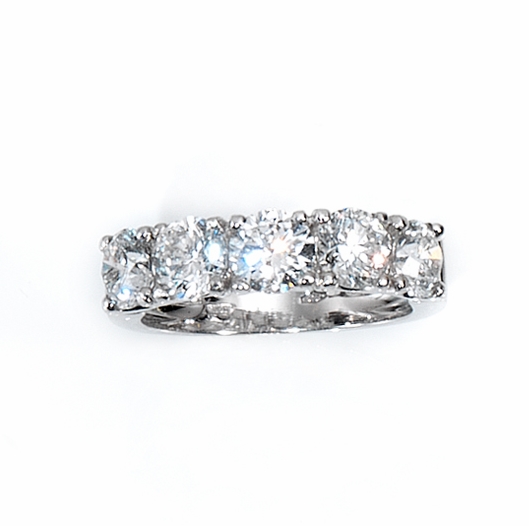 Anello in oro bianco e diamantila parte superiore decorata da cinque...