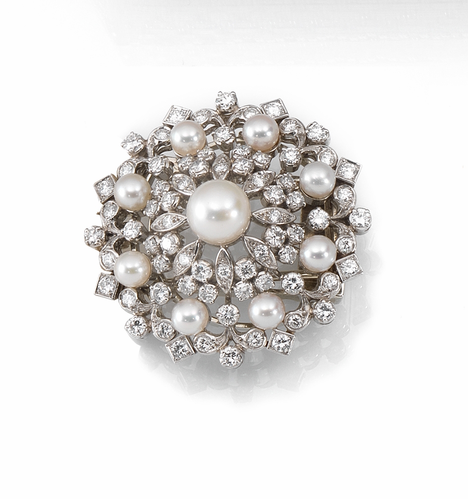 Spilla in oro bianco, diamanti e perledi forma circolare, disegnata come una...