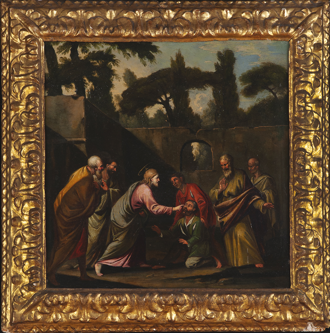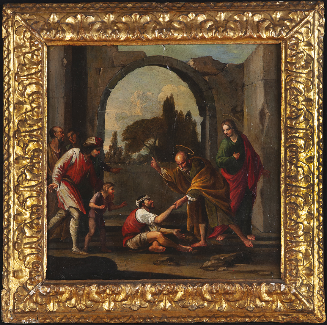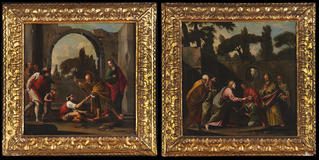 This pair of paintings on slate depicts two crucial miracles: the healing of the blind man by Jesus and the healing of the cripple by his apostl