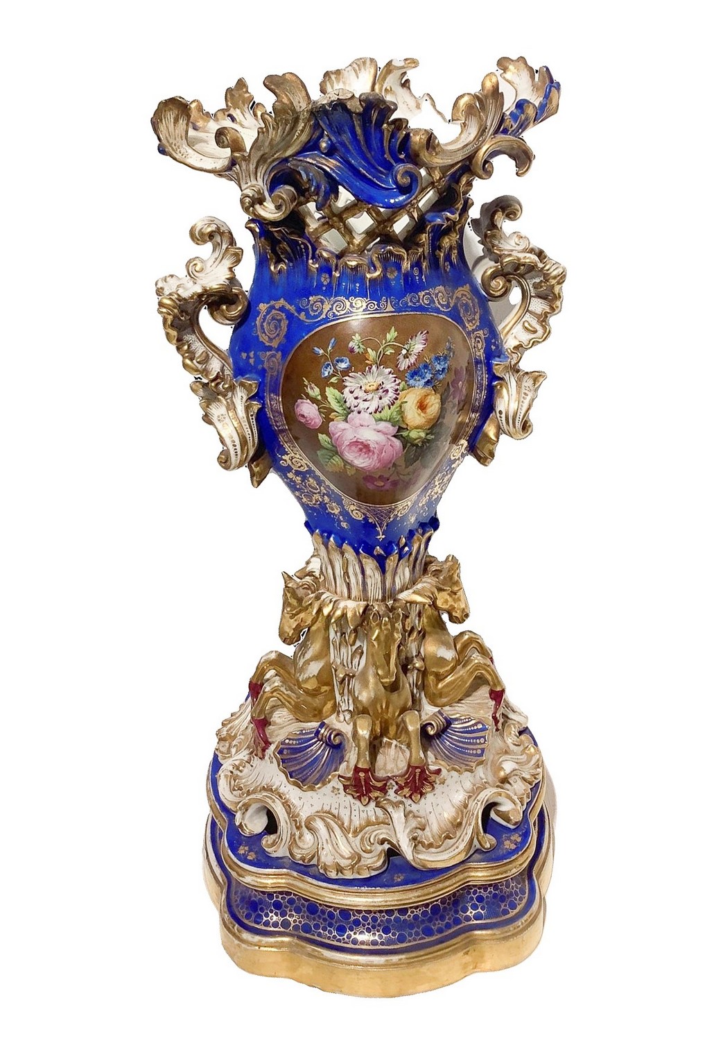 Vaso in porcella policroma, manifatture Jacob Petit, Parigi.. Importante vaso neo -rocaille, sostenuto da 4 cavalli; poche perdite minori e usure. Marchio all'interno della base H cm 57 XIX secolo, circa 1850