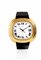 Cassa oversize a cuscino con fondello chiuso da quattro viti, lunetta gradinata, vetro zaffiro. Quadrante bianco con numeri romani, datario ad ore 3, lancette a foglia, secondi al centro. Movimento al quarzo. Cinturino in pelle con fibbia ad ardiglione in oro giallo 18 kt Piaget. Dim. mm 45x40