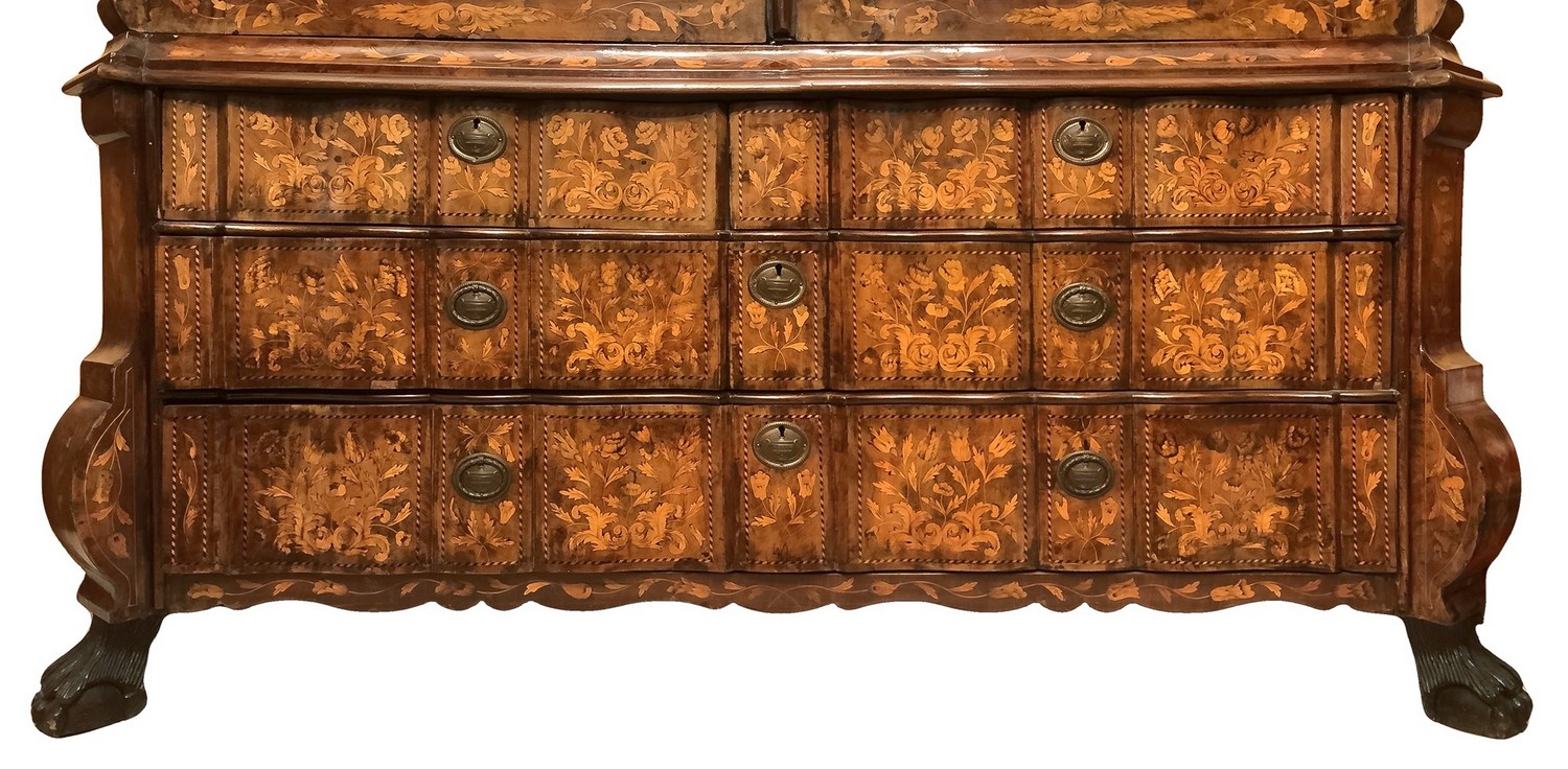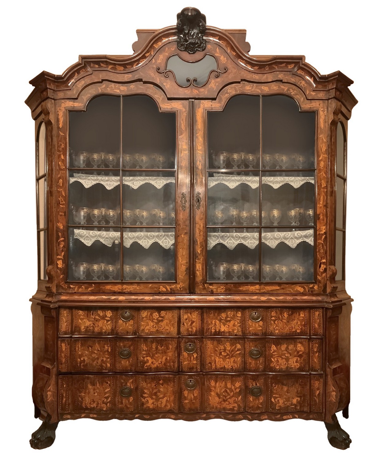 Importante cristalliera olandese interamente intarsiata, a due ante superiori con vetri e sei cassetti alla base.. Intarsi in legni chiari sia sul fronte sia sui laterali. H cm 250. Larghezza cm 210. Profondità cm 55 XVIII secolo