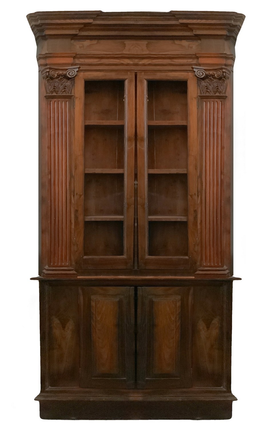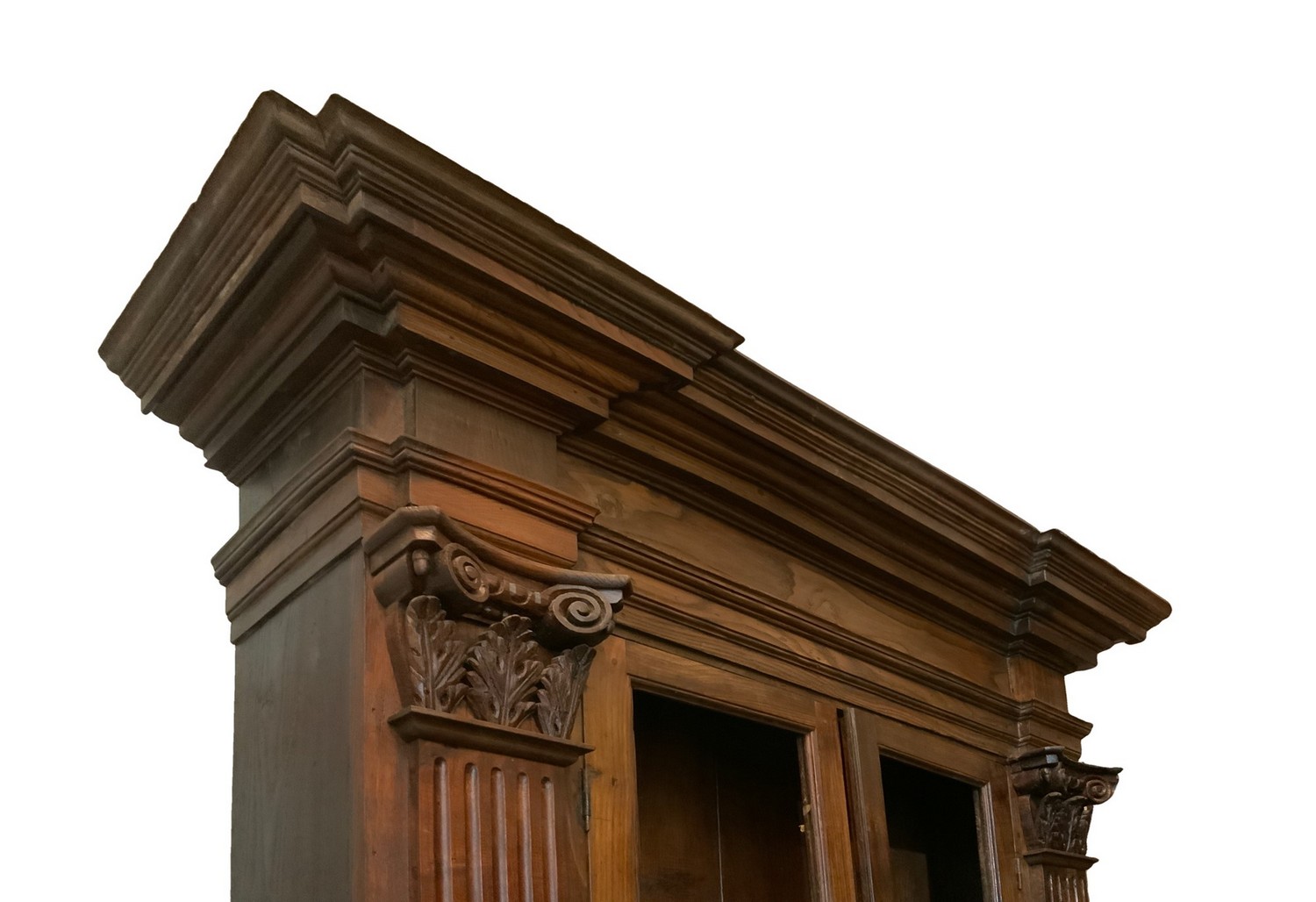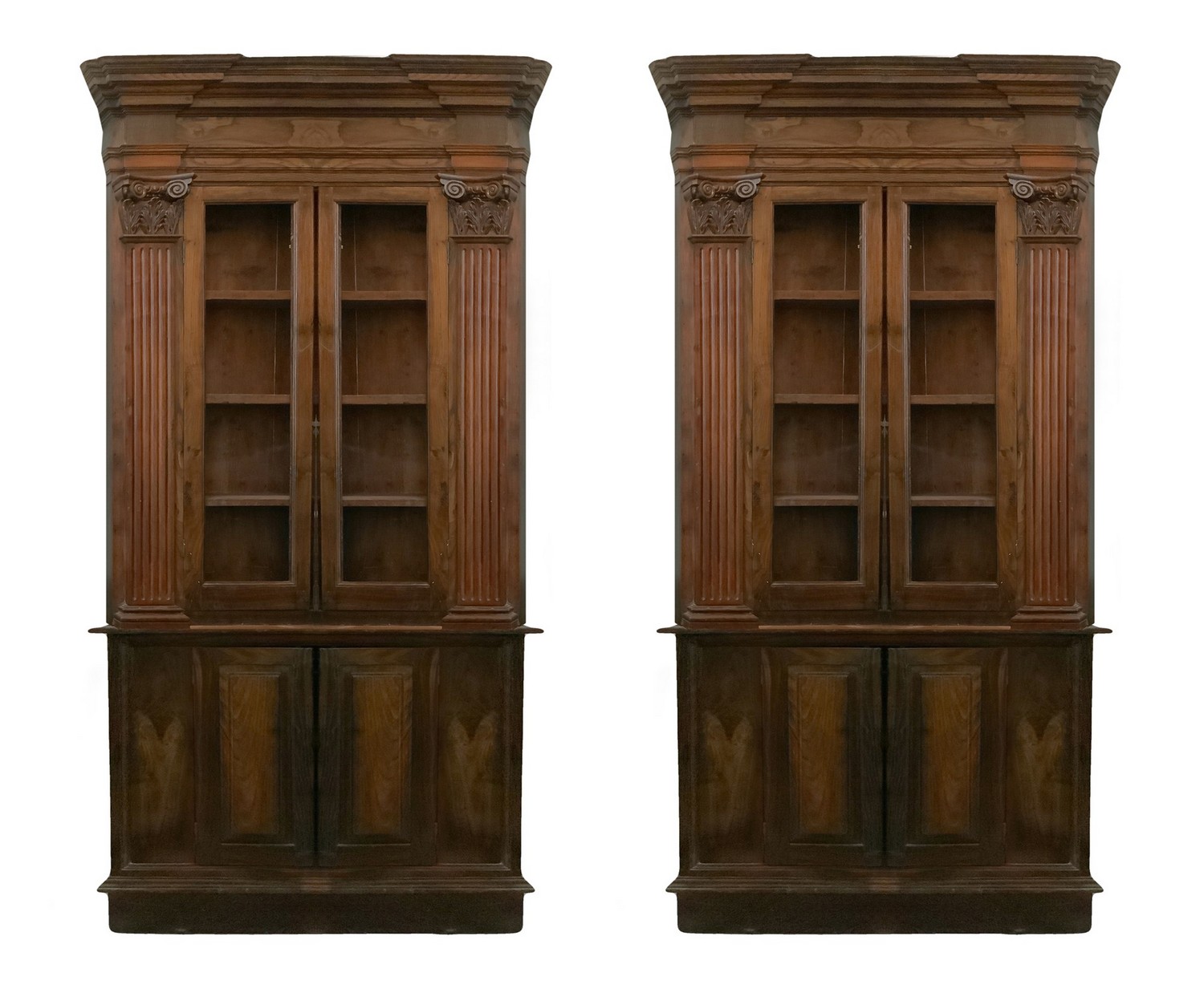 Coppia di librerie. Mobile a doppio corpo, parte superiore con sportelli provvisti di vetri, ai lati due lesene sormontate da capitelli corinzi, a cappello una cornice doppio ordine aggettante aldilà della larghezza del mobile, parte anteriore con sportelli chiusi, provenienza Sicilia. Da restaurare un lato 260x115x35 cm XVIII secolo