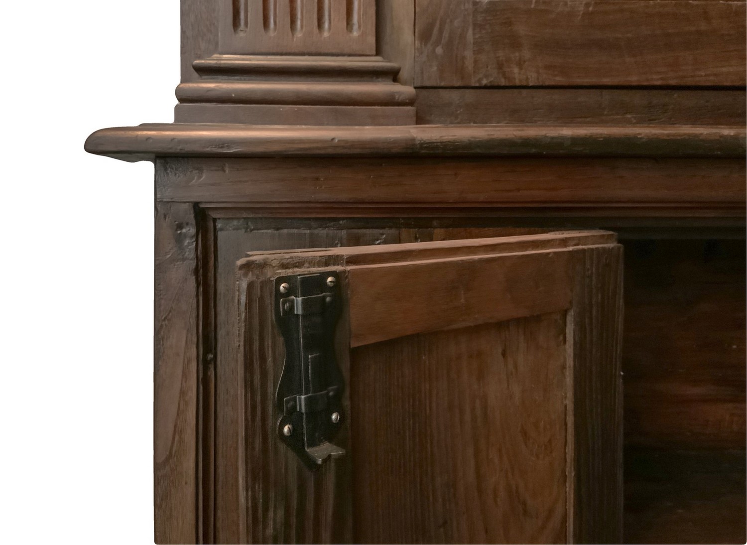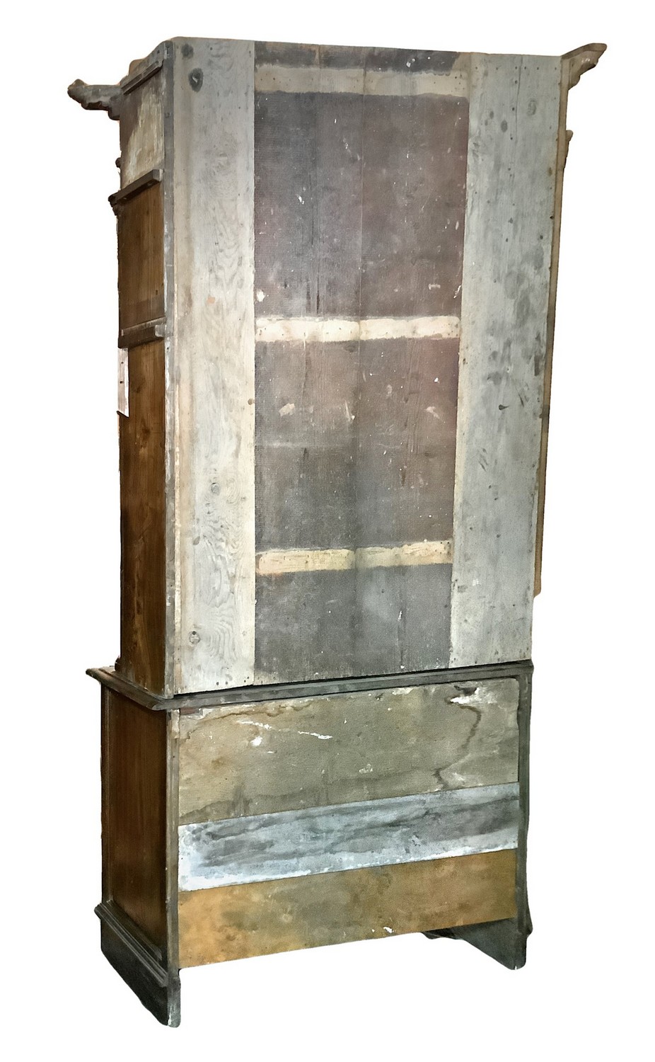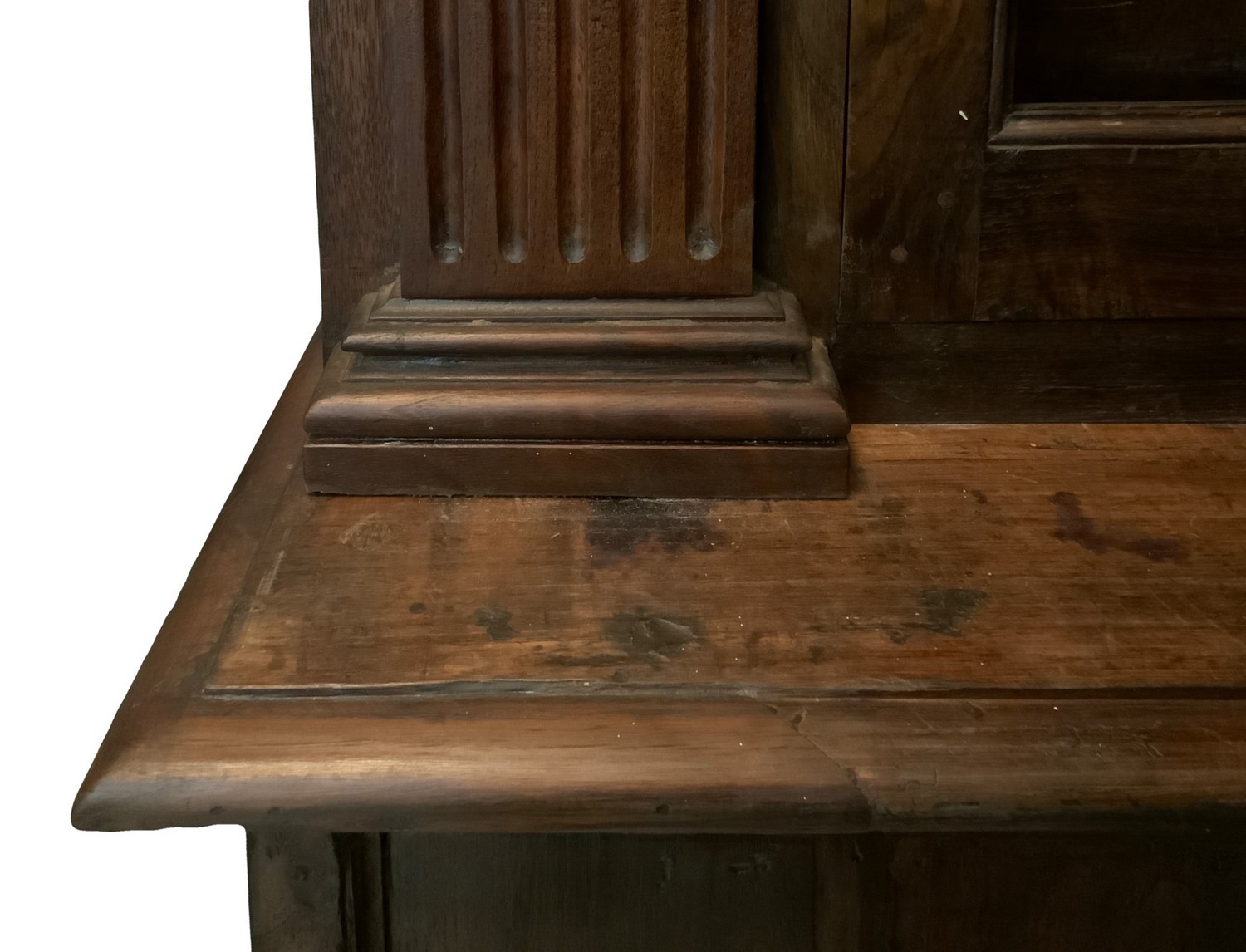 Coppia di librerie. Mobile a doppio corpo, parte superiore con sportelli provvisti di vetri, ai lati due lesene sormontate da capitelli corinzi, a cappello una cornice doppio ordine aggettante aldilà della larghezza del mobile, parte anteriore con sportelli chiusi, provenienza Sicilia. Da restaurare un lato 260x115x35 cm XVIII secolo