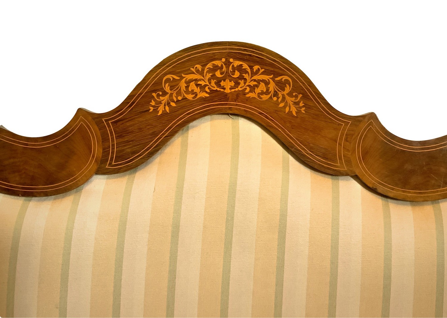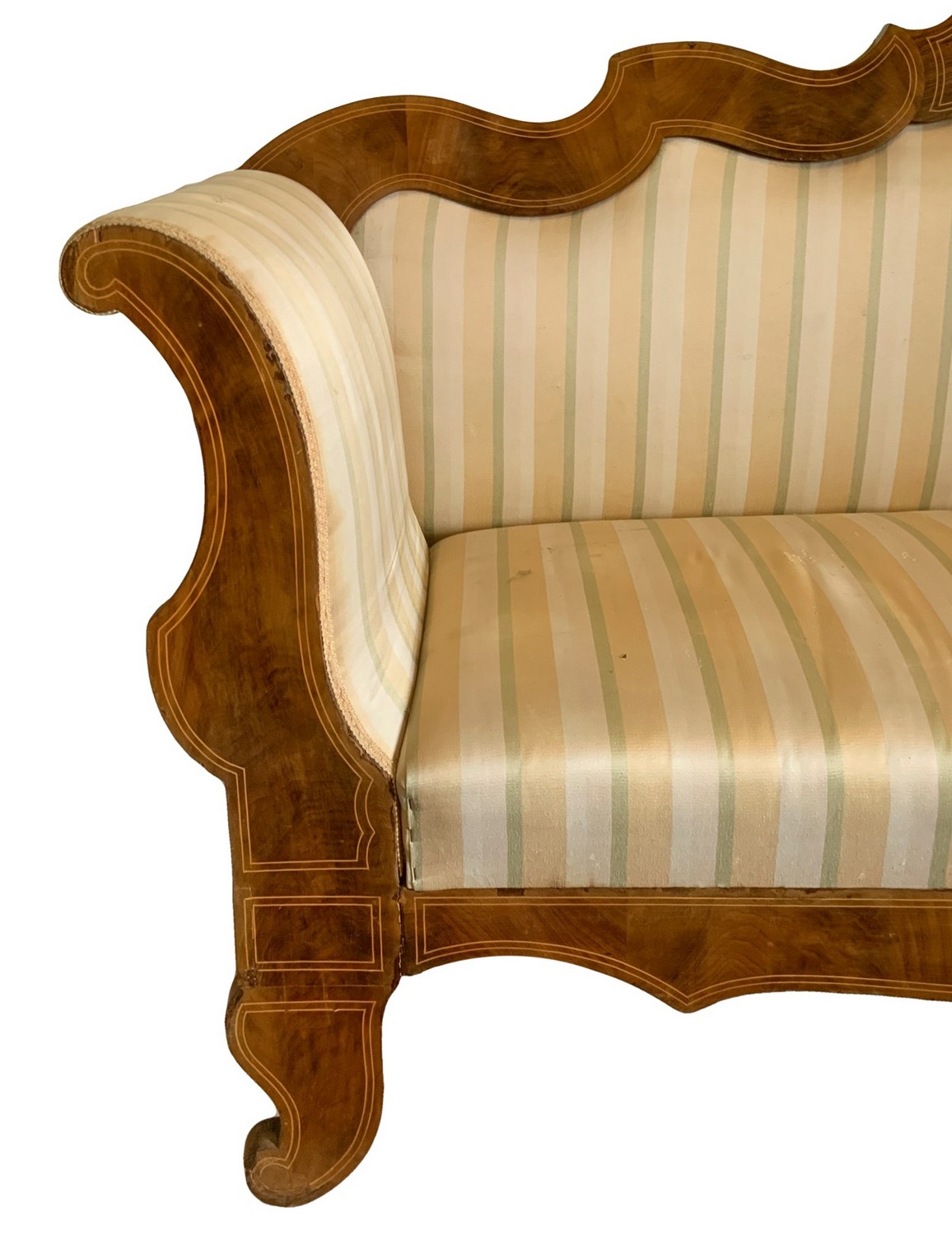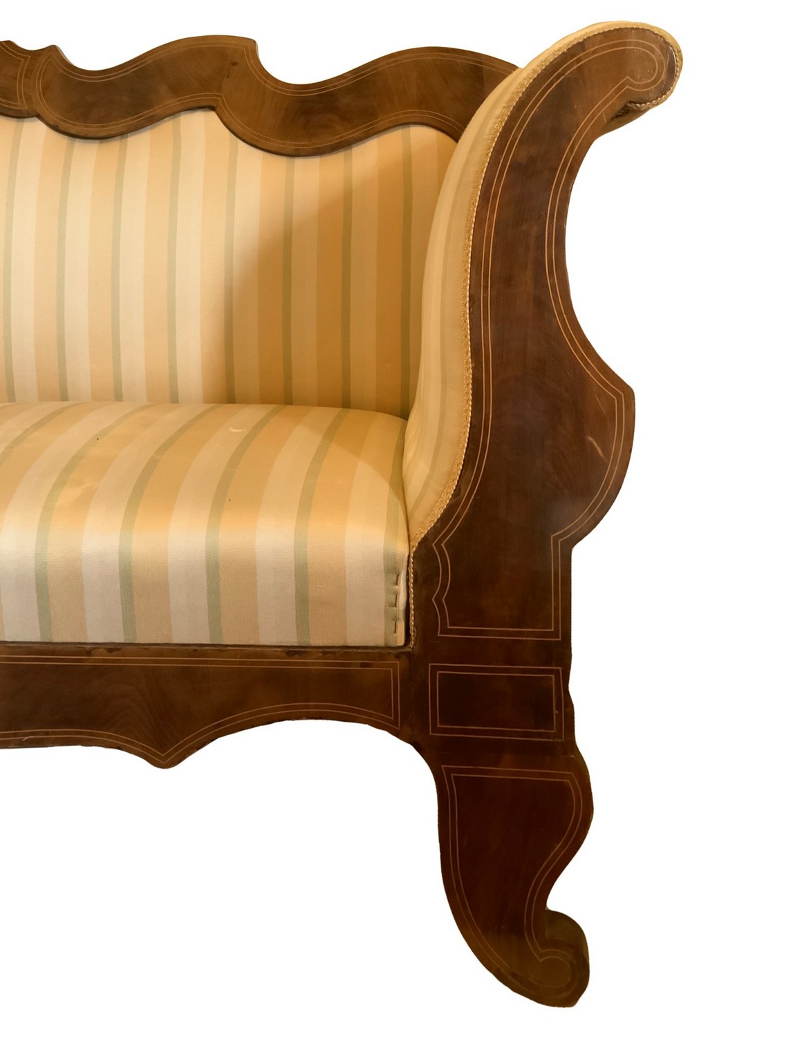 Divano Carlo X. Intarsi in legno chiari alla spalliera e perfilato sul fronte e sul bracciolo. Provenienza Sicilia. H 90 cm, larghezza 215 cm, profondità 57 cm XIX secolo
