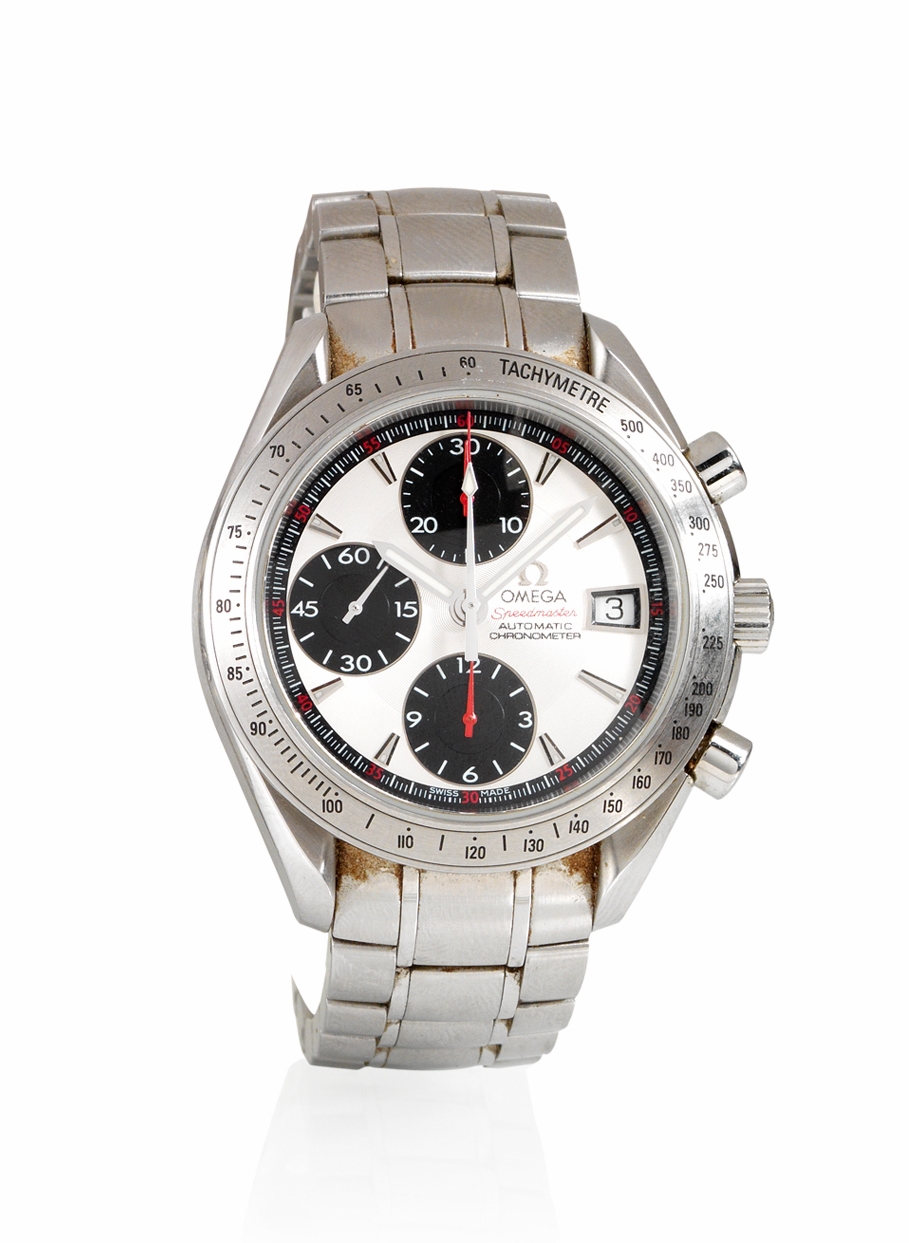 Cassa in tre corpi con fondello e corona a vite, fondello con logo Speedmaster a rilevo, pulsanti cronografici a pompa, lunetta graduata con scala tachimetrica. Quadrante argentè inciso a cerchi concentrici, anello periferico dei secondi nero, indici a punta di freccia applicati, datario ad ore 3, contatori neri ad ore 6,9 e 12 rispettivamente delle 12h, secondi continui e 30 min, lancette a bastone con inserto in materiale luminescente, secondi cronografici al centro. Movimento a carica automatica. Bracciale a maglie in acciaio satinato con chiusura deployante. Diam. mm 40