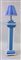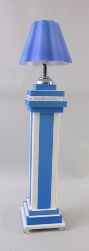Lampada da tavolo con fusto in metallo cromato e paralume in vetro azzurro, poggiante su colonna in plastica bianca e celeste a base quadrata. Alt. cm152 (lievi difetti)