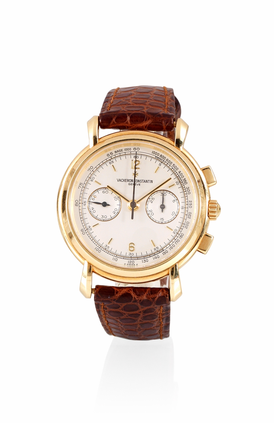 Cassa in oro giallo, fondello con oblò in vetro zaffiro sul movimento, anse curve, pulsanti cronografici rettangolari, lunetta inclinata. Quadrante argentè con scala tachimetrica periferica, numeri arabi 6 e 12 e indici a bastone applicati oro, due quadranti ausiliari rispettivamente ad ore 3 ed ore 9 con registro dei 30 minuti e secondi continui, lancette a bastone oro, lancetta dei secondi cronografici nera al centro. Movimento a carica manuale calibro 1140. Cinturino in pelle e fibbia ad ardiglione con croce di Malta Vacheron in oro giallo 18 kt. Diam. mm 36