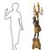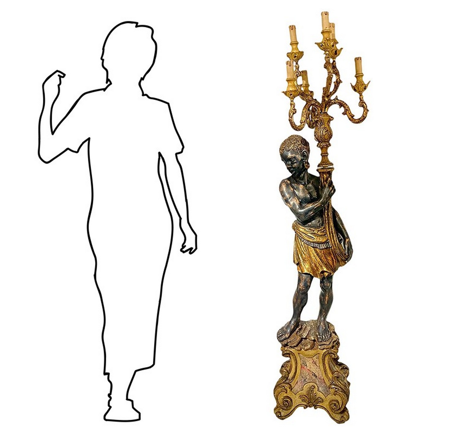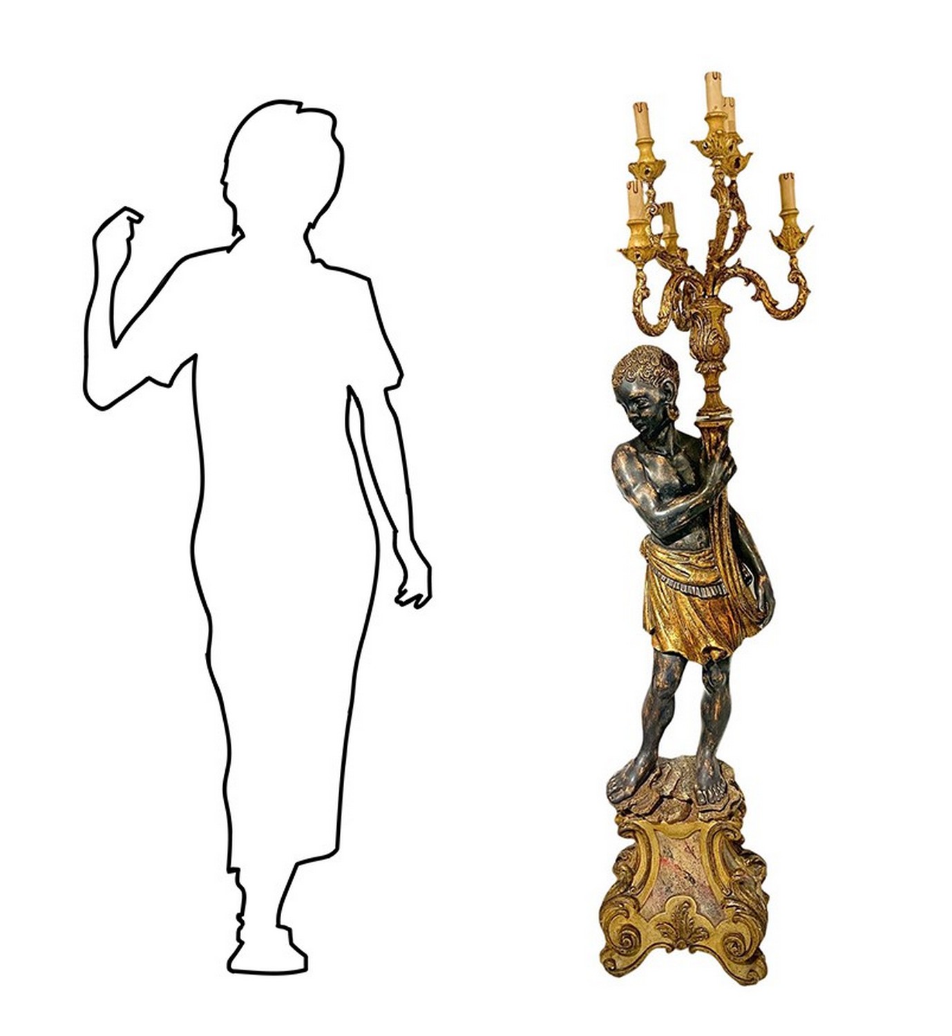Grande candeliere da terra in legno raffigurante moro. Candeliere a 6 luci.. H 175