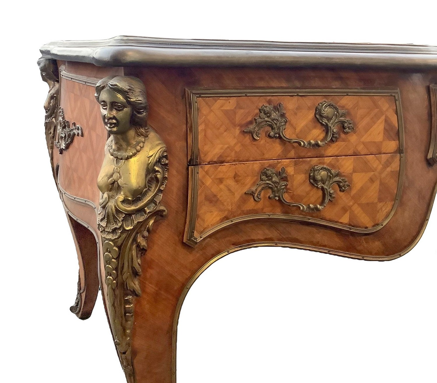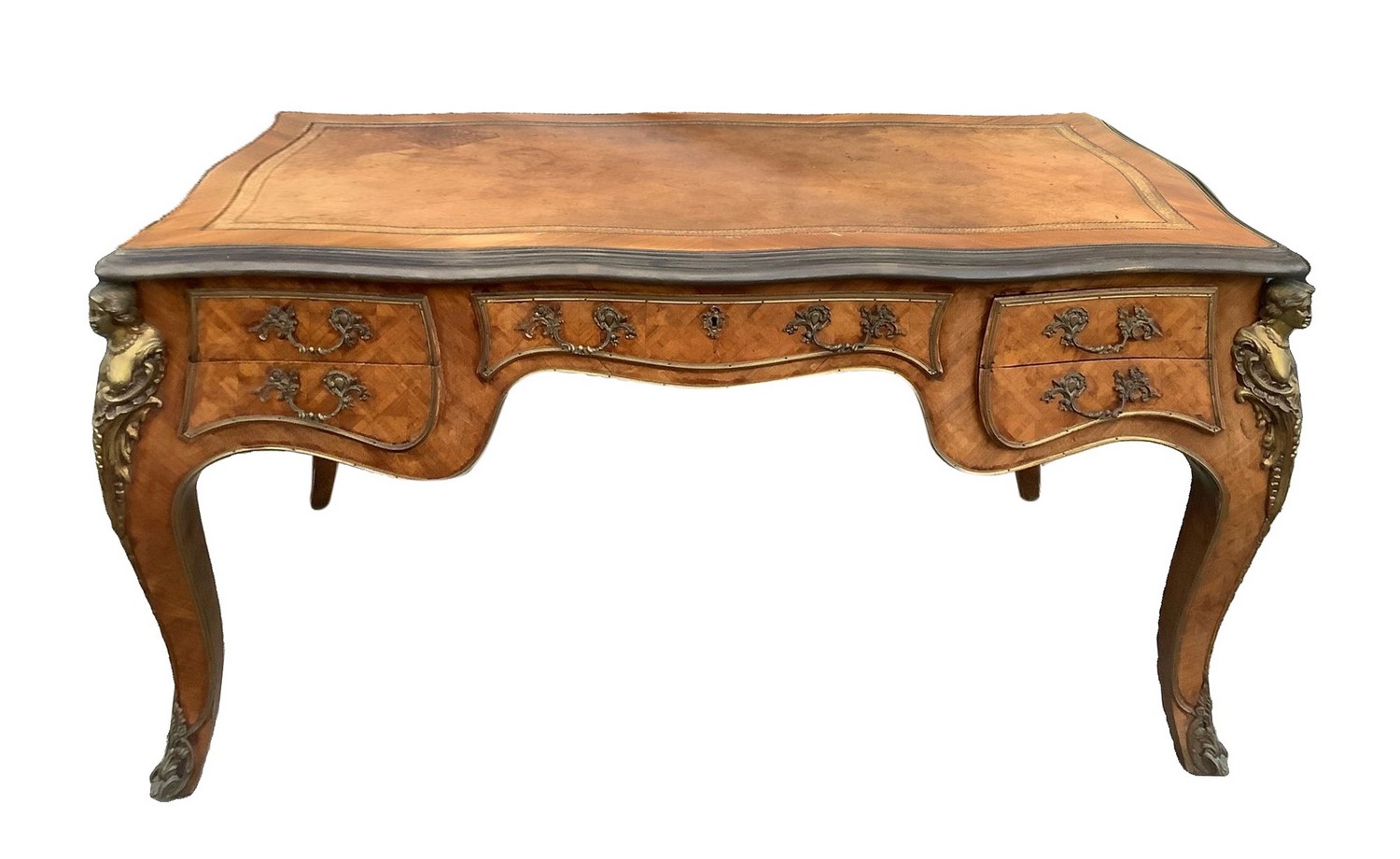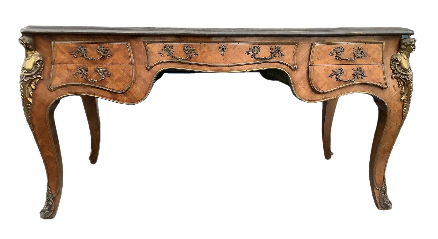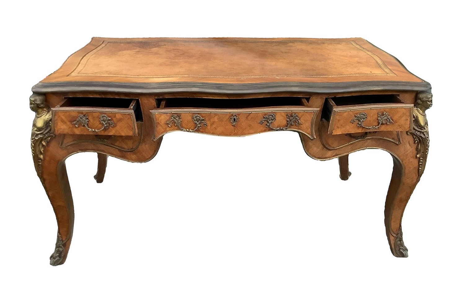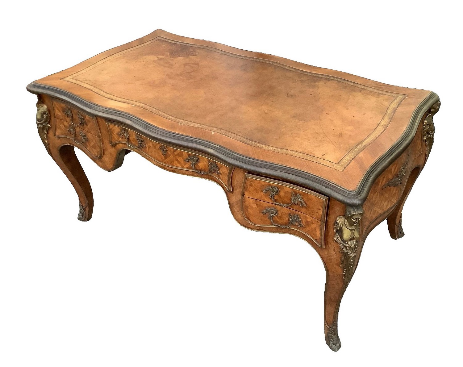 Scrittoio, Bureau plat. In legno bois de rose, con bronzi in ottone dorato, piano in pelle. H 79 cm 160x85. Inizi XX secolo