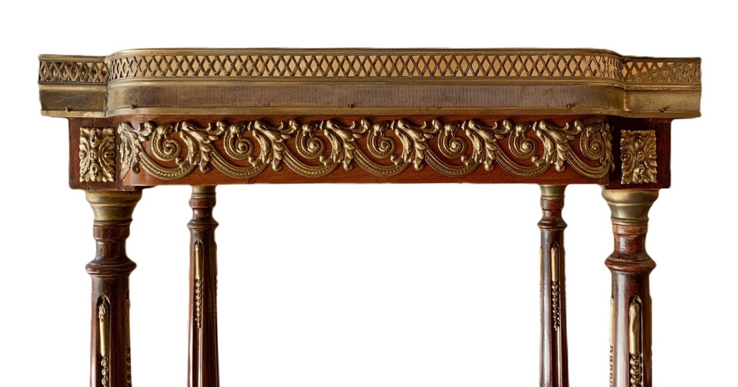 Tavolino con struttura in legno , con ottoni e marmo al piano.