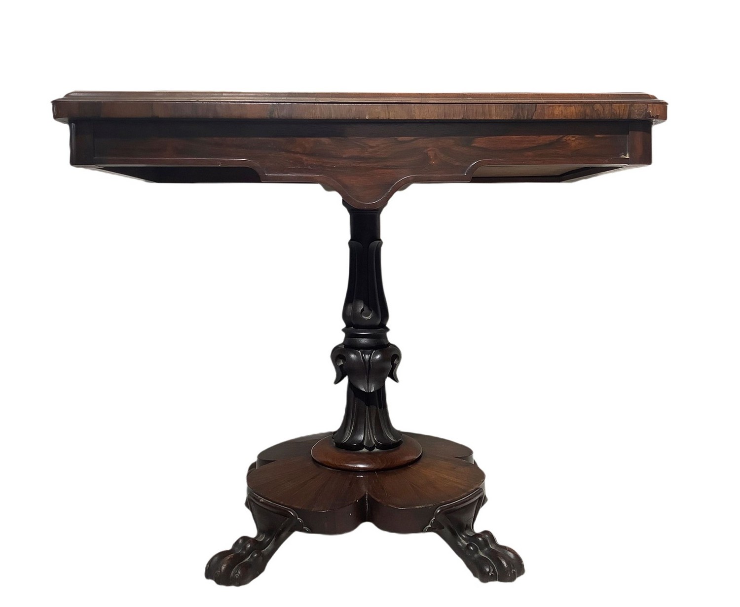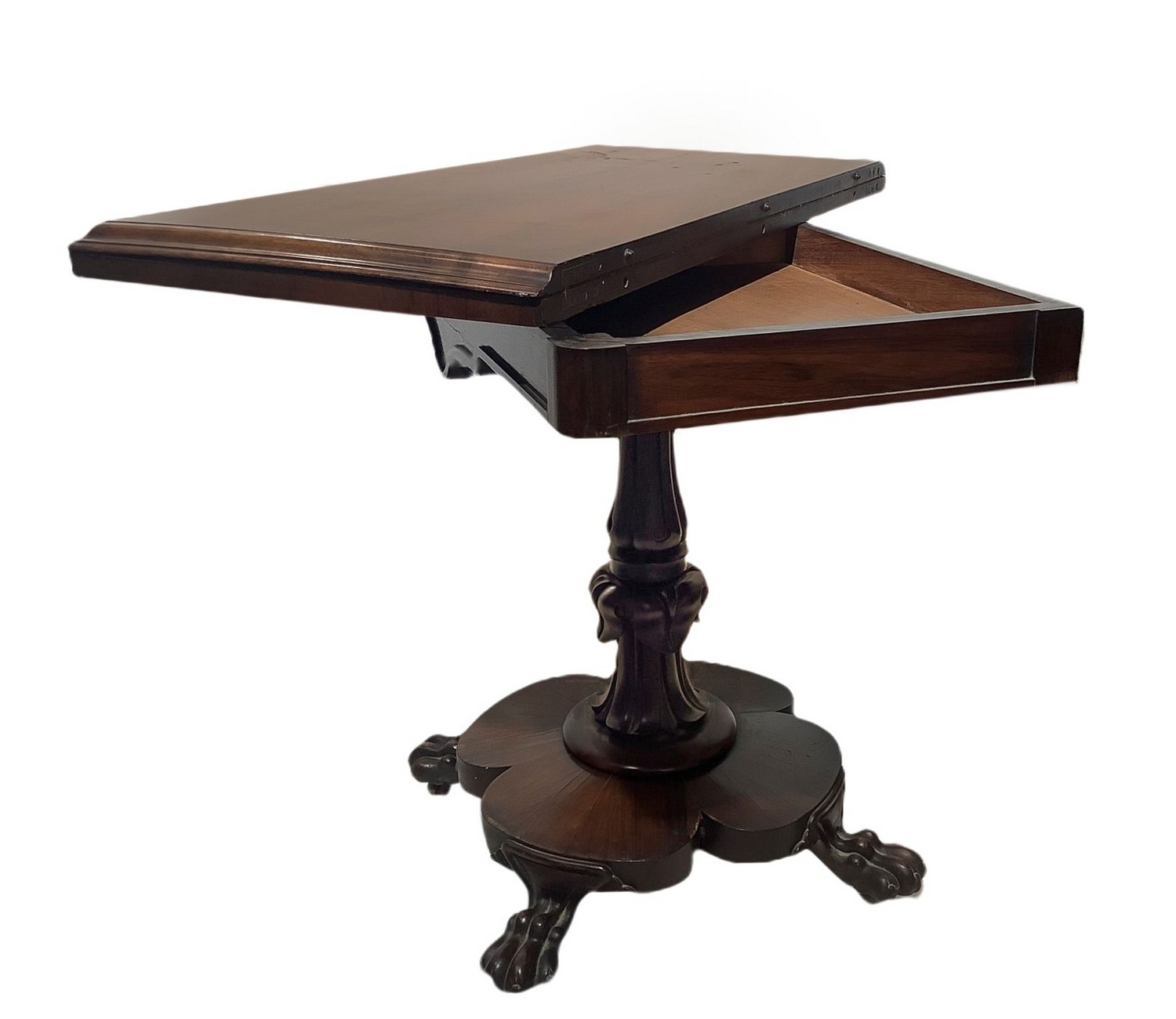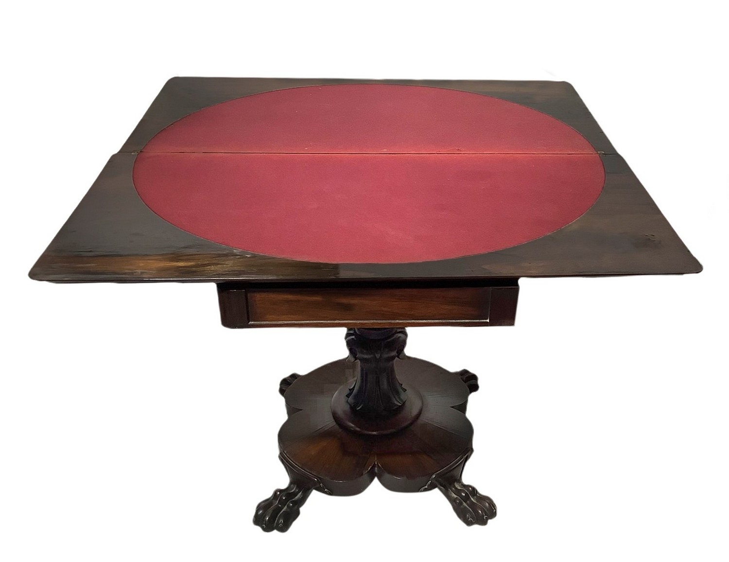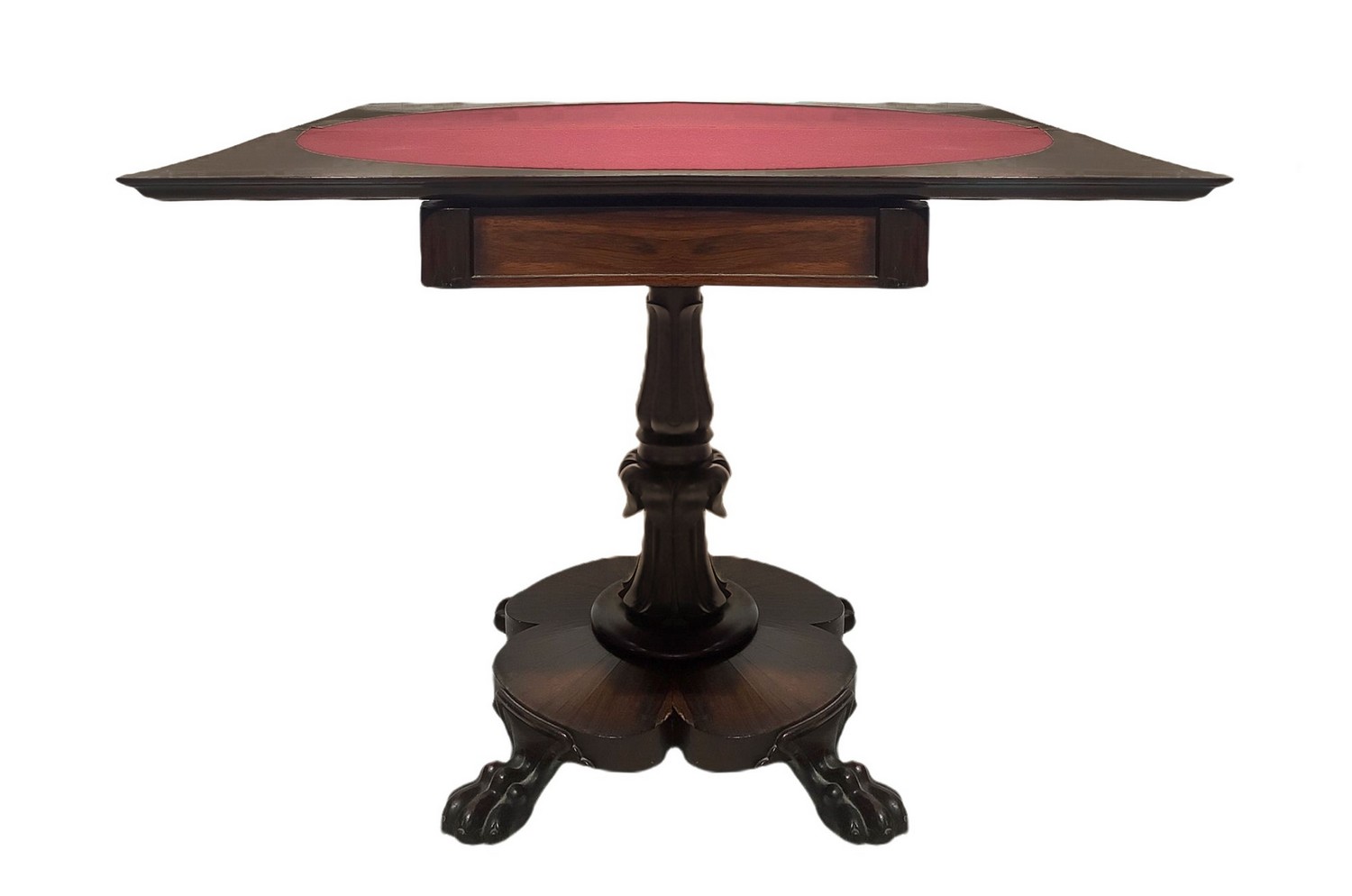Tavolo da giuoco. In legno di palissandro, base a quadrifoglio con piedi leonini, piano aribile a ribalta, interno con panno bordeaux H 75x82 cm, profondità 46/92 cm, XIX secolo
