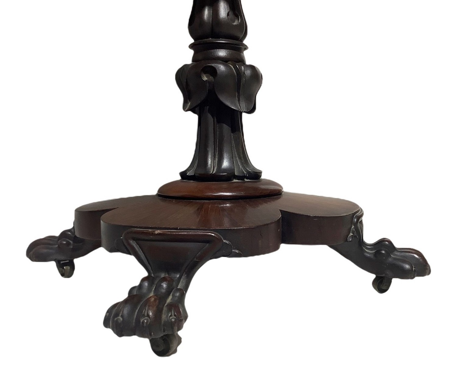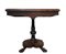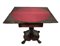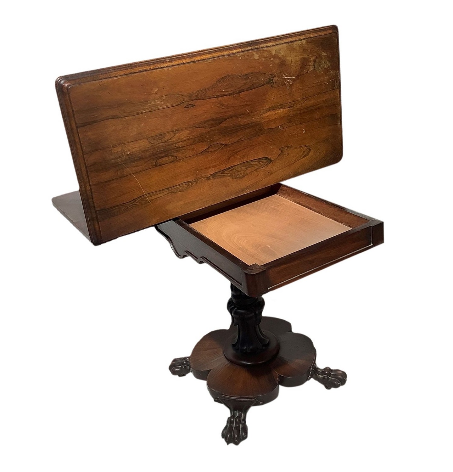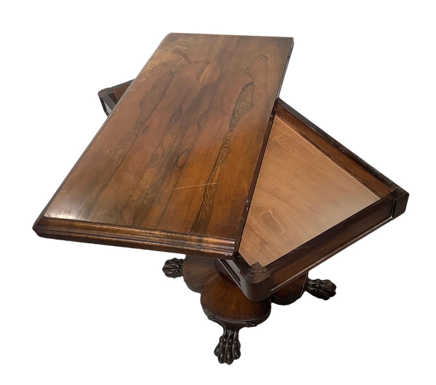 Tavolo da giuoco. In legno di palissandro, base a quadrifoglio con piedi leonini, piano aribile a ribalta, interno con panno bordeaux H 75x82 cm, profondità 46/92 cm, XIX secolo