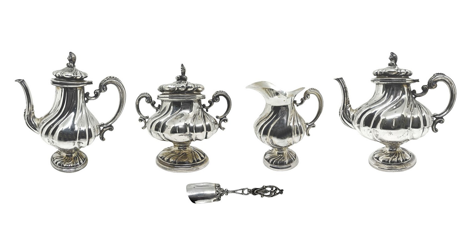 Servizio in argento, composto da teiera, caffettiera, lattiera, zuccheriera.