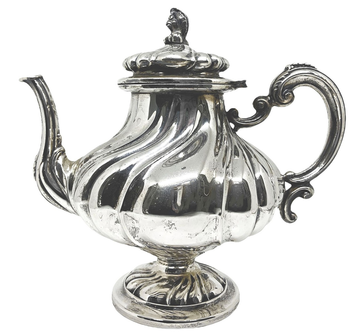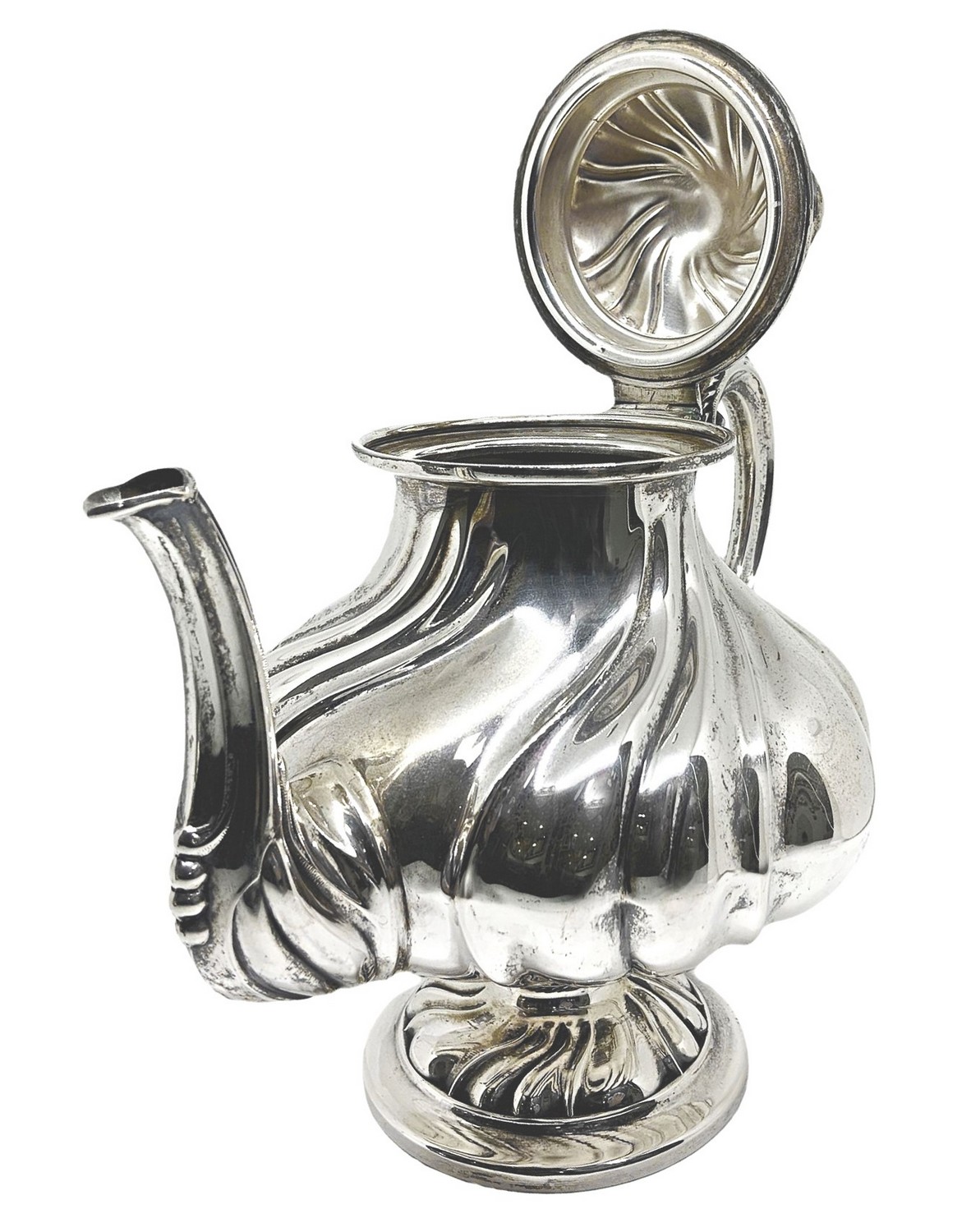 Servizio in argento, composto da teiera, caffettiera, lattiera, zuccheriera.. Kg 1143. Lattiera 136 gr, caffettiera gr 346, teiera gr 415, zuccheriera con cucchiaino 246