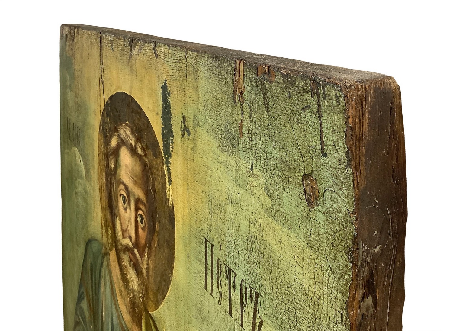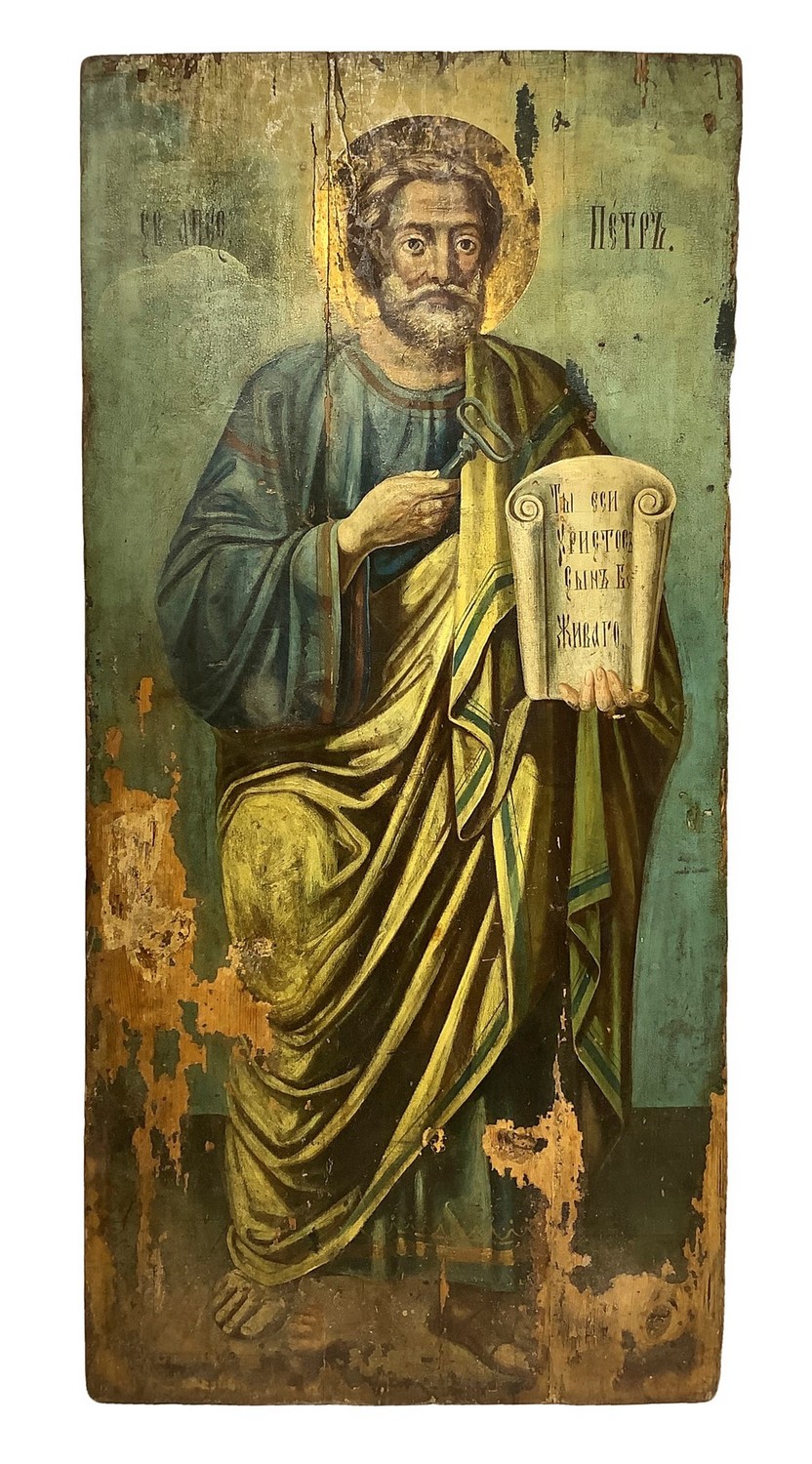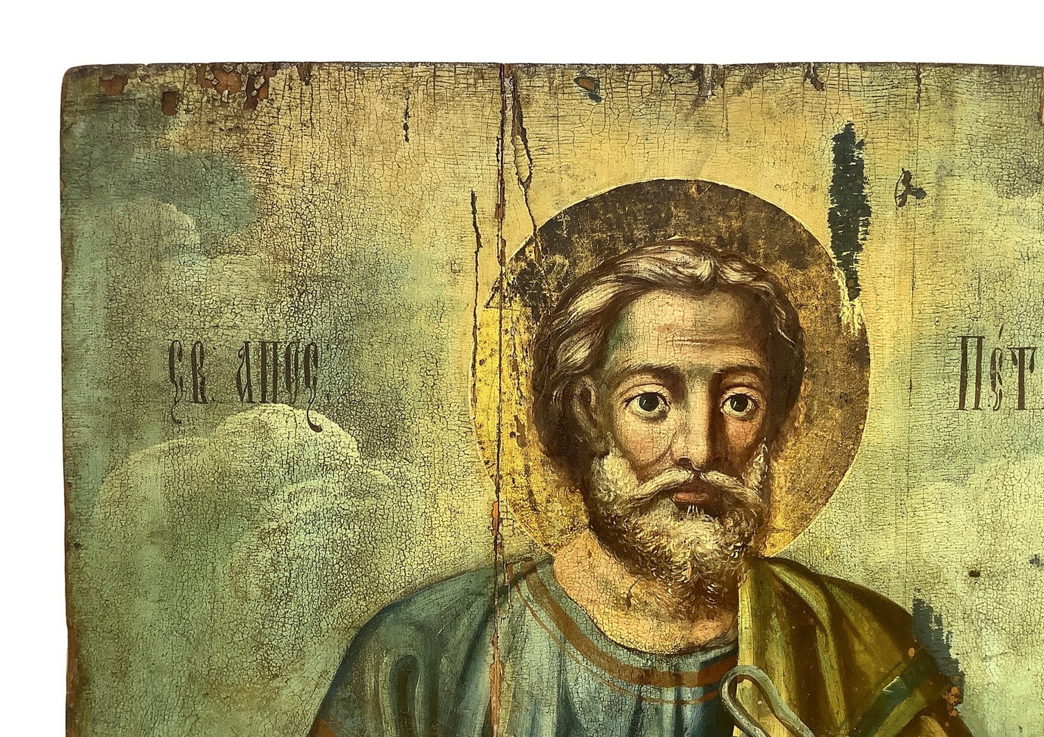 San Pietro Apostolo. Il santo - identificato in San Pietro per la presenza del suo attributo, la chiave, tenuta nella mano destra e per l’iscrizione in alto che recita: CB. APOS. PÉTRZ, la cui traduzione significa SAN APOSTOLO PIETRO - è raffigurato stante, con gli occhi sbarrati e fissi, mettendo in tal senso in risalto la sua natura spirituale. Nella mano sinistra, invece, egli regge un cartiglio di colore bianco contenente una formula, che tradotta rivela: TU SEI IL FIGLIO DEL DIO VIVENTE.