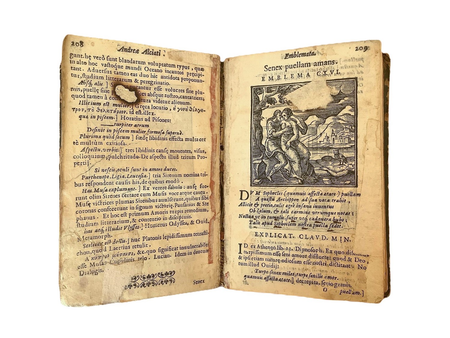 EMBLEMATA. Cum immaginibus plerique restitutis ad mentem Auctoris. Adiecta compendiosa explicazione Claudijs Minois Divionensis, et notulis extemporarijs Laurentijs Pignorij Patavini.