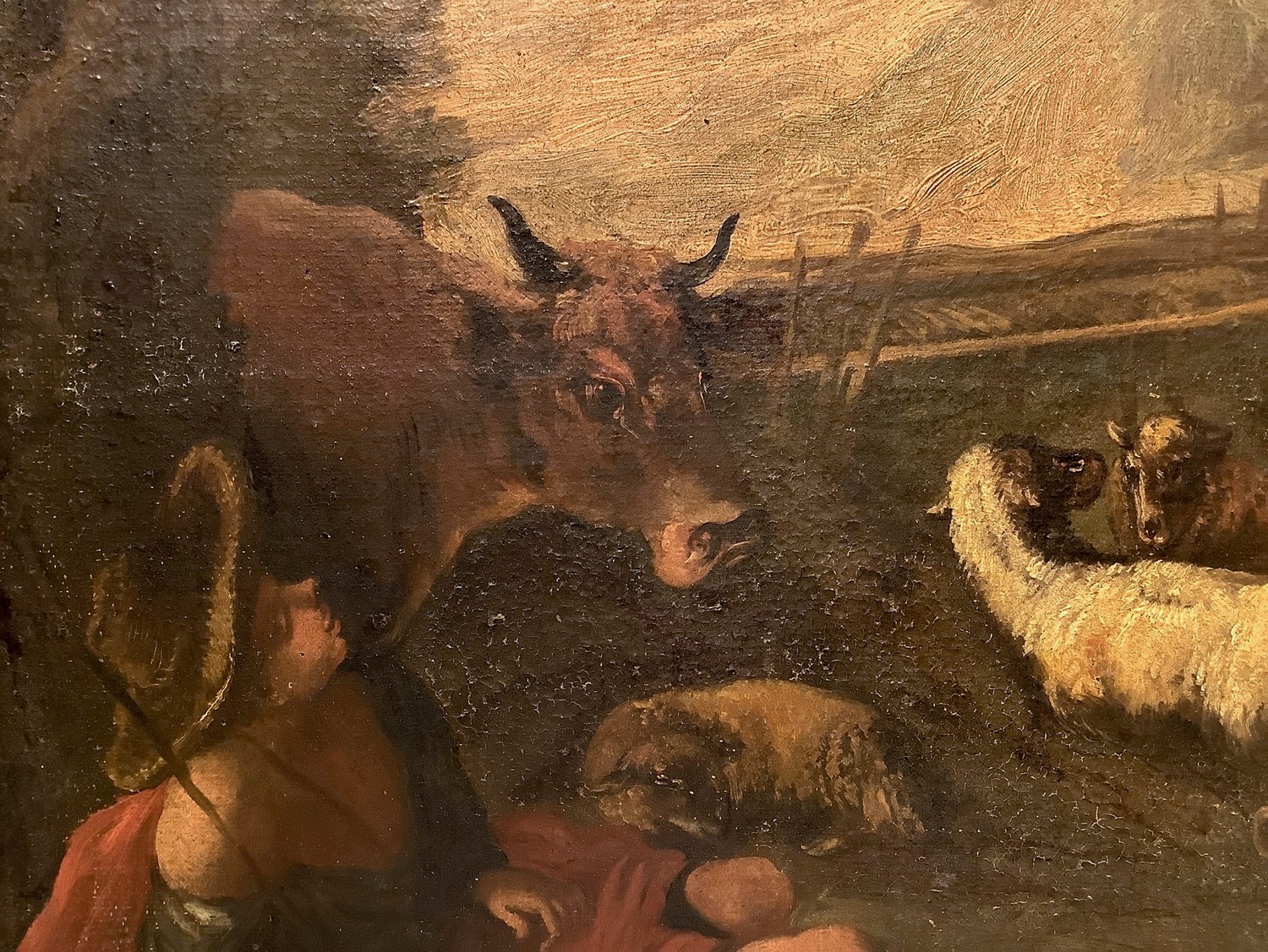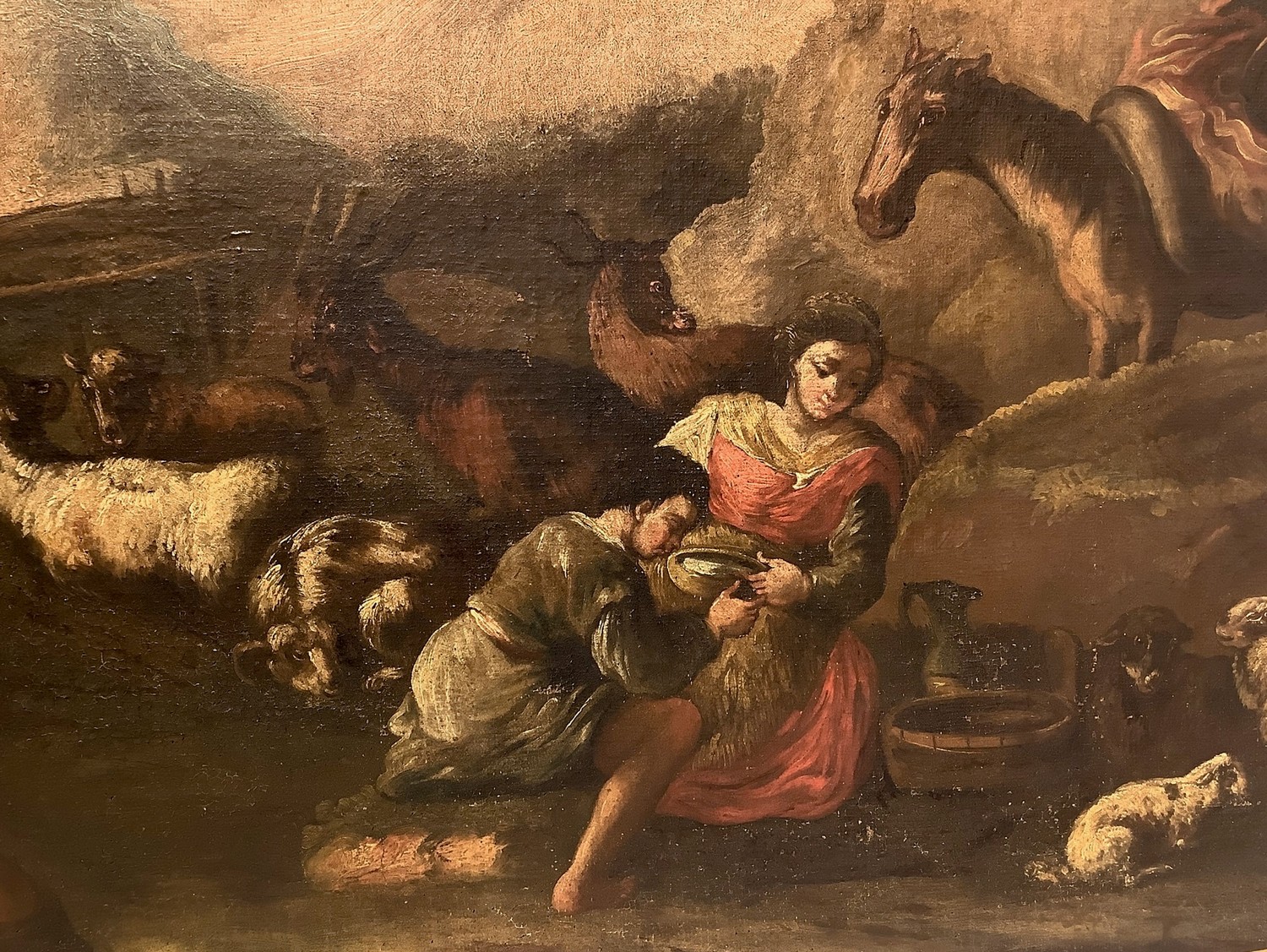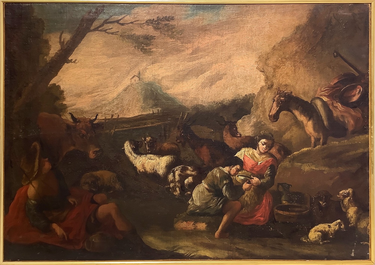 Scena agreste con personaggi e armenti. Dipinto ad olio su tela 68x98 cm fine XVI secolo (bottega di) [Jacopo da Ponte] Jacopo Bassano Bassano del Grappa, 1515-1592