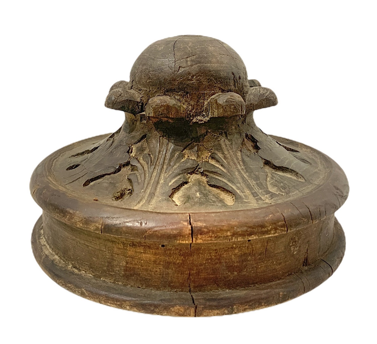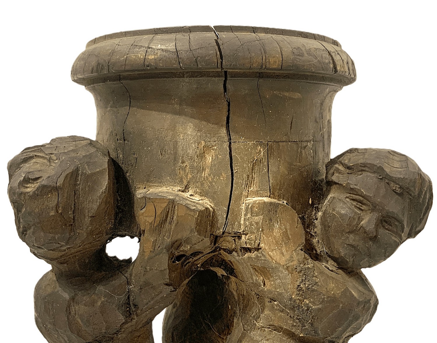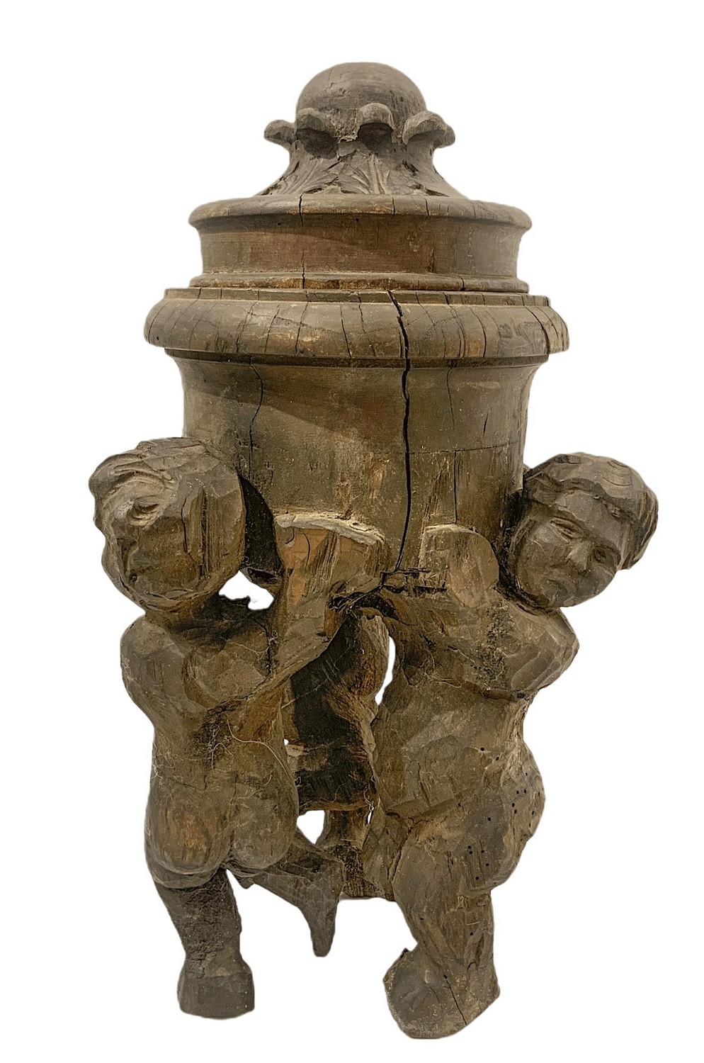 Alzata in legno con tre putti e coperchio, XIX secolo.
