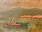 Marina con barca. Timbro Galleria "Le Quattro Stagioni" Olio su compensato 28x37 cm, in cornice 43x52 cm 1900 Renzo Caiazzo XX secolo