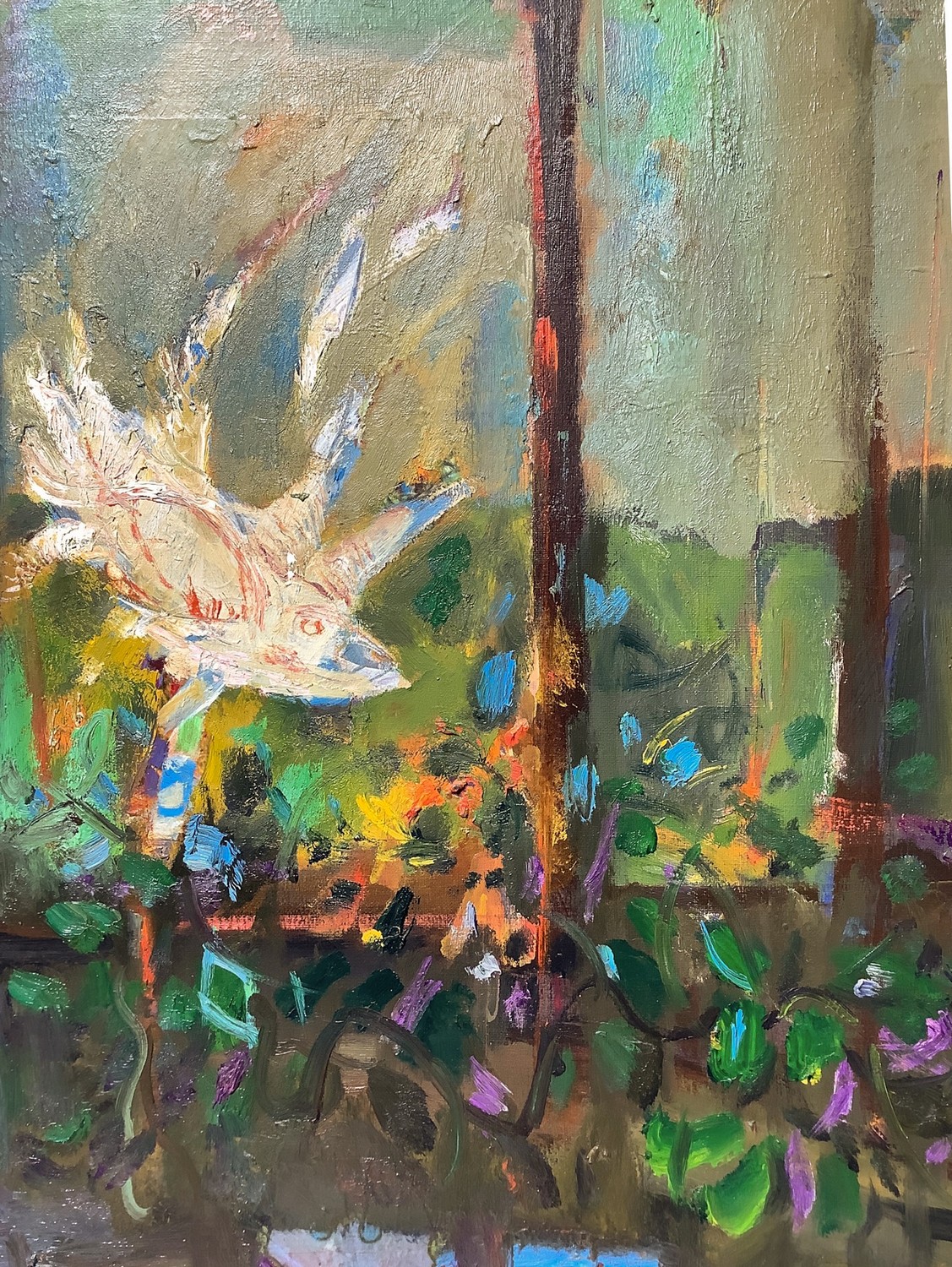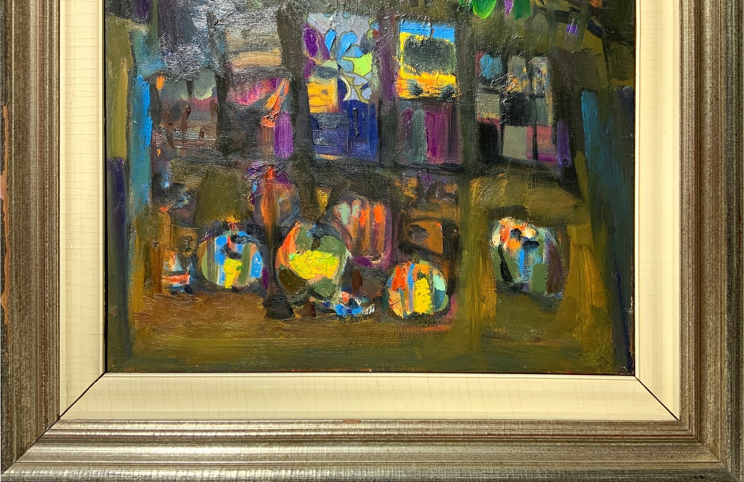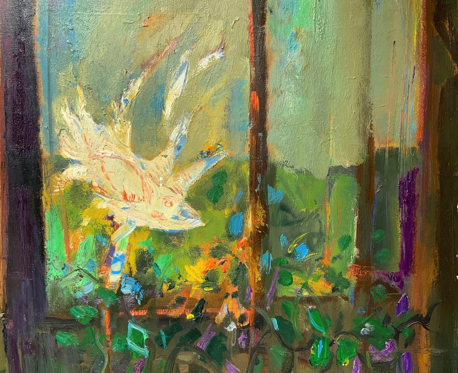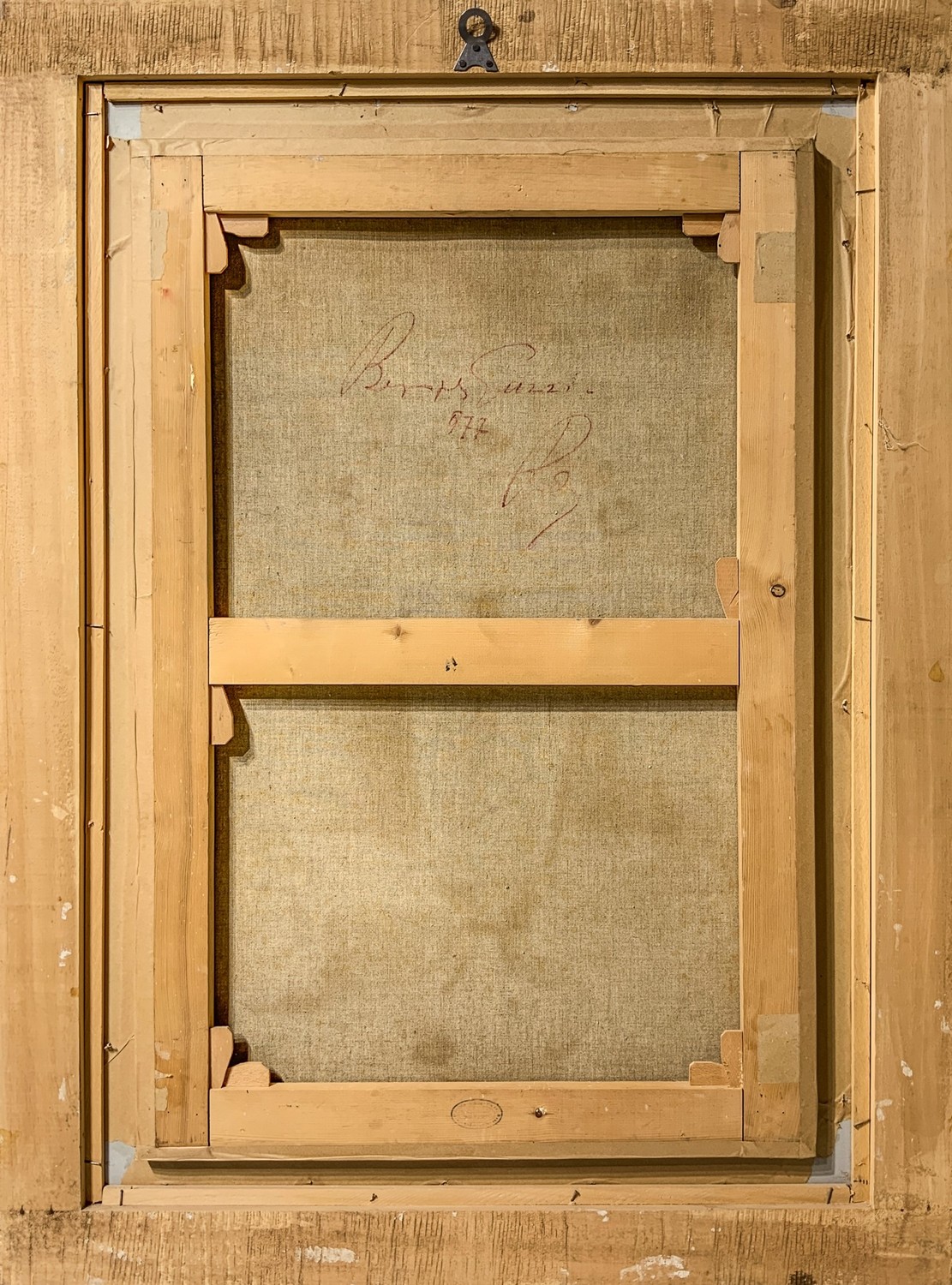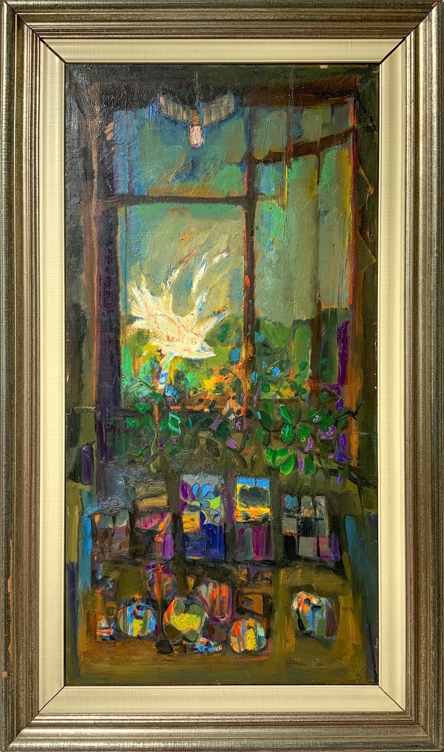 Natura morta con finestra aperta . Firmato e datato sul retro '68, sul retro etichetta "Europa ‘68", "Mostra di Pittura timbro Galleria Cortina D’Ampezzo" Olio 120x60 cm, in cornice 145x85 cm 1967/1968 Aldo Borgonzoni Medicina 1913-Bologna 2004